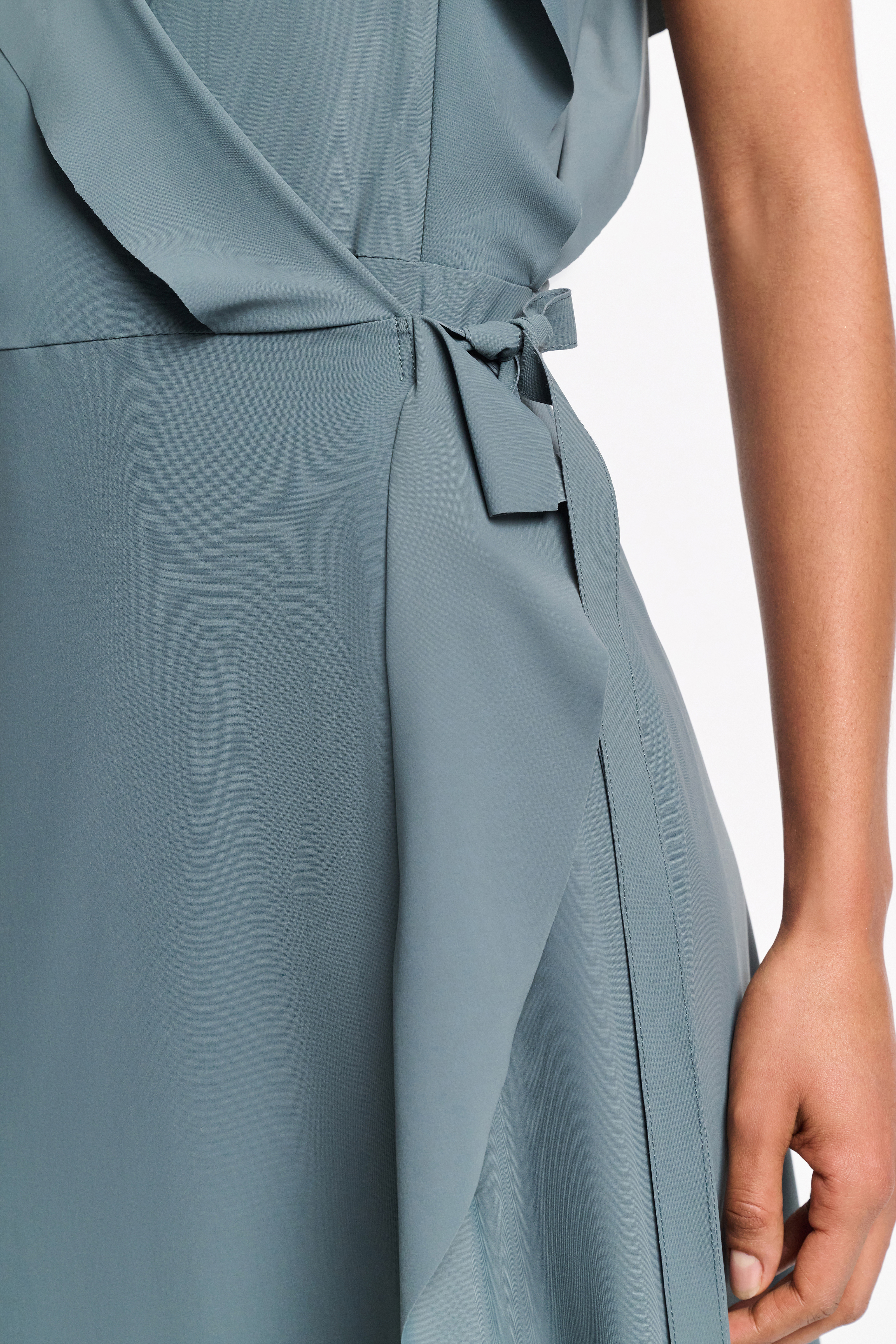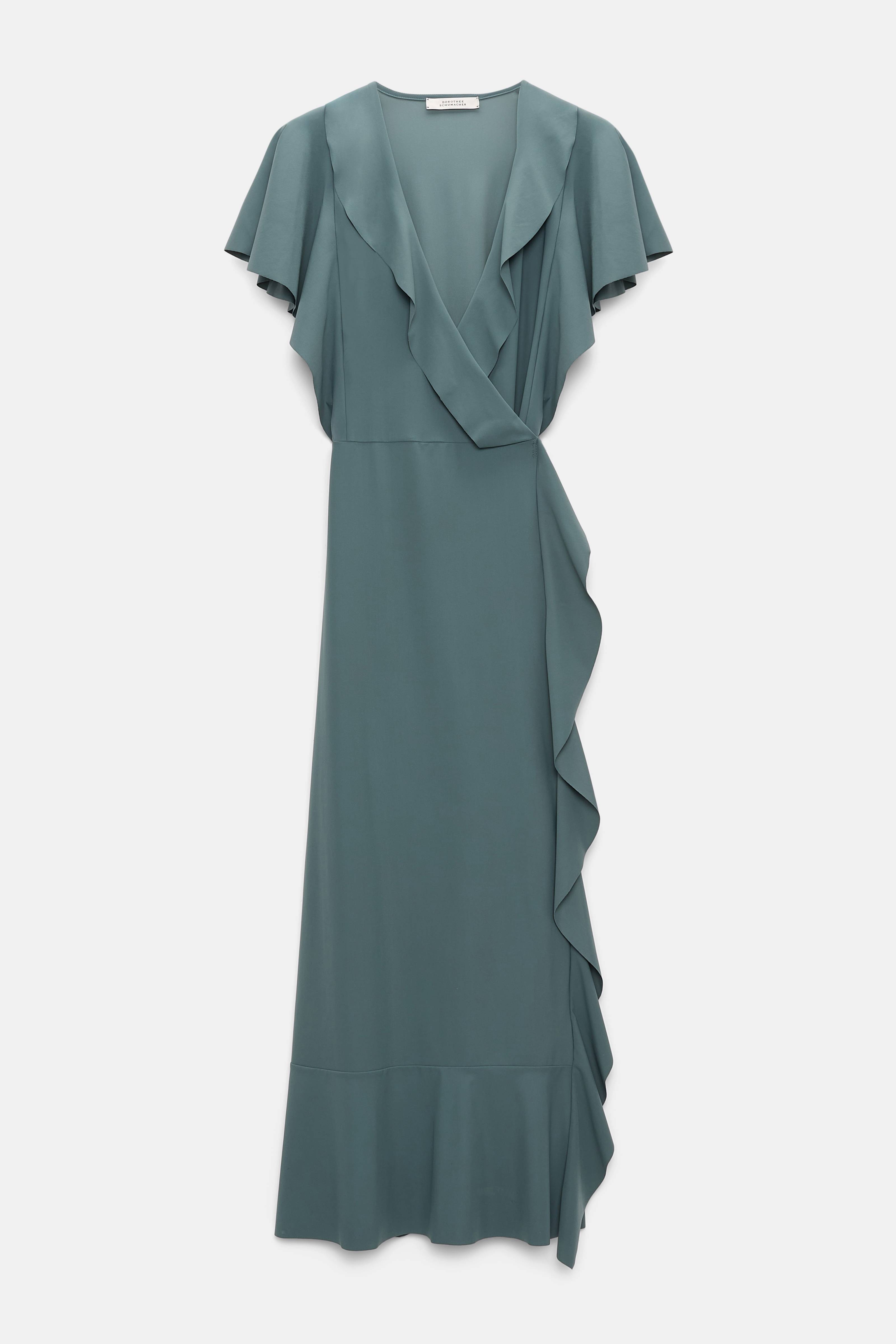 The long dress has a ruffle wrap front and draped ruffle short sleeves.