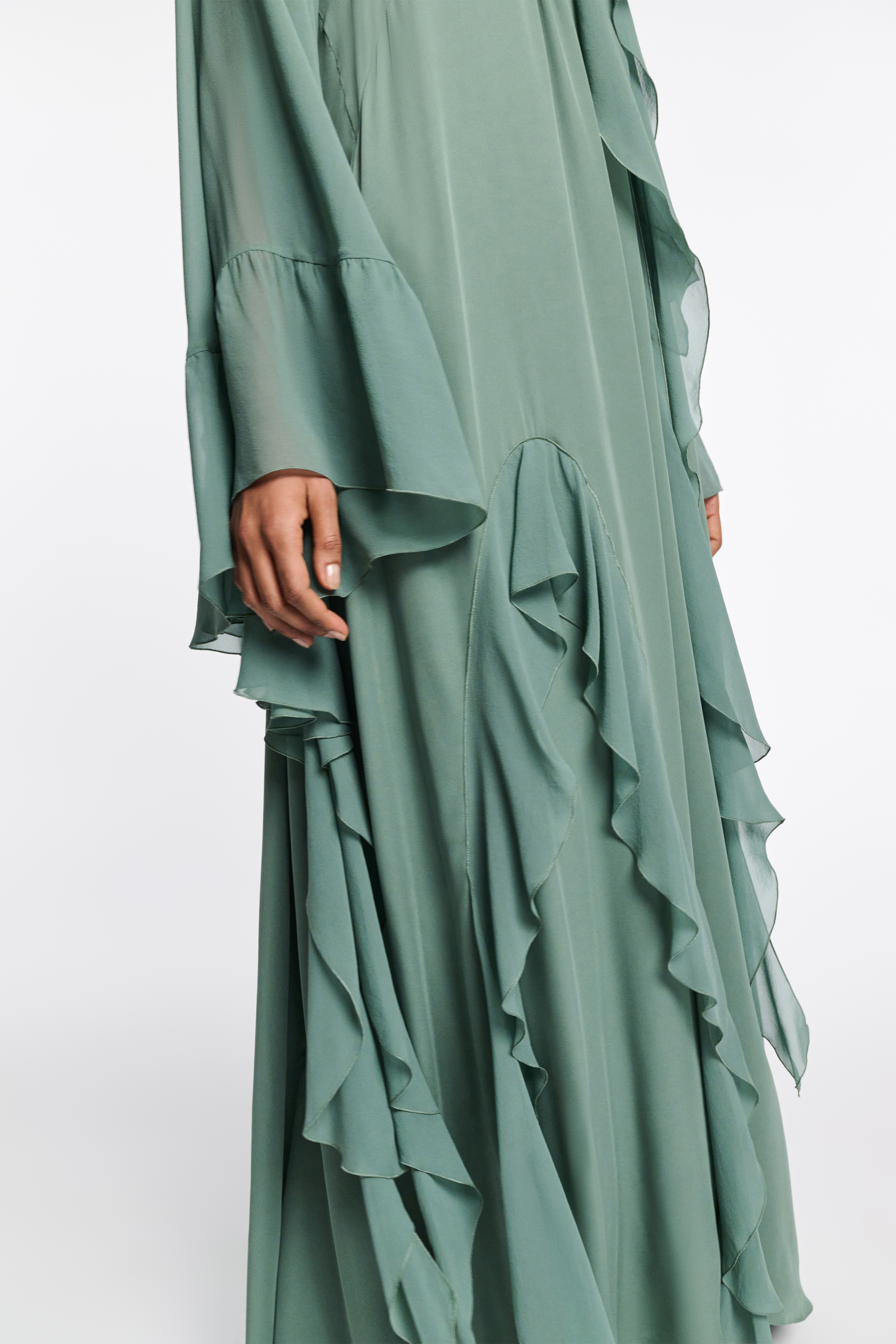 The ruffle maxi dress is made from double- and single silk georgette and comes with a matching scarf.