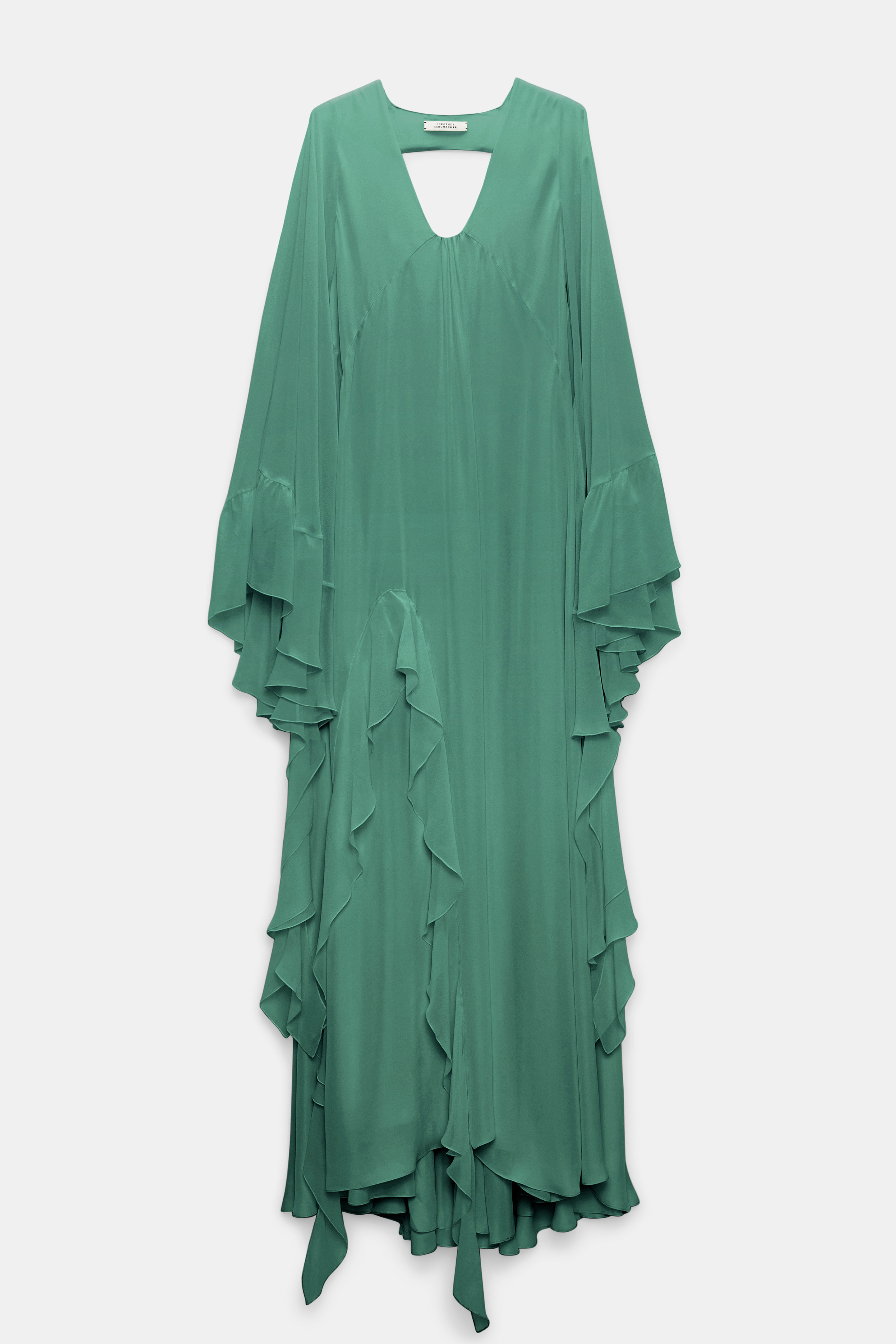 The dress has a low cut back and dramatic caftan sleeves with soft ruffles at the cuffs.