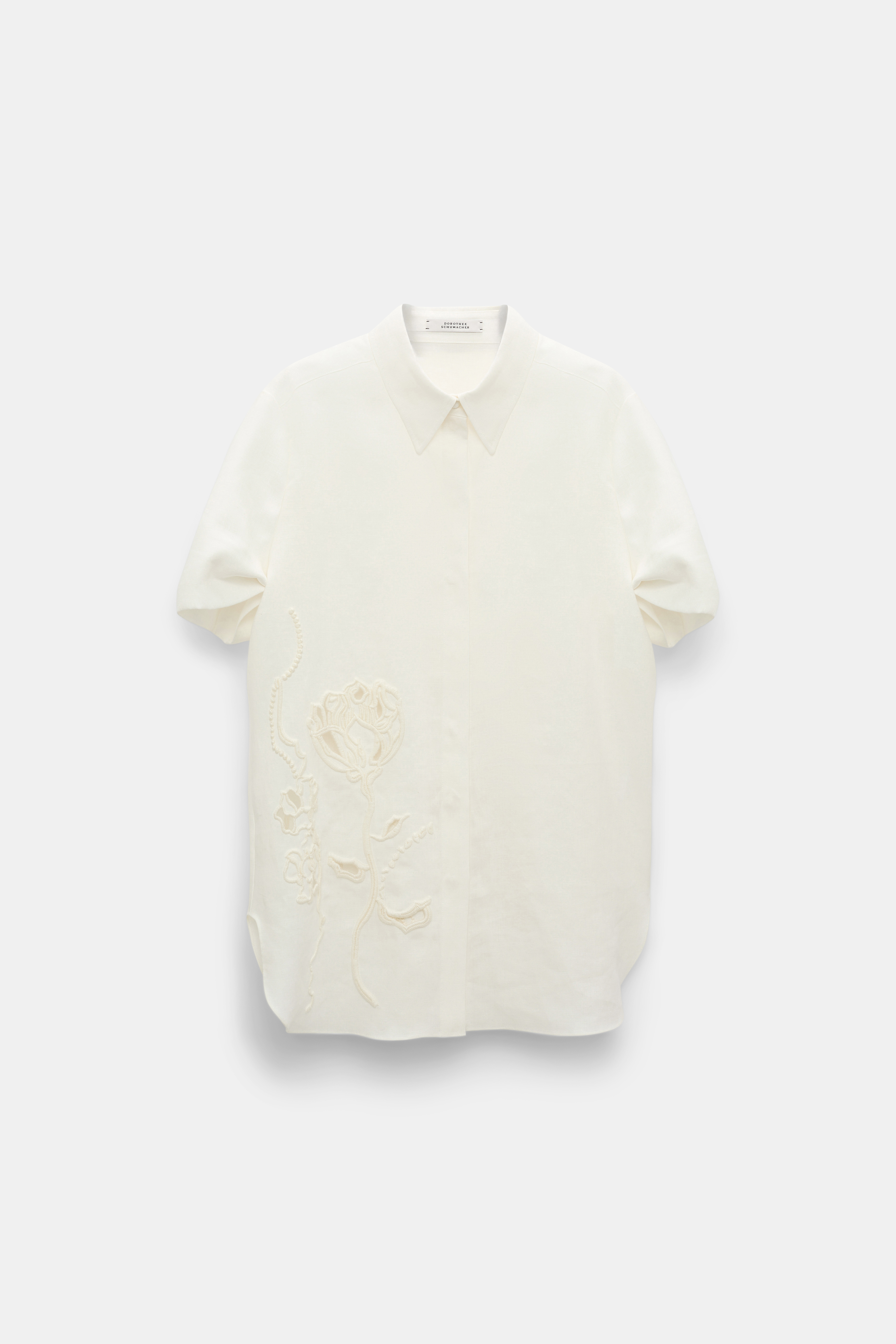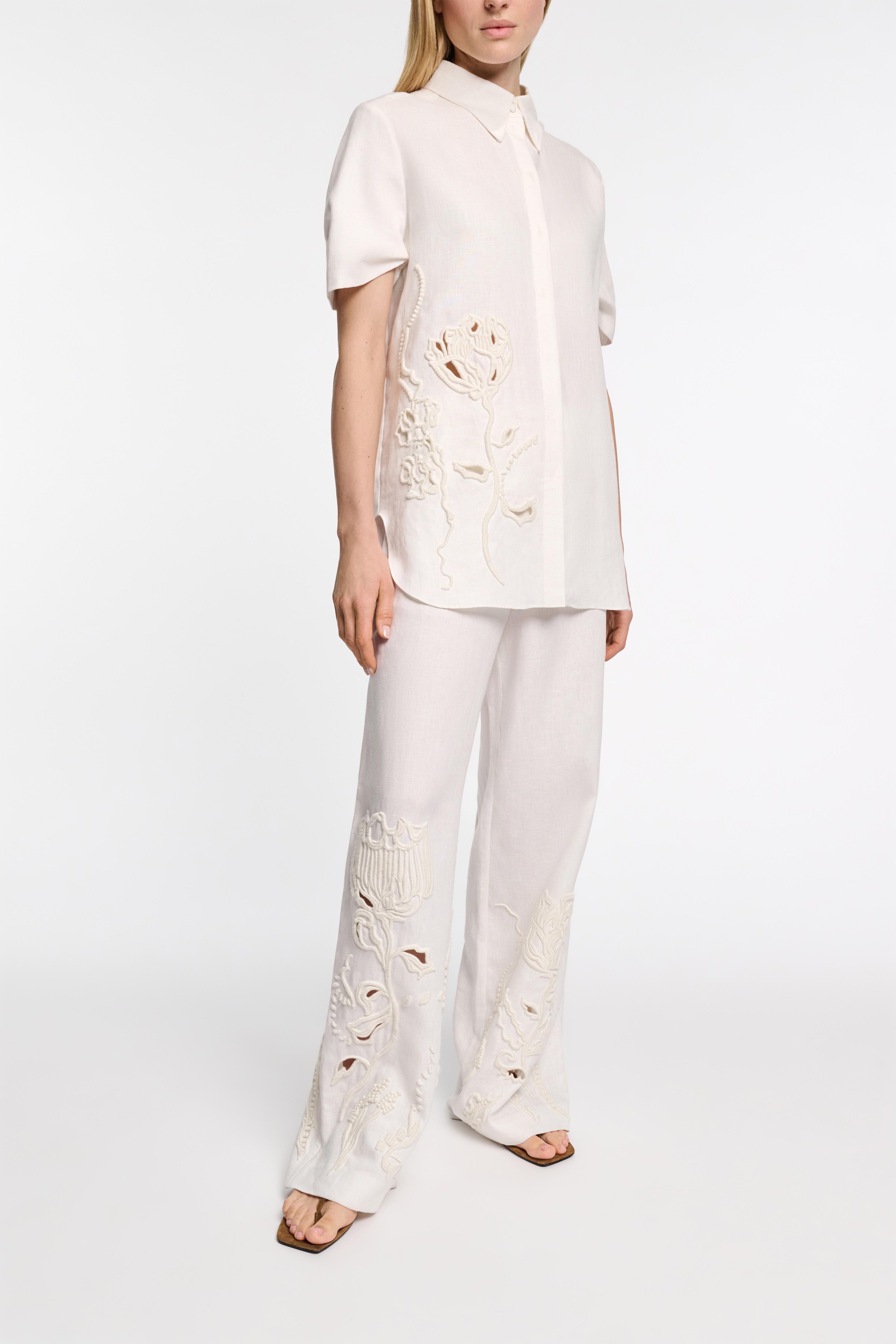 The linen shirt has tonal decorative embroidery and short sleeves with pleat detailing.