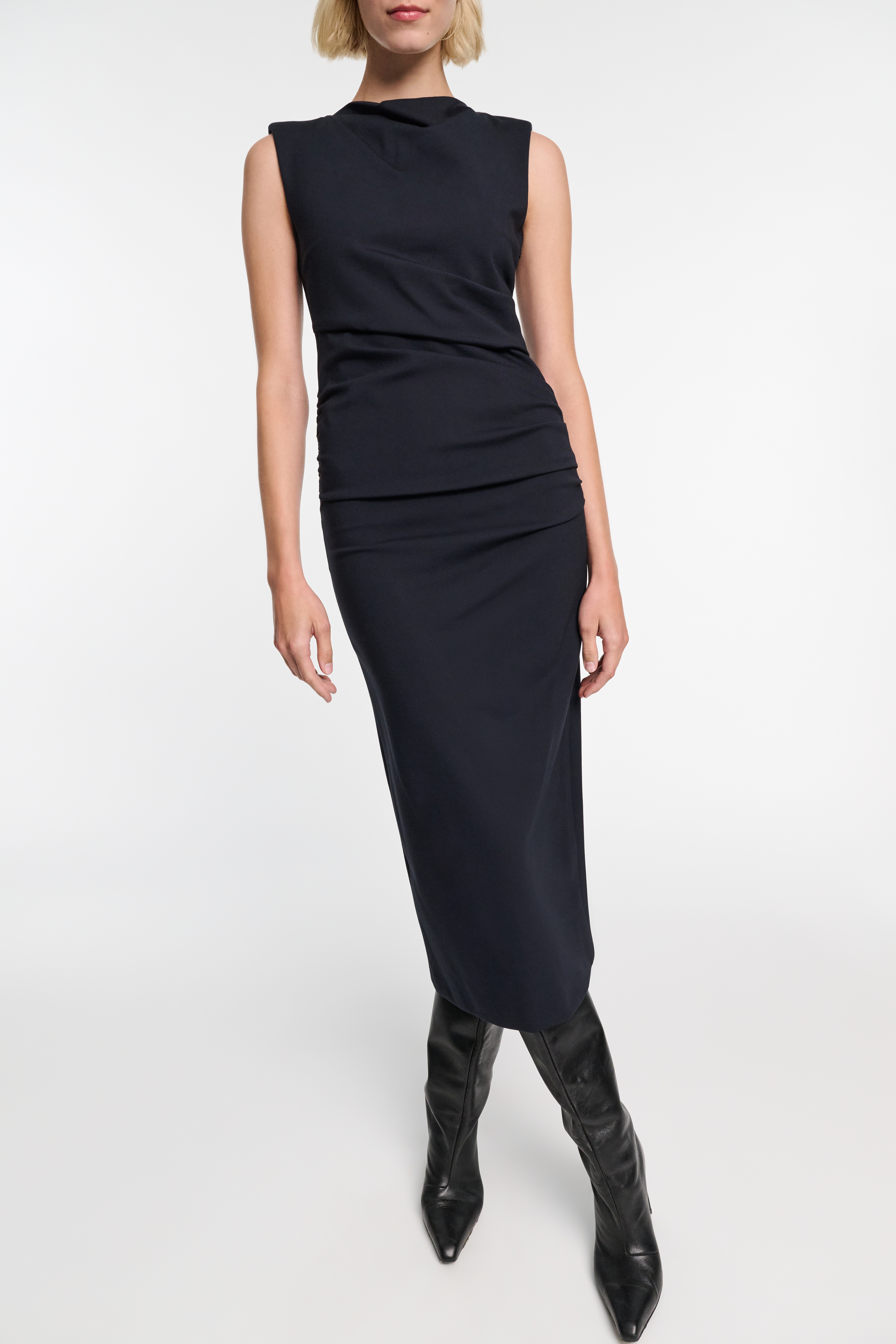 Das Kleid ist aus softem Punto Milano gefertigt und hat eine drapierte Vorderseite.