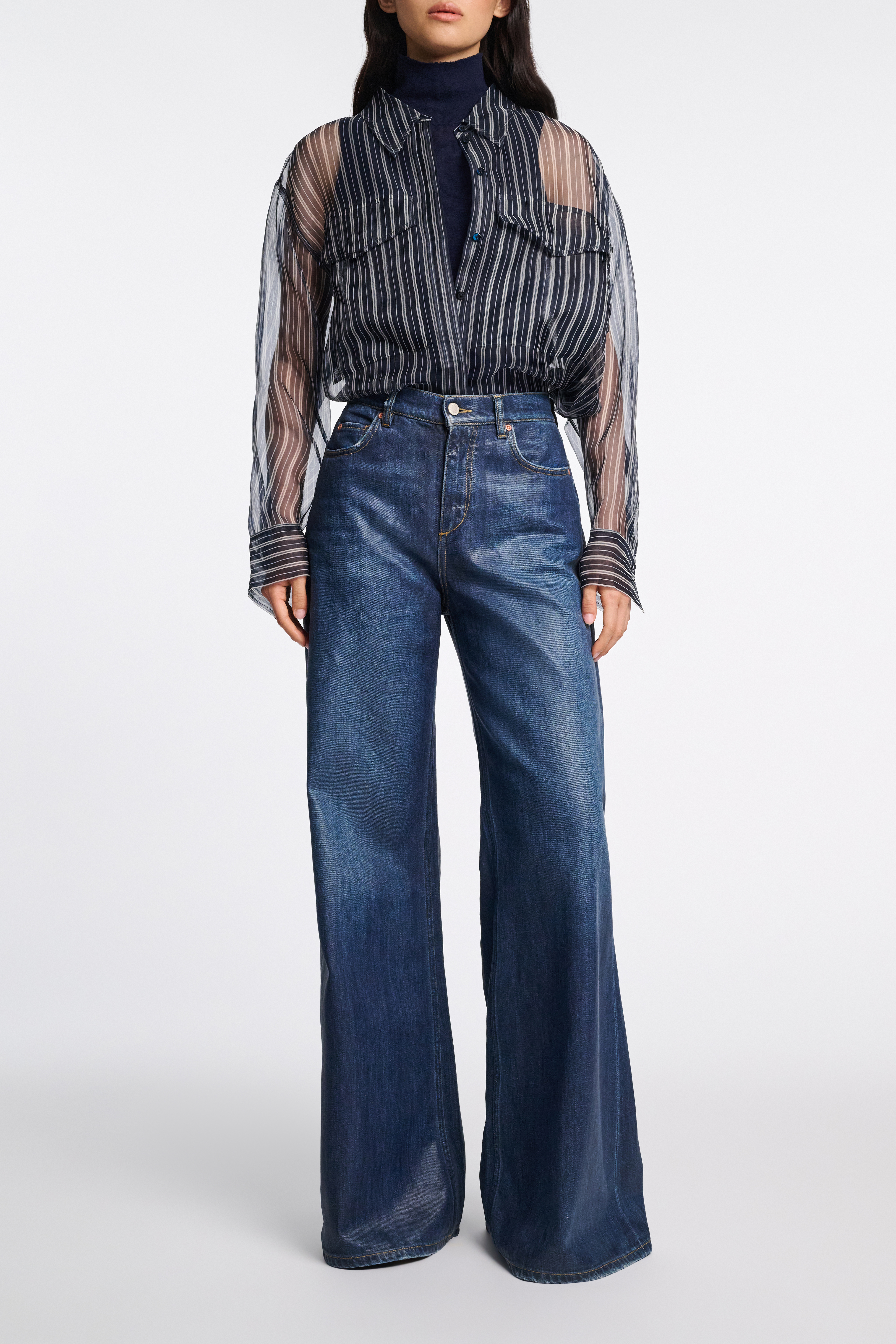 Die Bluse ist oversized geschnitten und hat aufgesetzte Klappentaschen und einen abgerundeten Saum.