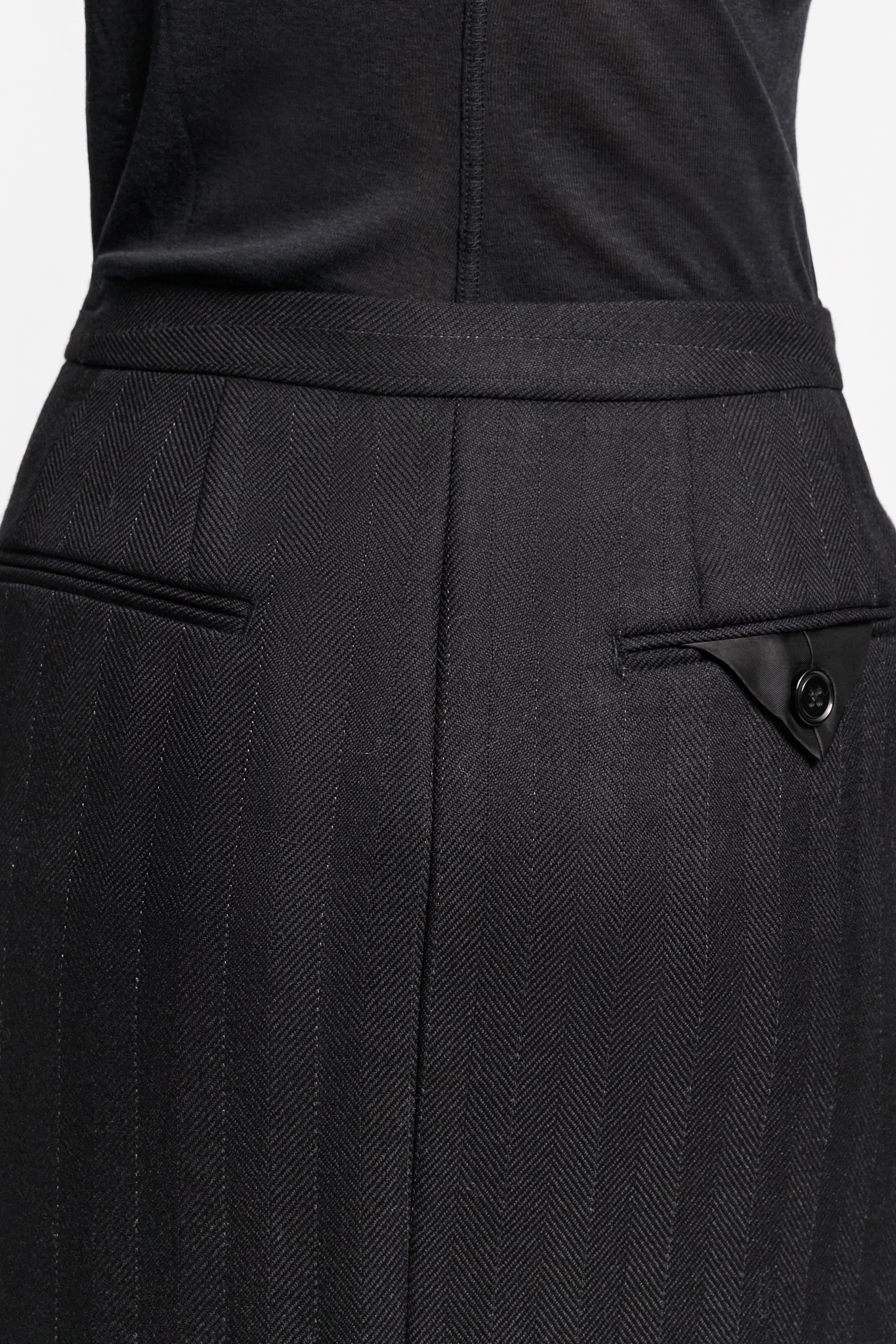 Klassische Nadelstreifen treffen auf Leistentaschen und einen mittigen Slit.
