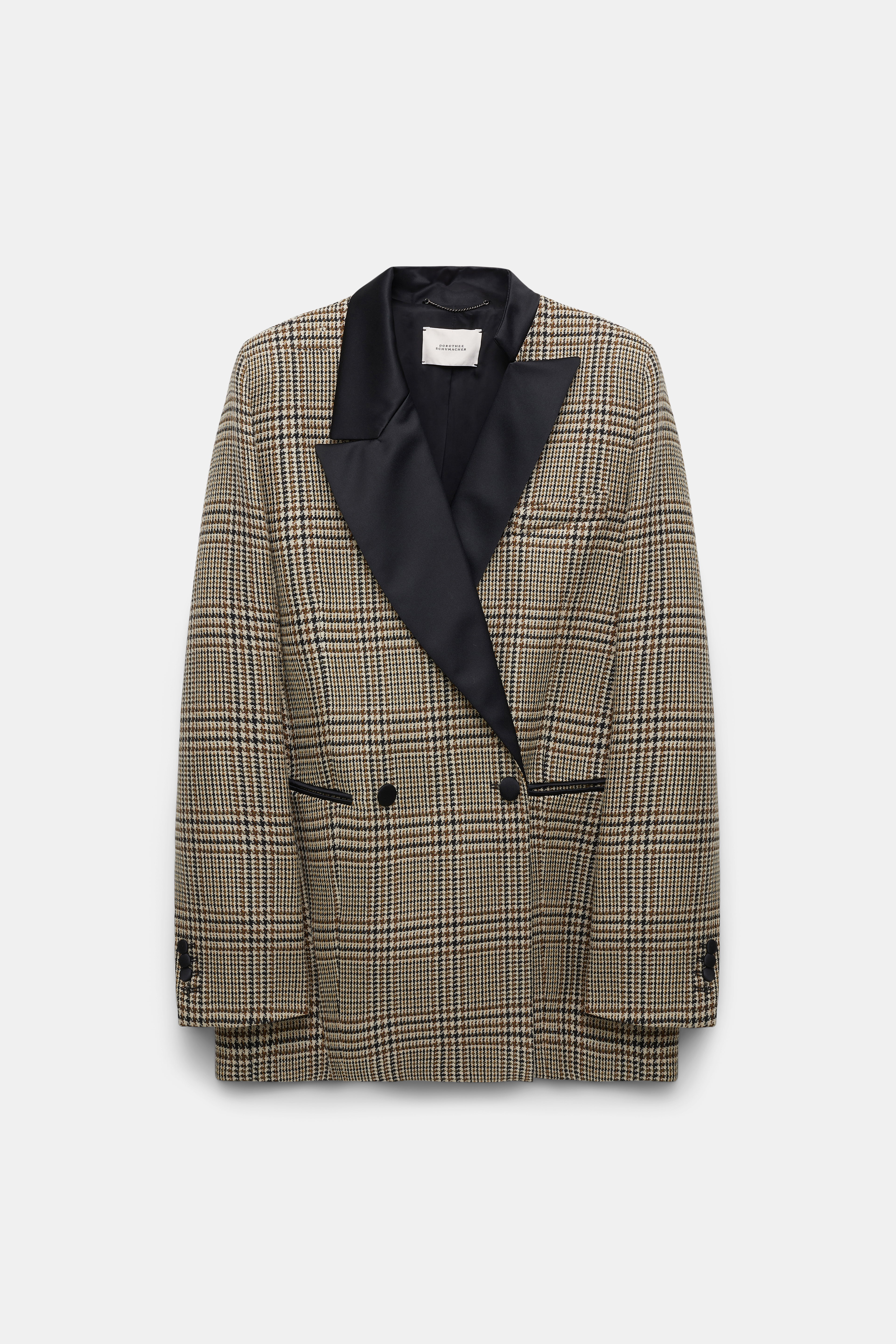 Der Blazer aus Wolle wird durch kontrastierende Satin-Details ausgezeichnet.