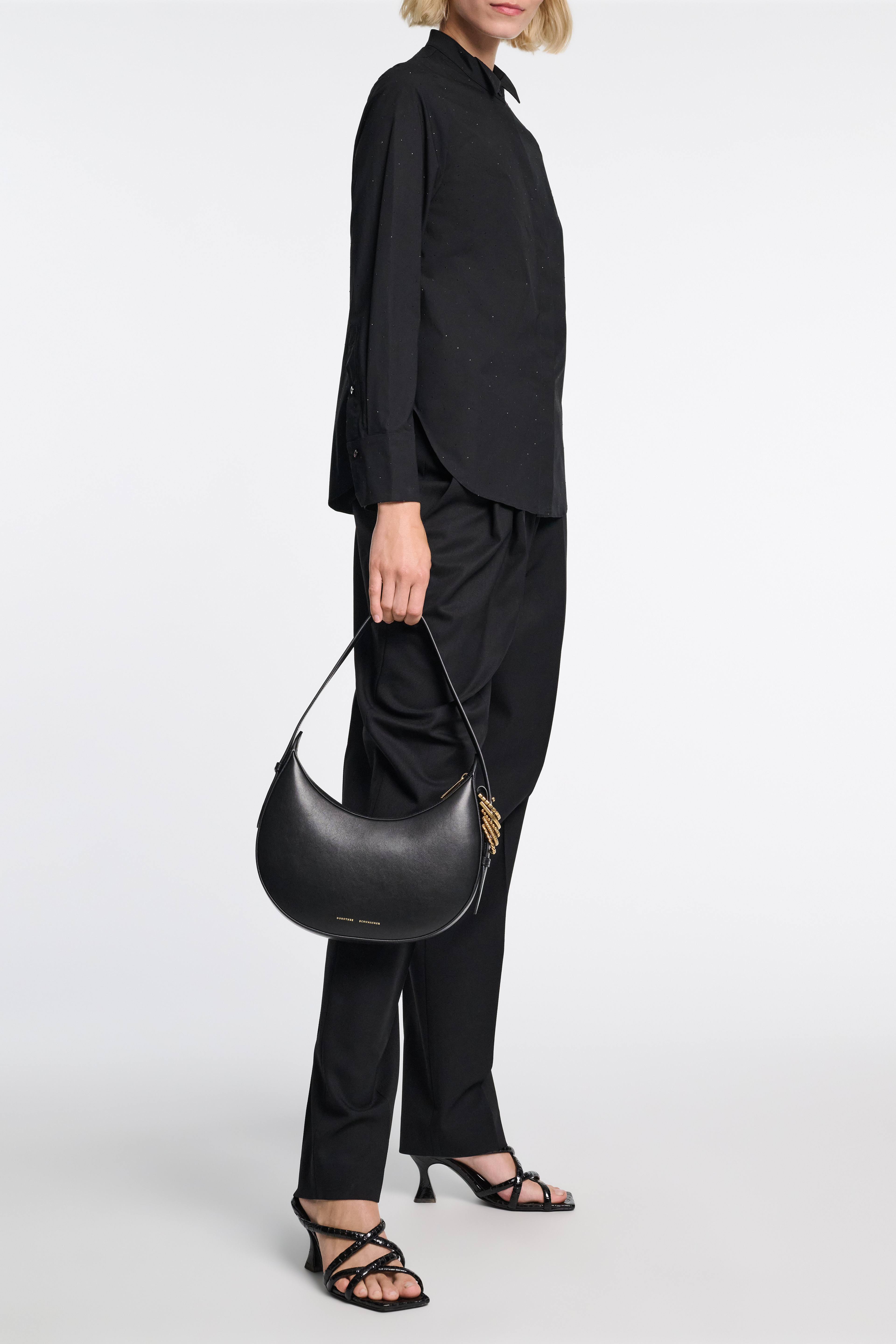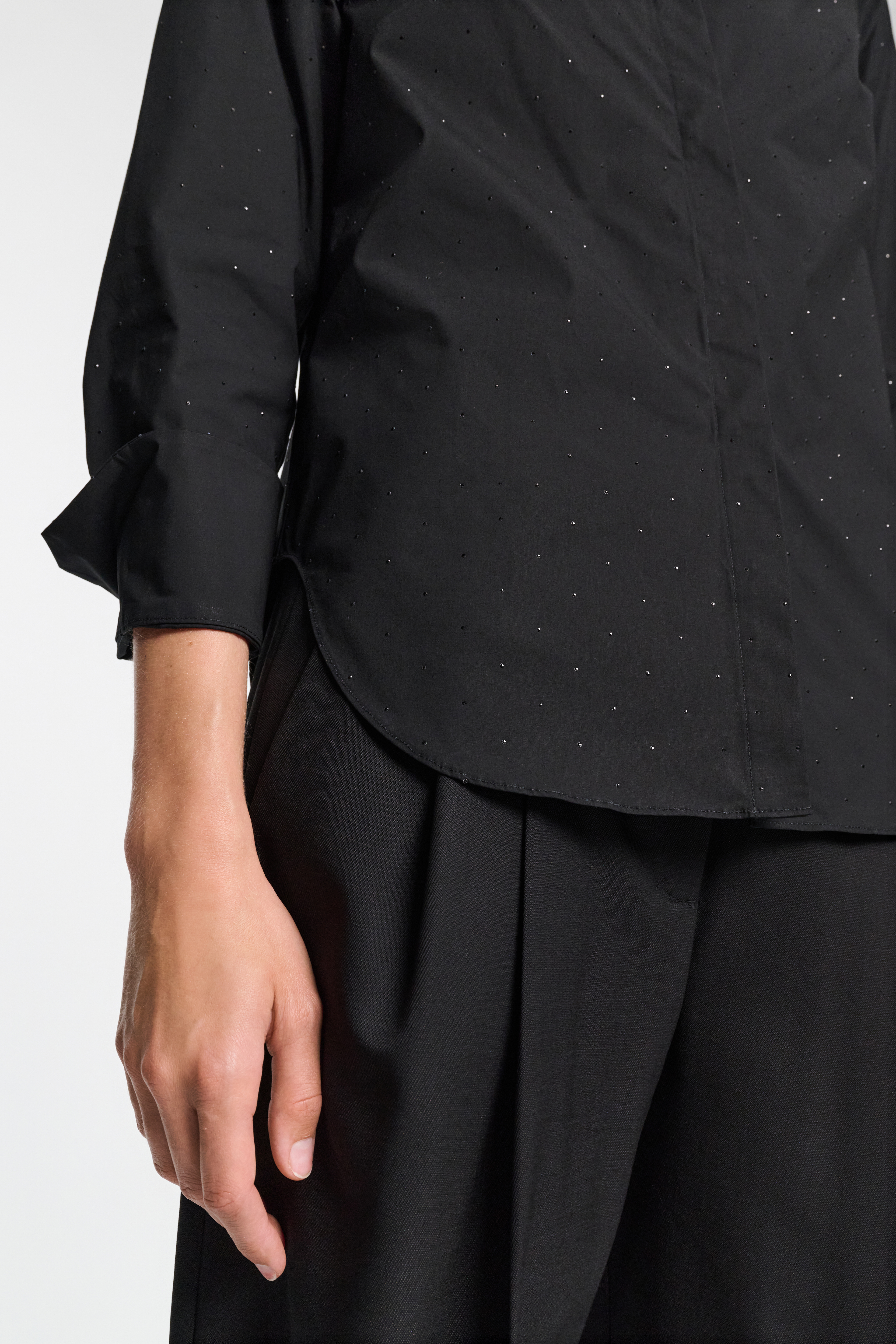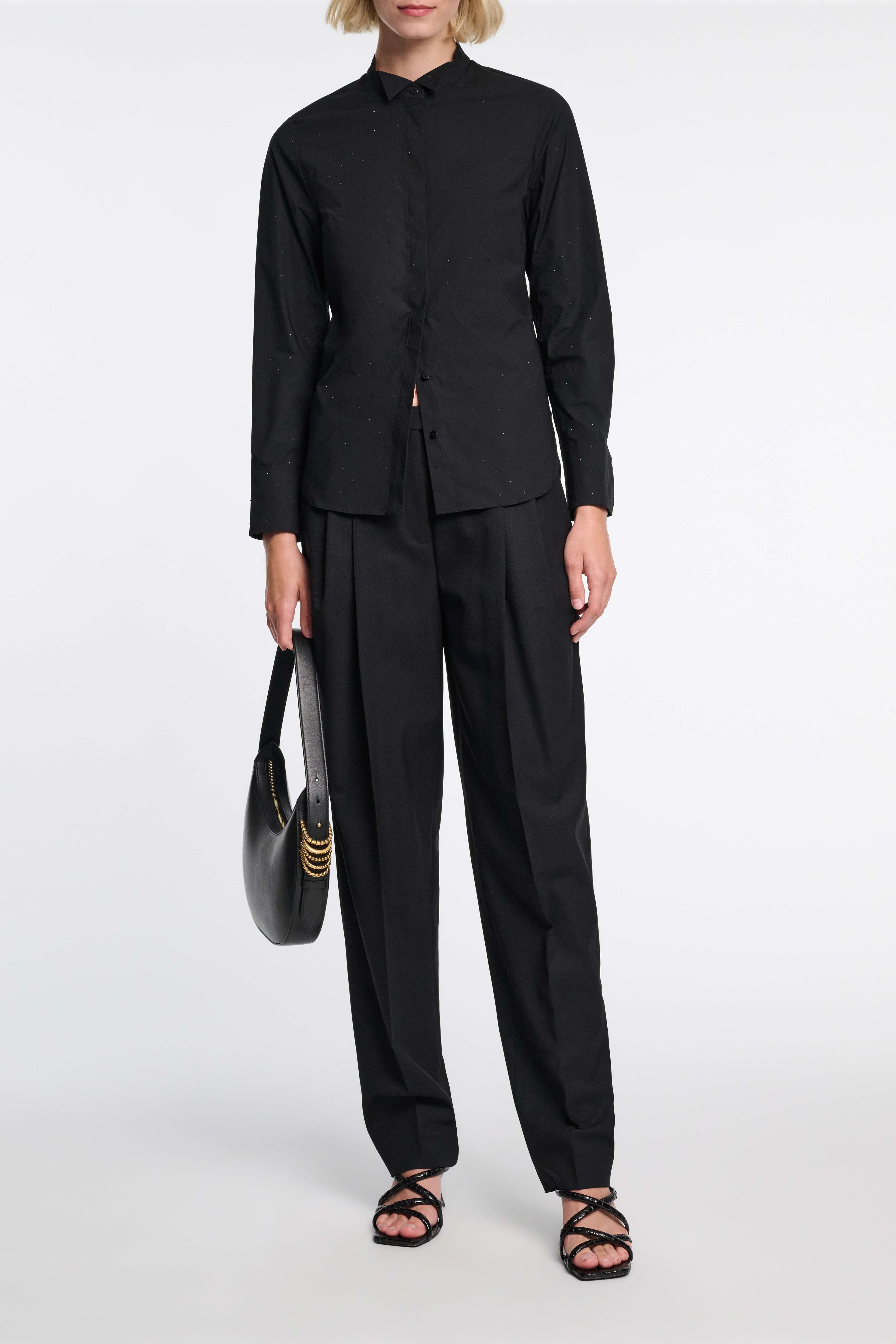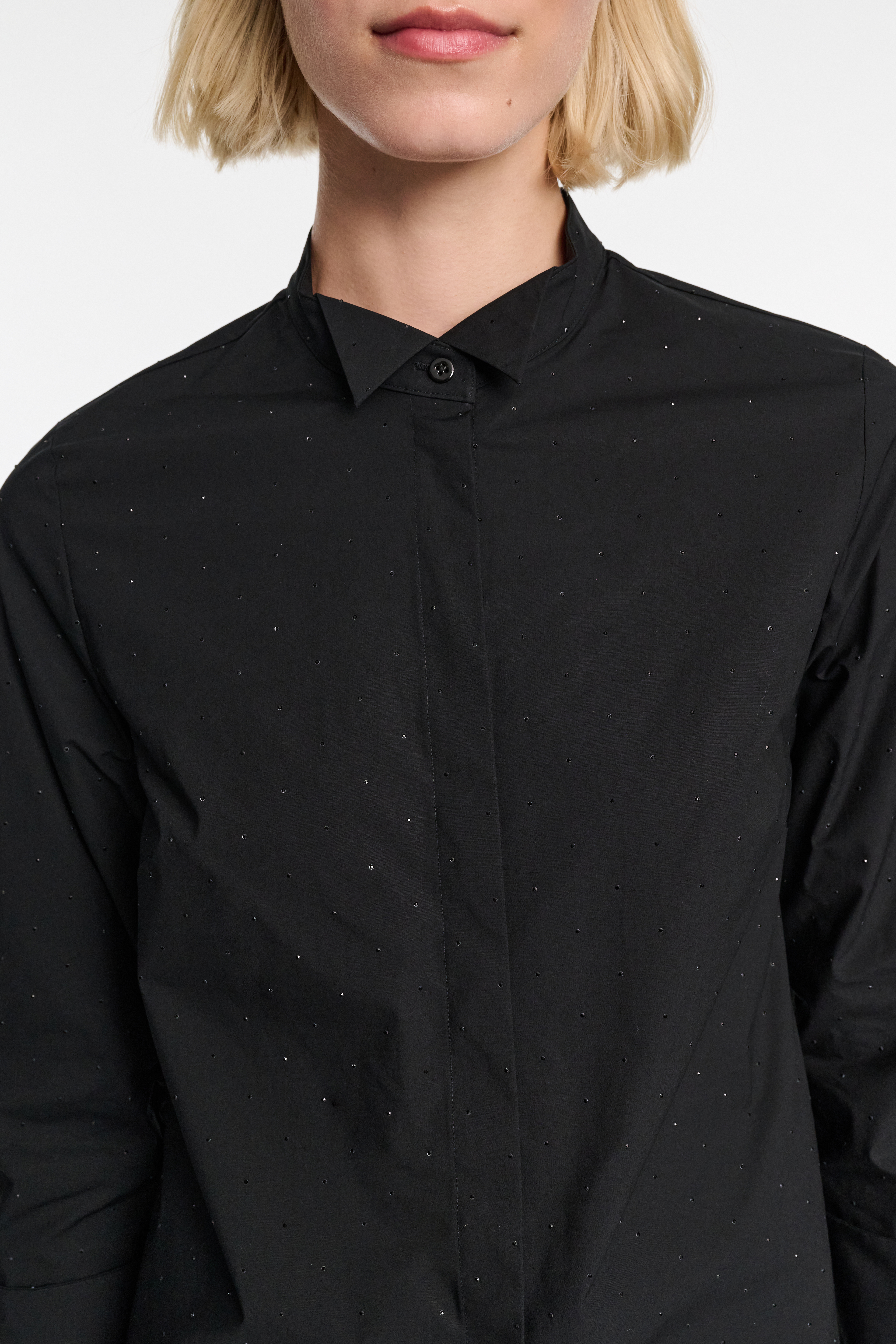 Die Bluse hat einen offenen Stehkragen und sitzt entspannt.