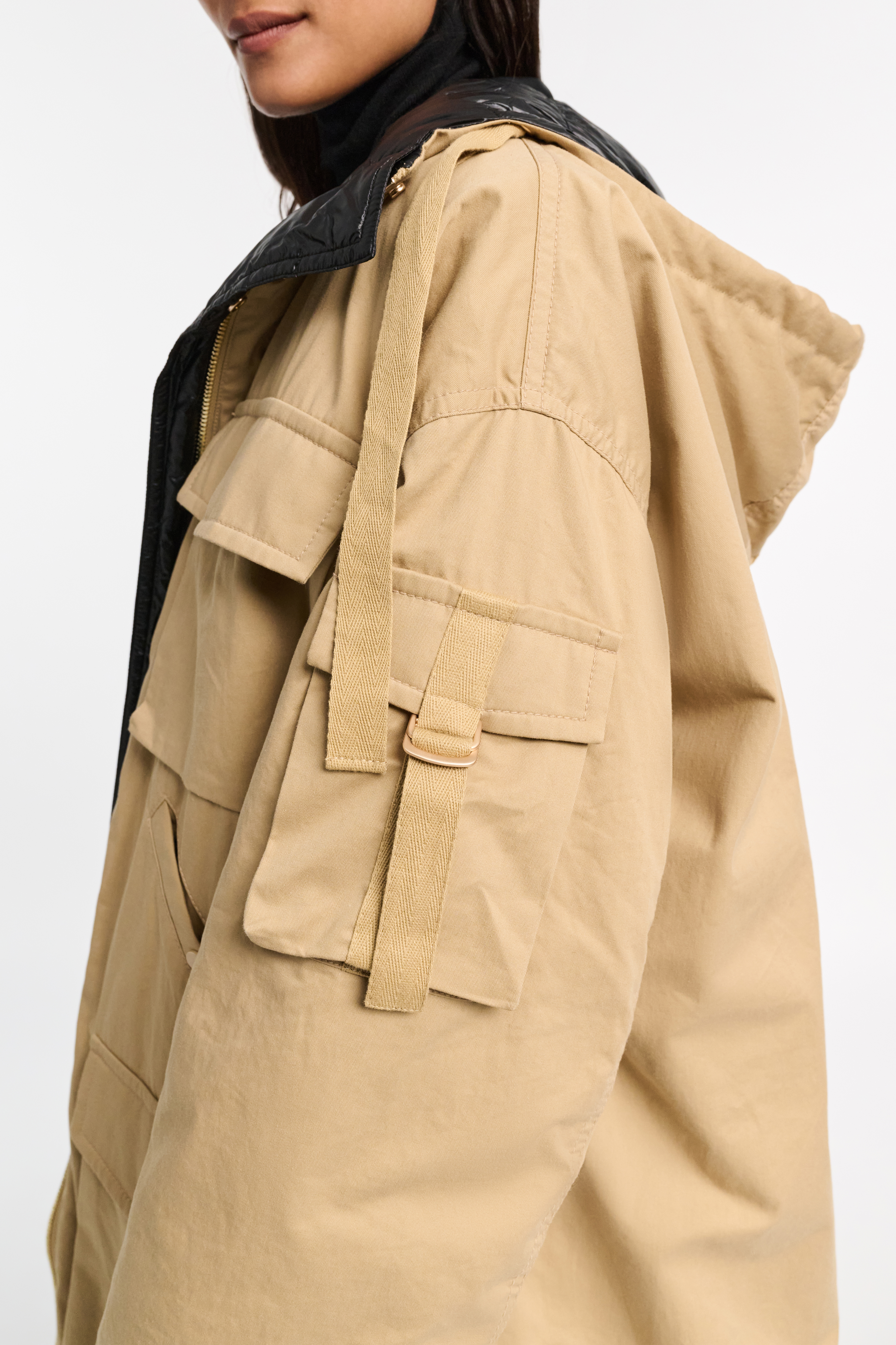 Eine Seite ist in Cotton gefertigt und wird durch aufgesetzte Taschen und goldene Details abgerundet.
