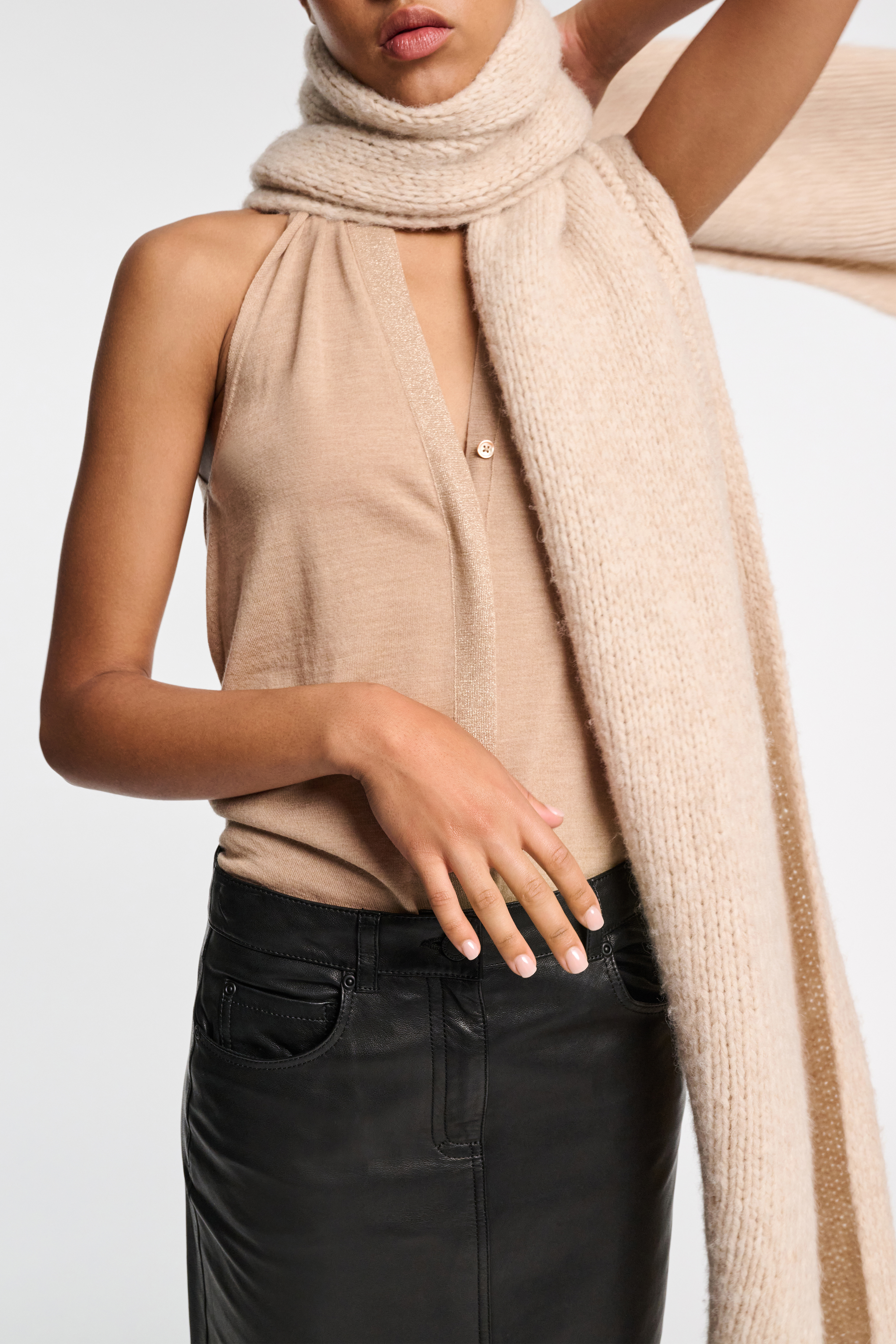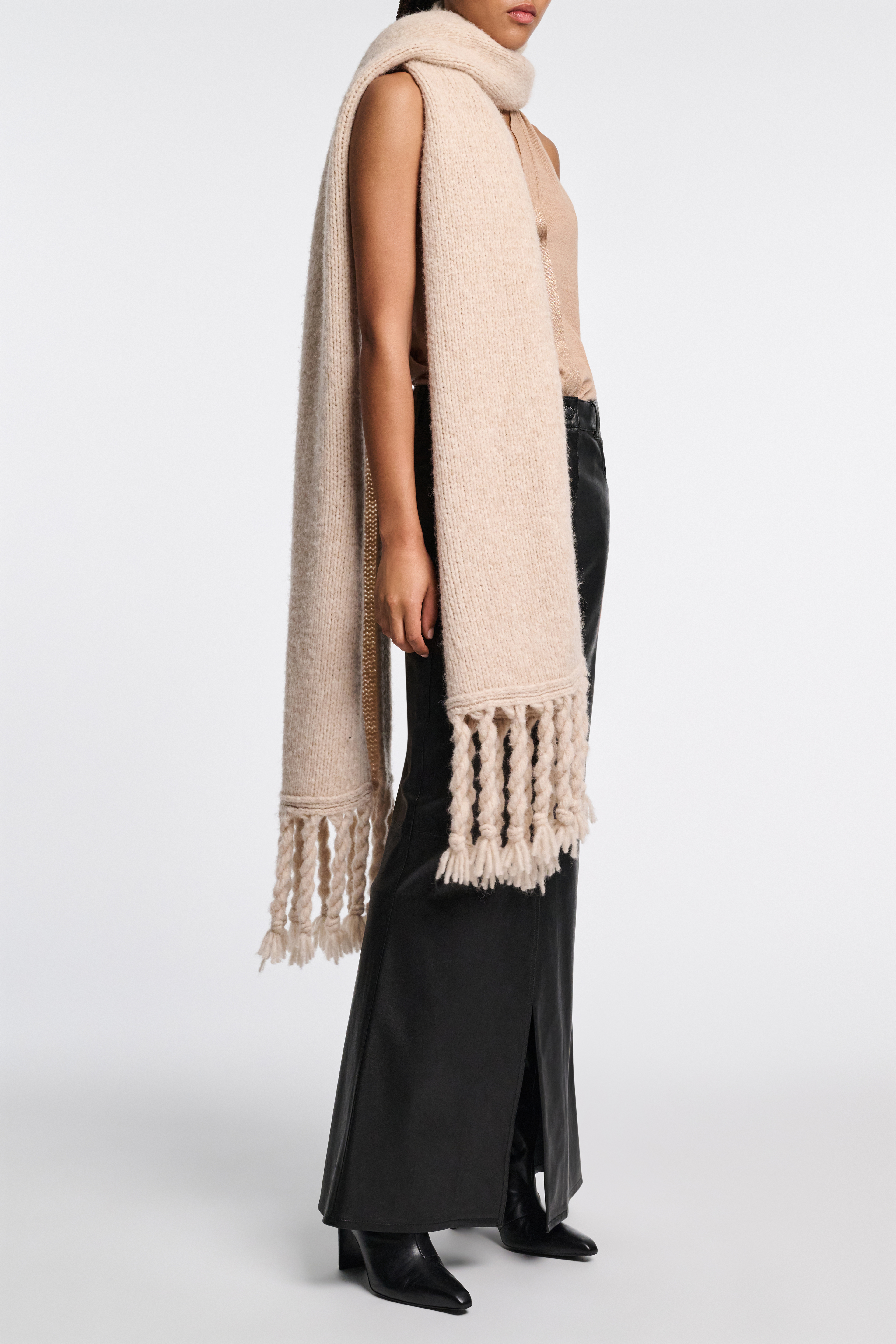 Der Schal hat eine lange Silhouette und wird durch aufgedrehte Fransen ausgezeichnet.