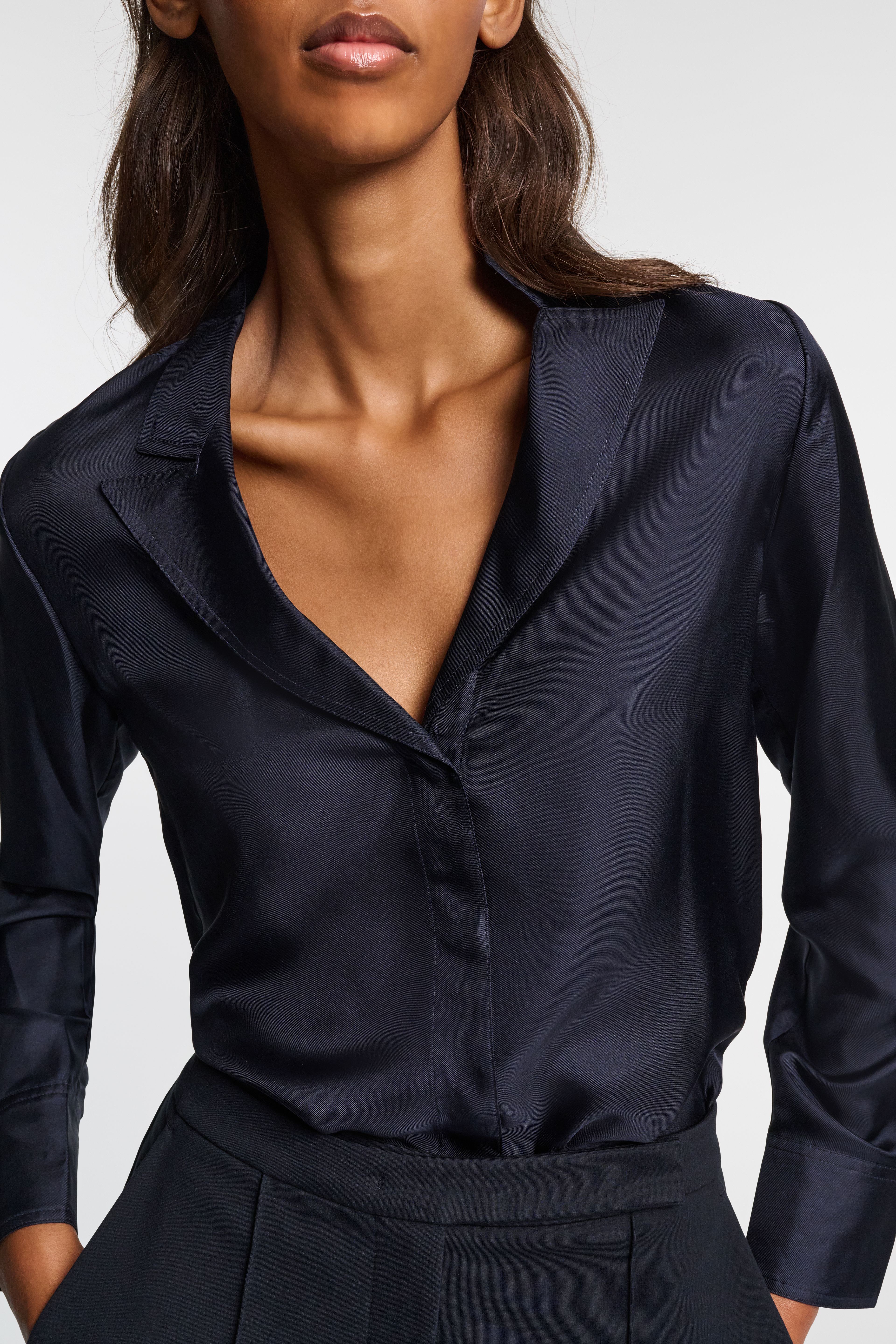 Die Bluse ist aus fließendem Seidentwill gefertigt.