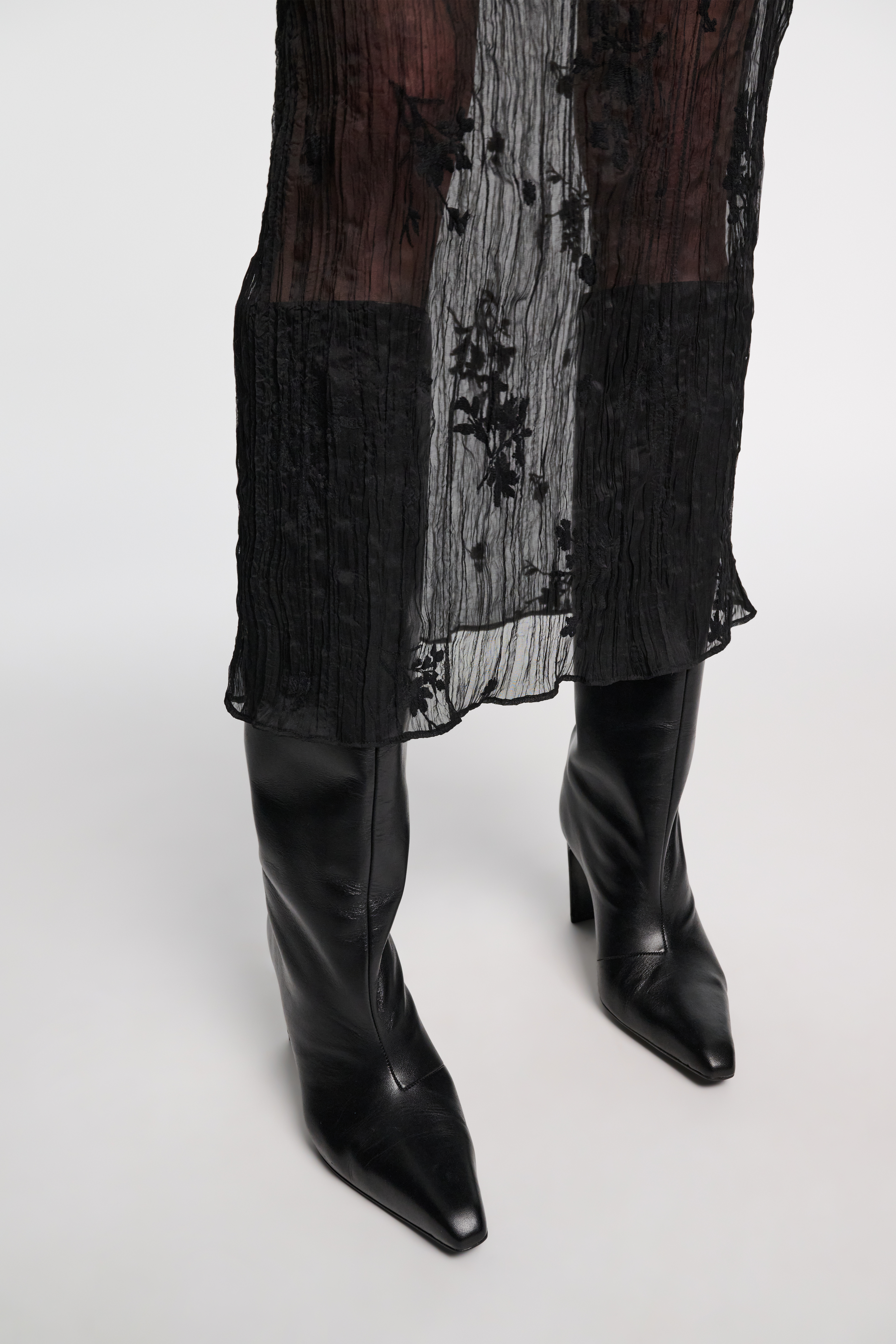 Der Rock ist aus Crinkle Chiffon gefertigt und hat eine transparente Optik.