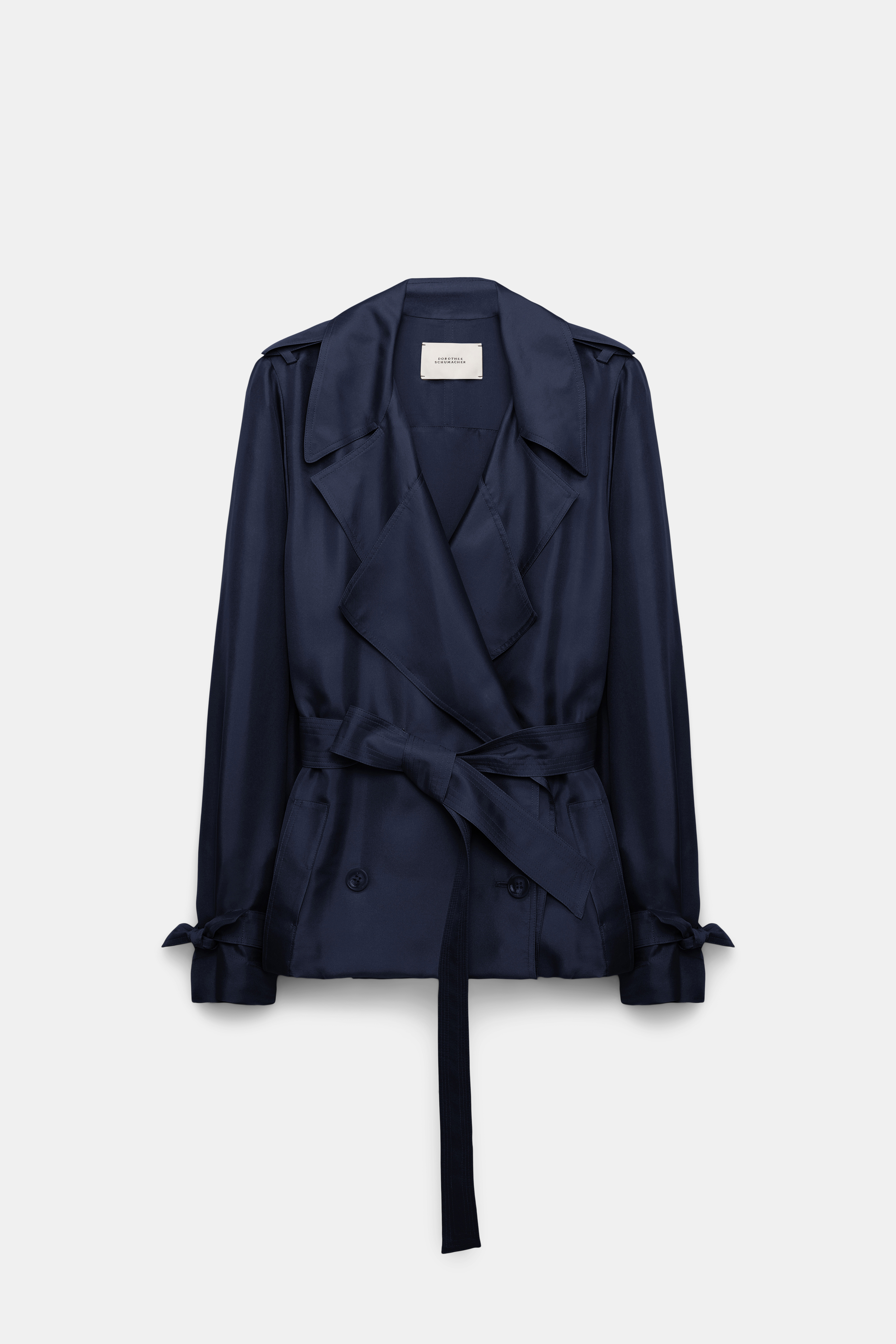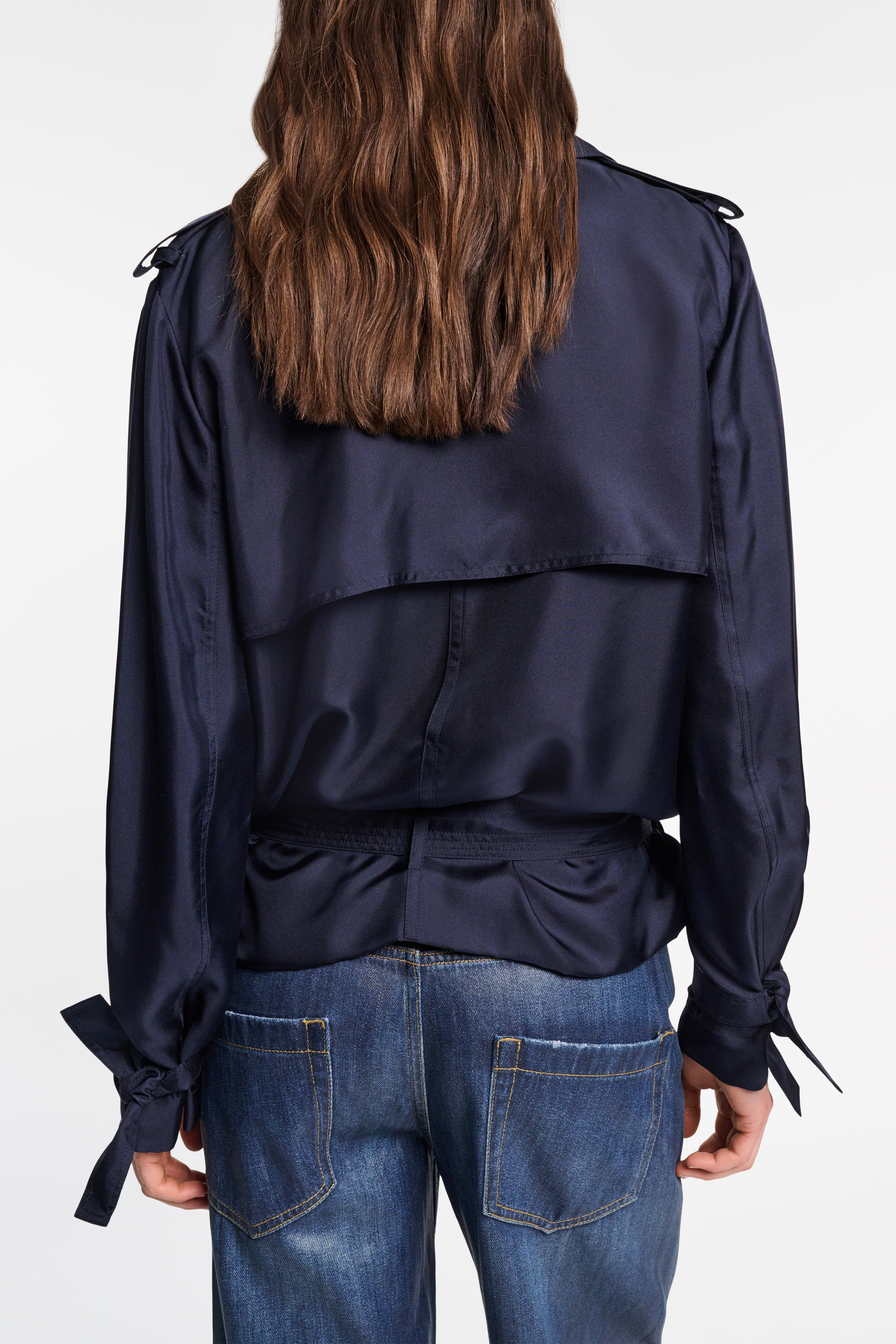 Die Bluse ist aus fließendem Seidentwill gefertigt und hat eine Trenchcoat-inspirierte Silhouette.