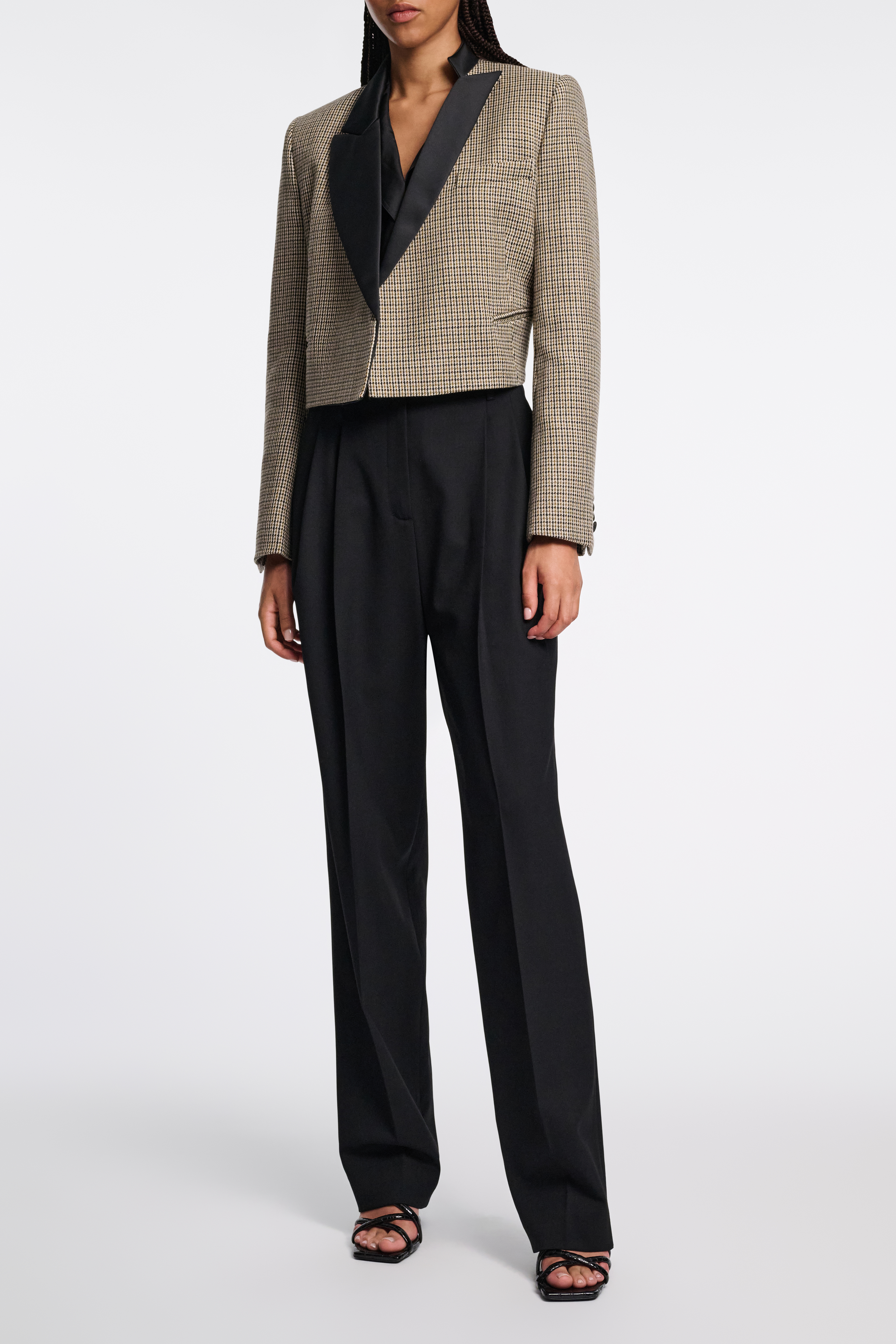Der verkürzte Blazer aus Wolle wird durch kontrastierende Satin-Details ausgezeichnet.