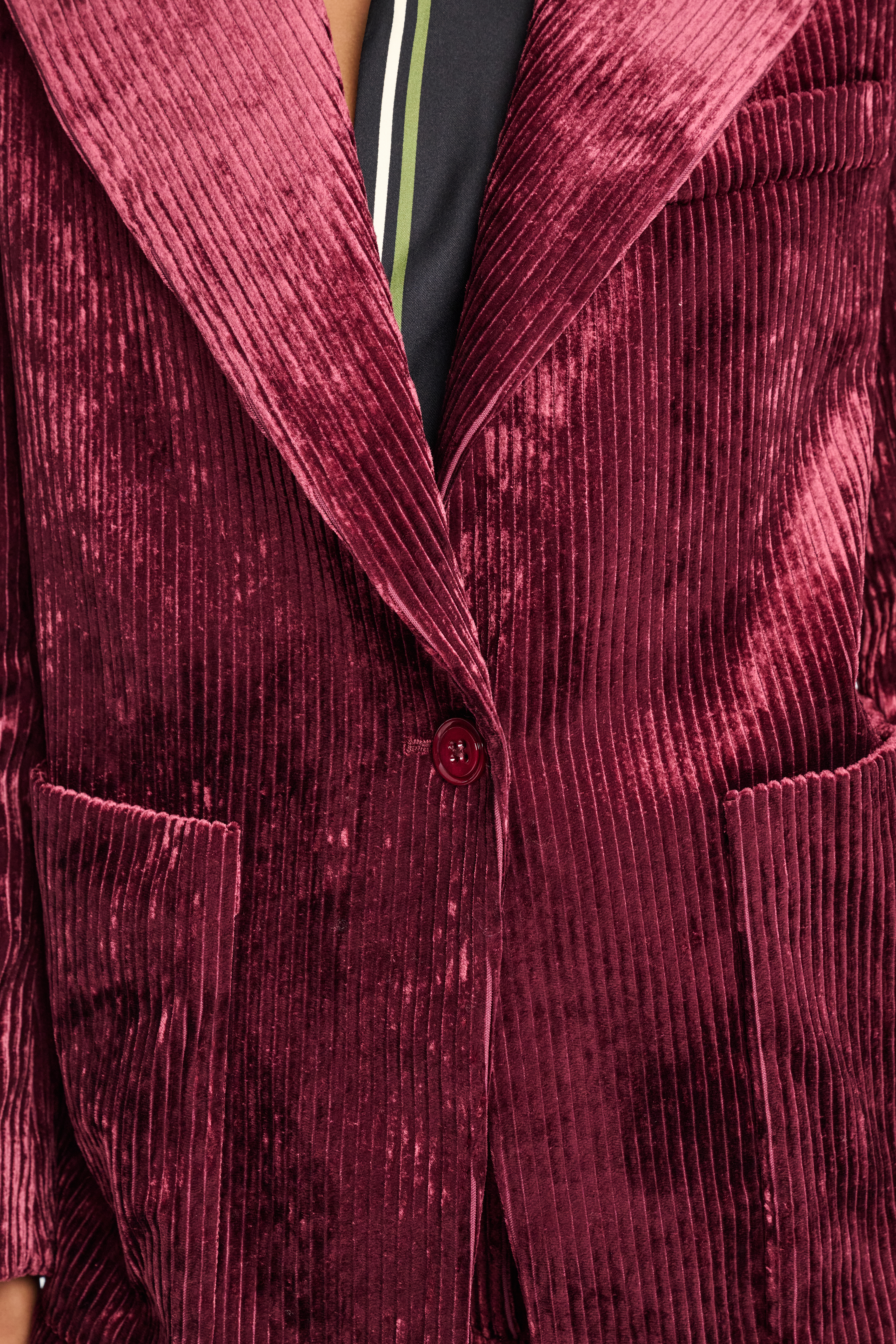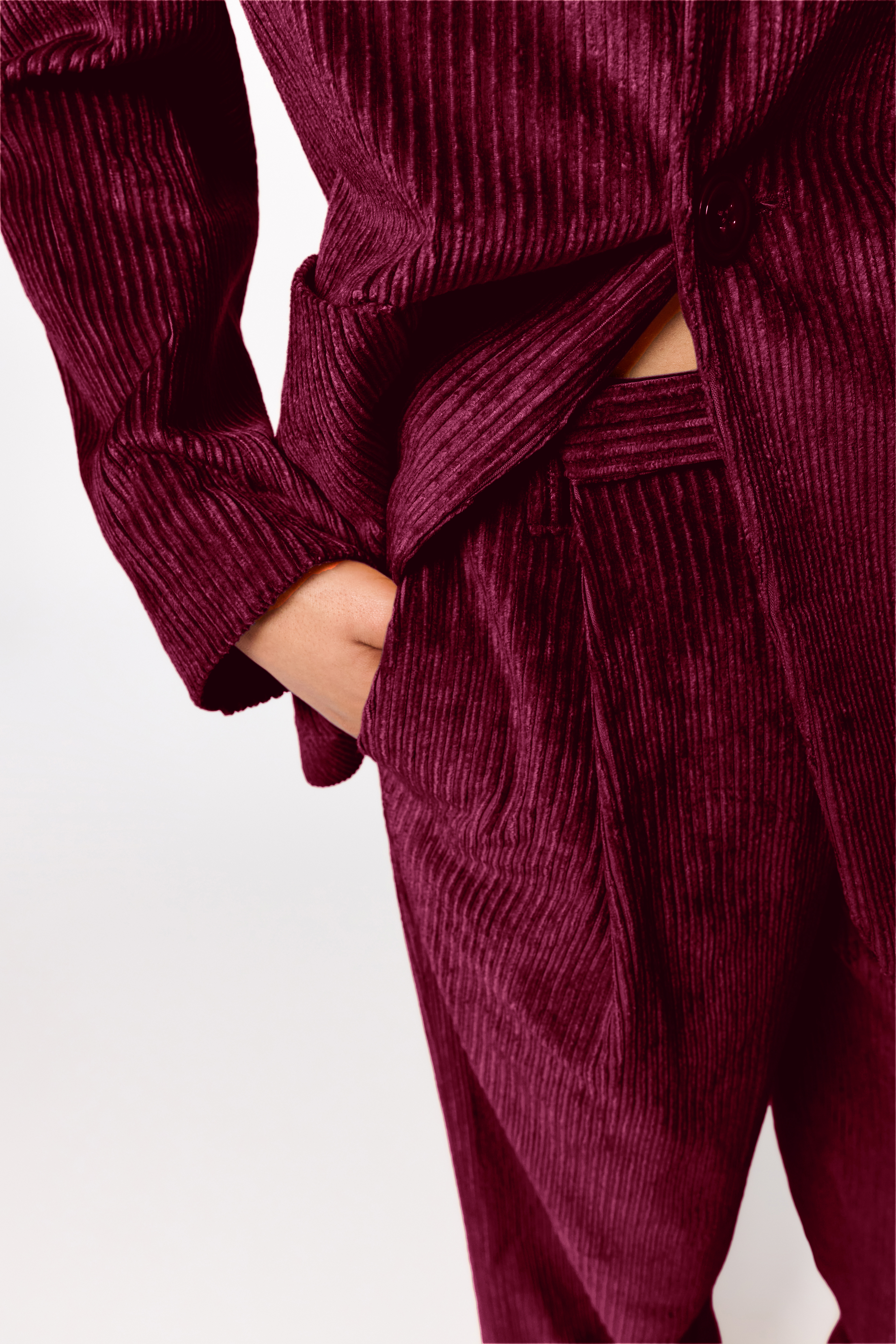 Der Blazer ist aus Cord gefertigt und überzeugt mit einer besonders soften, samtigen Haptik.