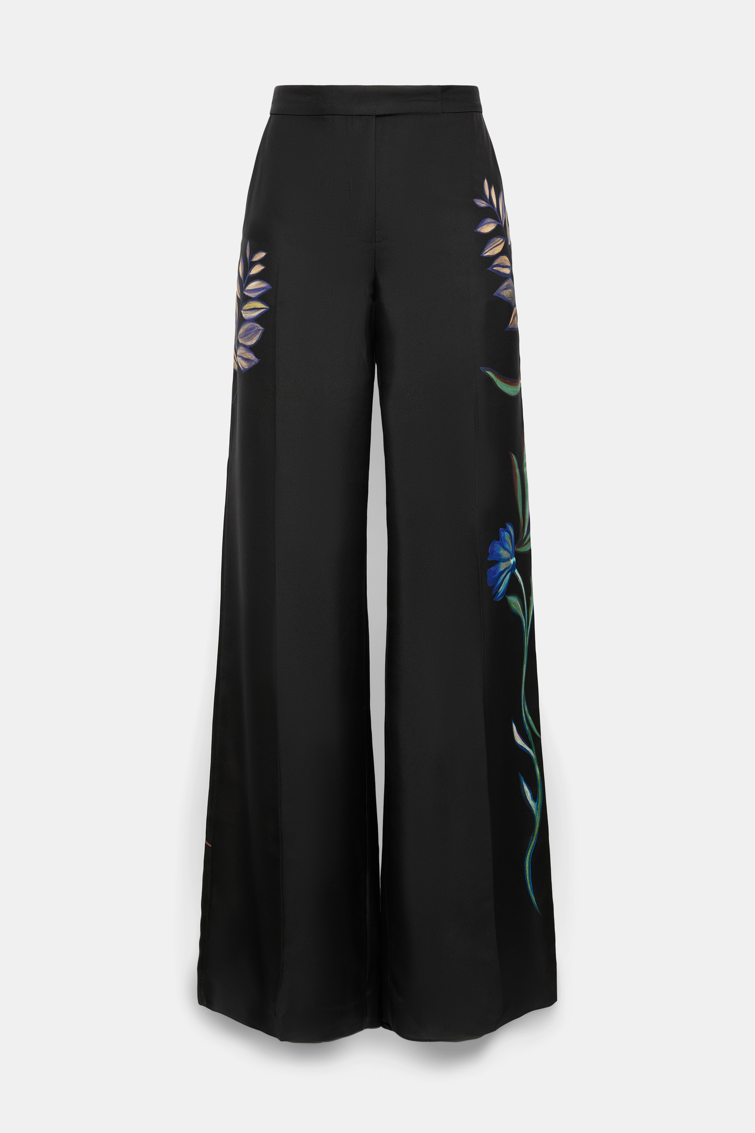 Die Hose ist aus Seidentwill gefertigt und überzeugt durch ihren platzierten, floralen Print.