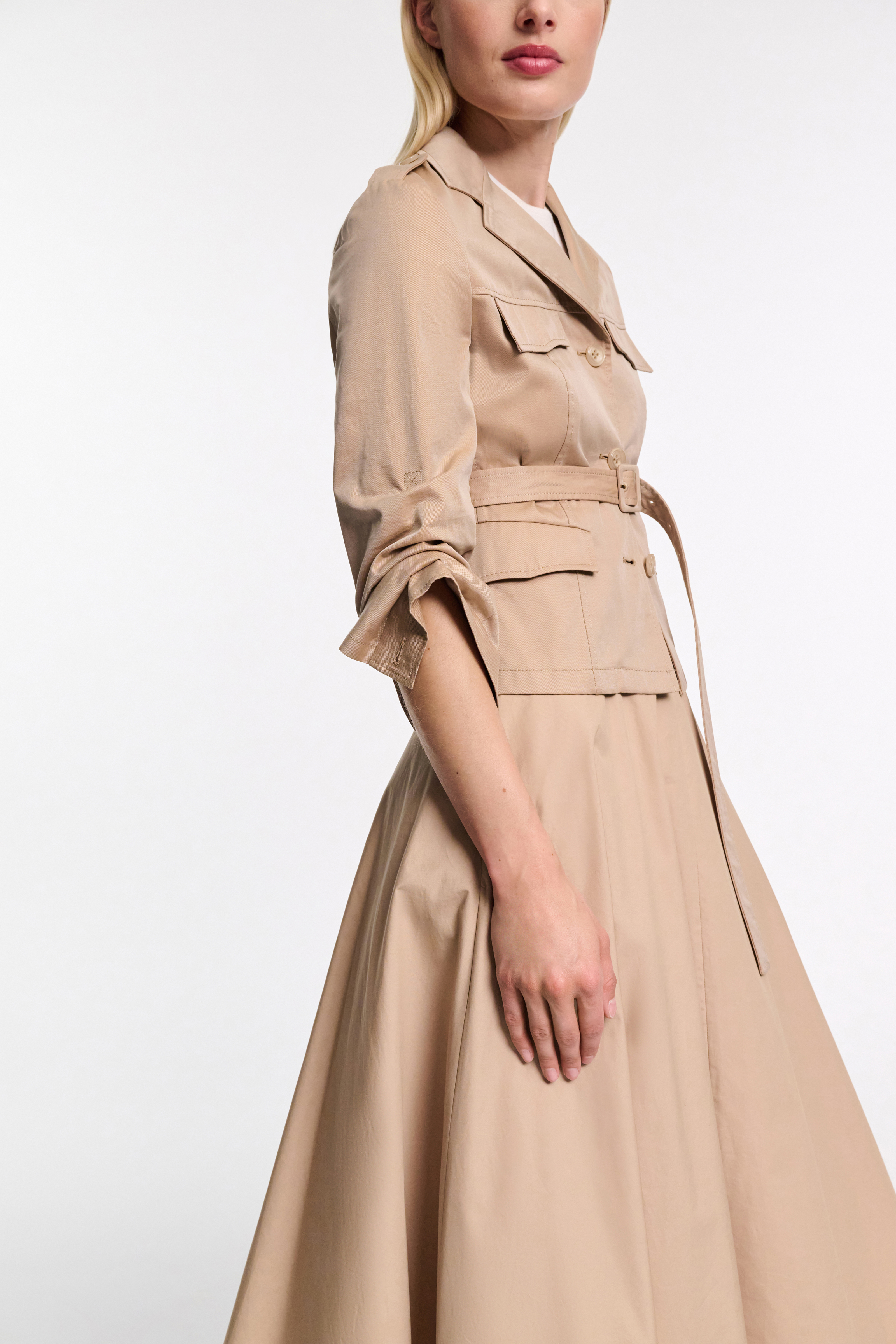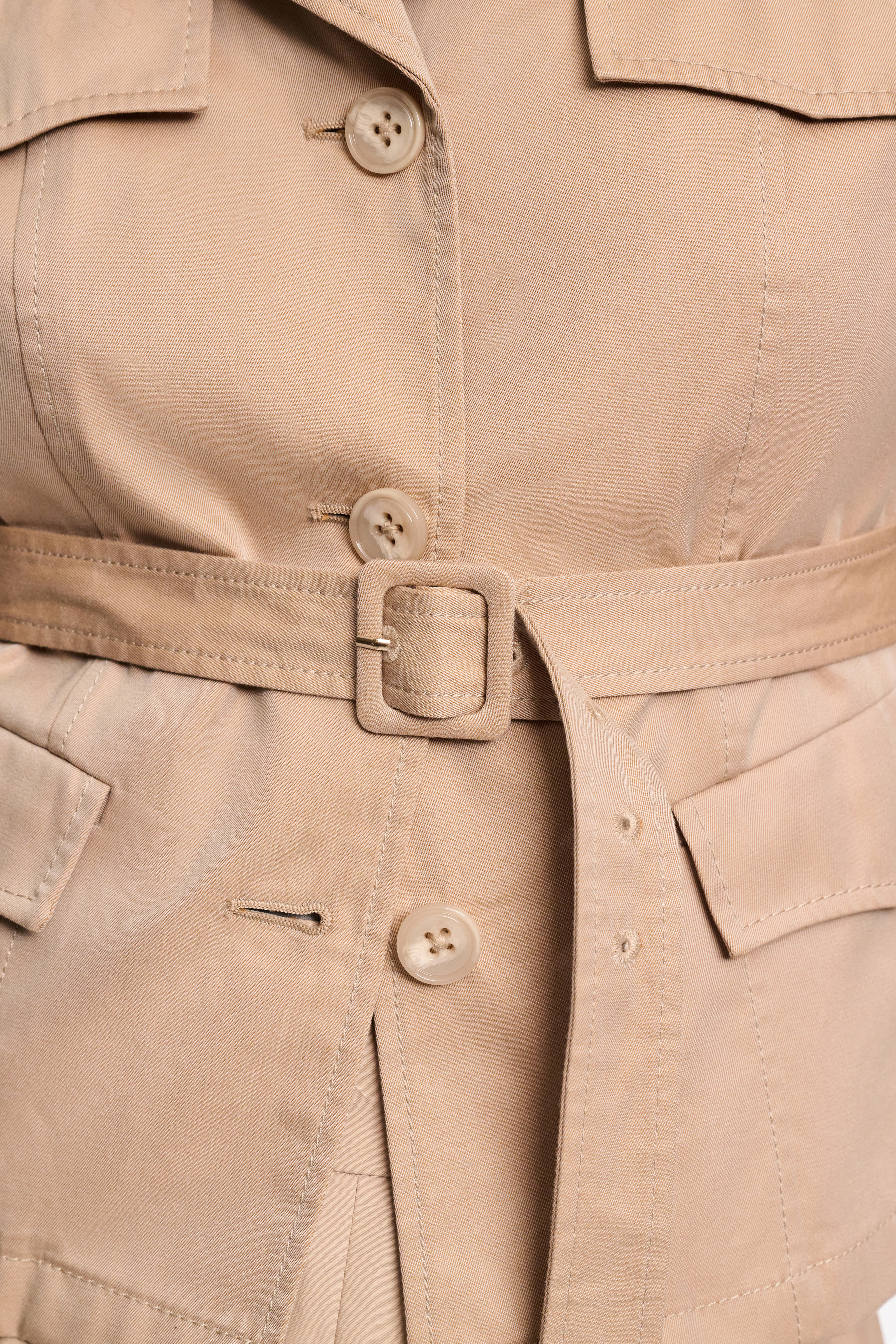 Ein Reverskragen, Pattentaschen und Riegel an der Schulter kreieren einen klassischen Trenchcoat-Look.