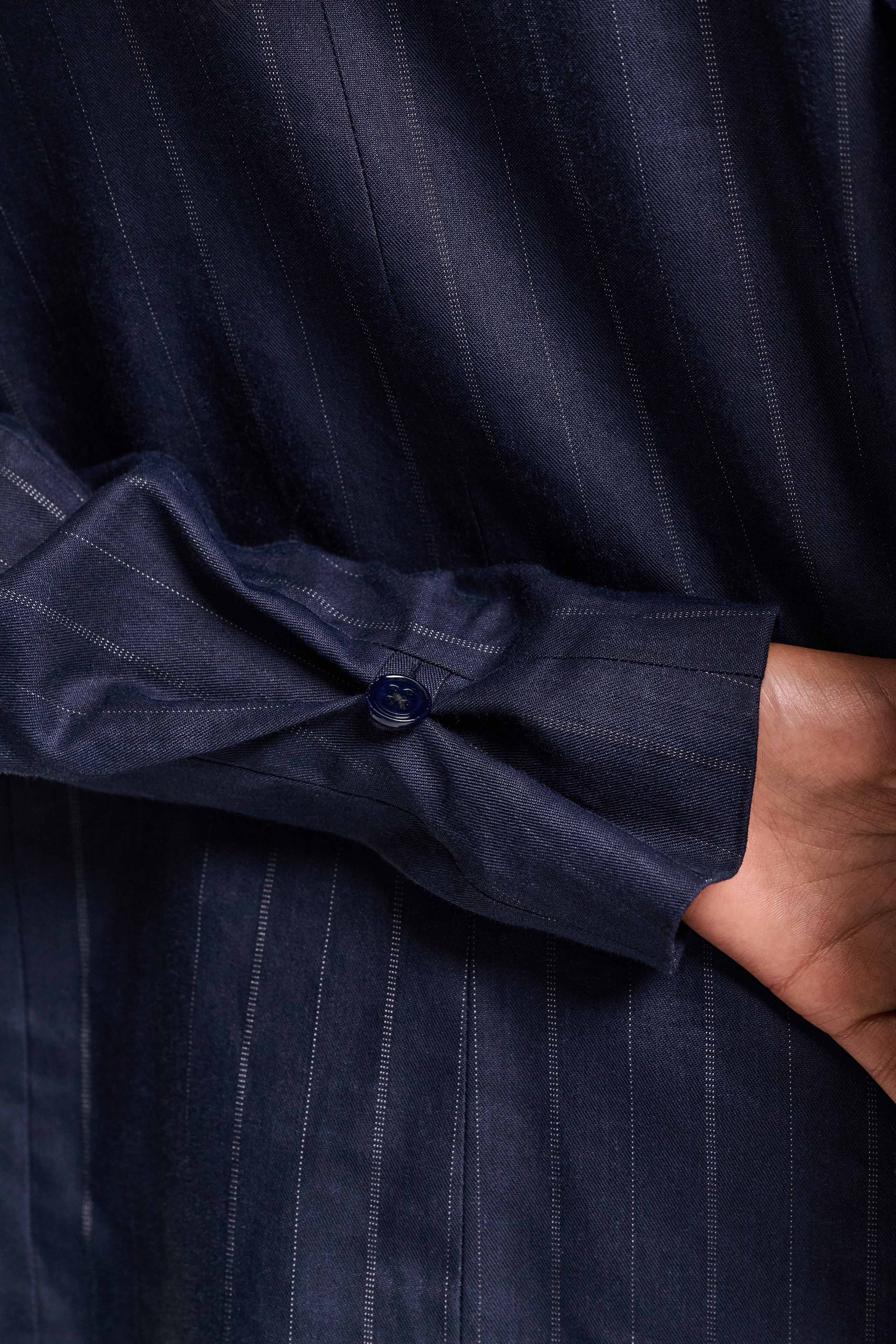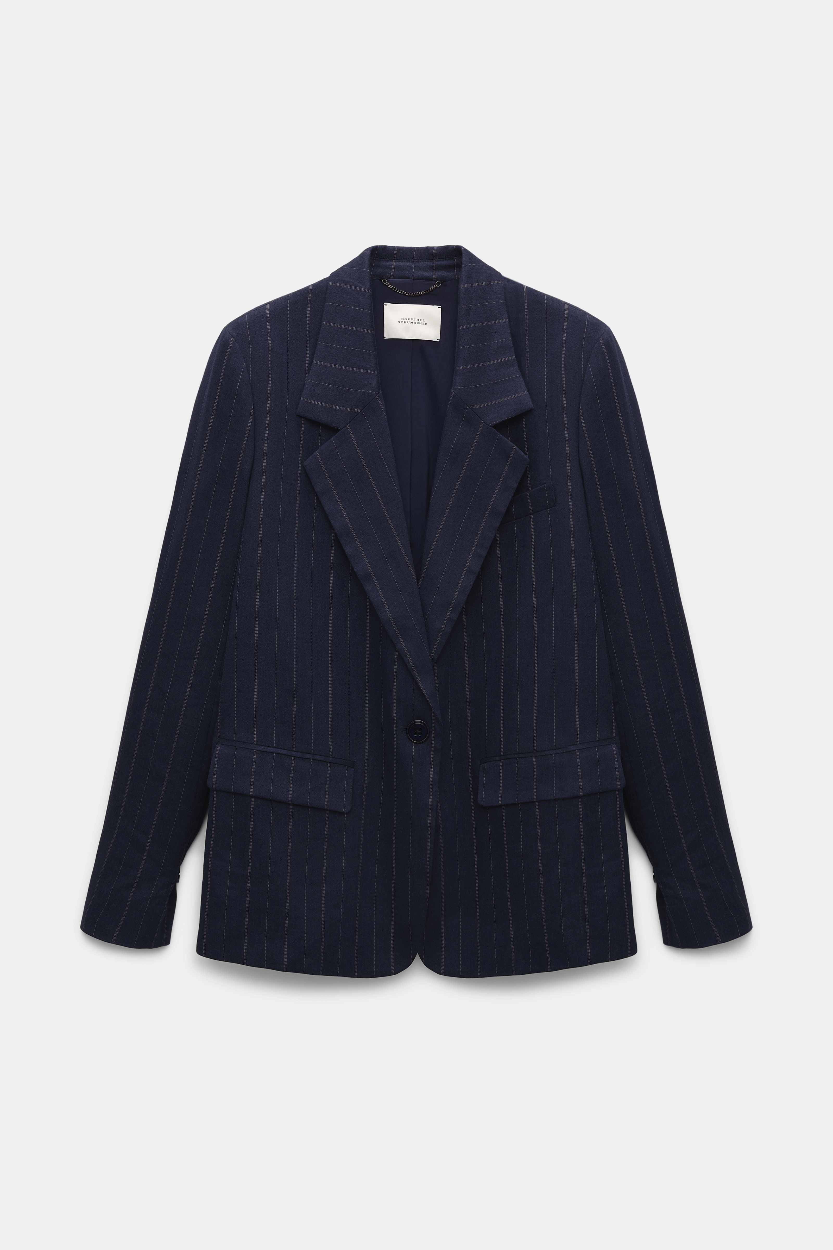 Der Pinstripe Blazer überzeugt mit einem klassischen Reverskragen und Pattentaschen.