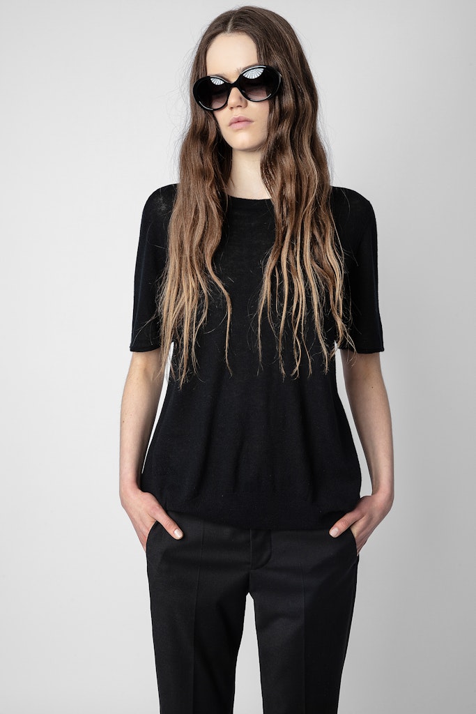 - Zadig & Voltaire women's cashmere short sleeve sweater - Round neck - Short sleeves - Ribbed collar and waist - Topstitching details - Pointelle ZV signature - Naturally warm, feather cashmere is lighter and more delicate than traditional cashmere.