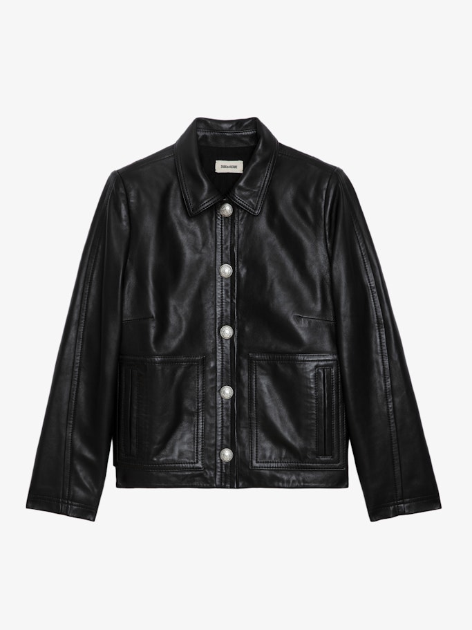 - Women's Iron grey smooth leather straight-cut cropped jacket - Shirt collar - Silver-colored wolf press stud fastening - 2 side pockets and 2 inside pockets - Long sleeves and rounded side hems - Cut-outs and small rounded slits - Tone-on-tone inner lining