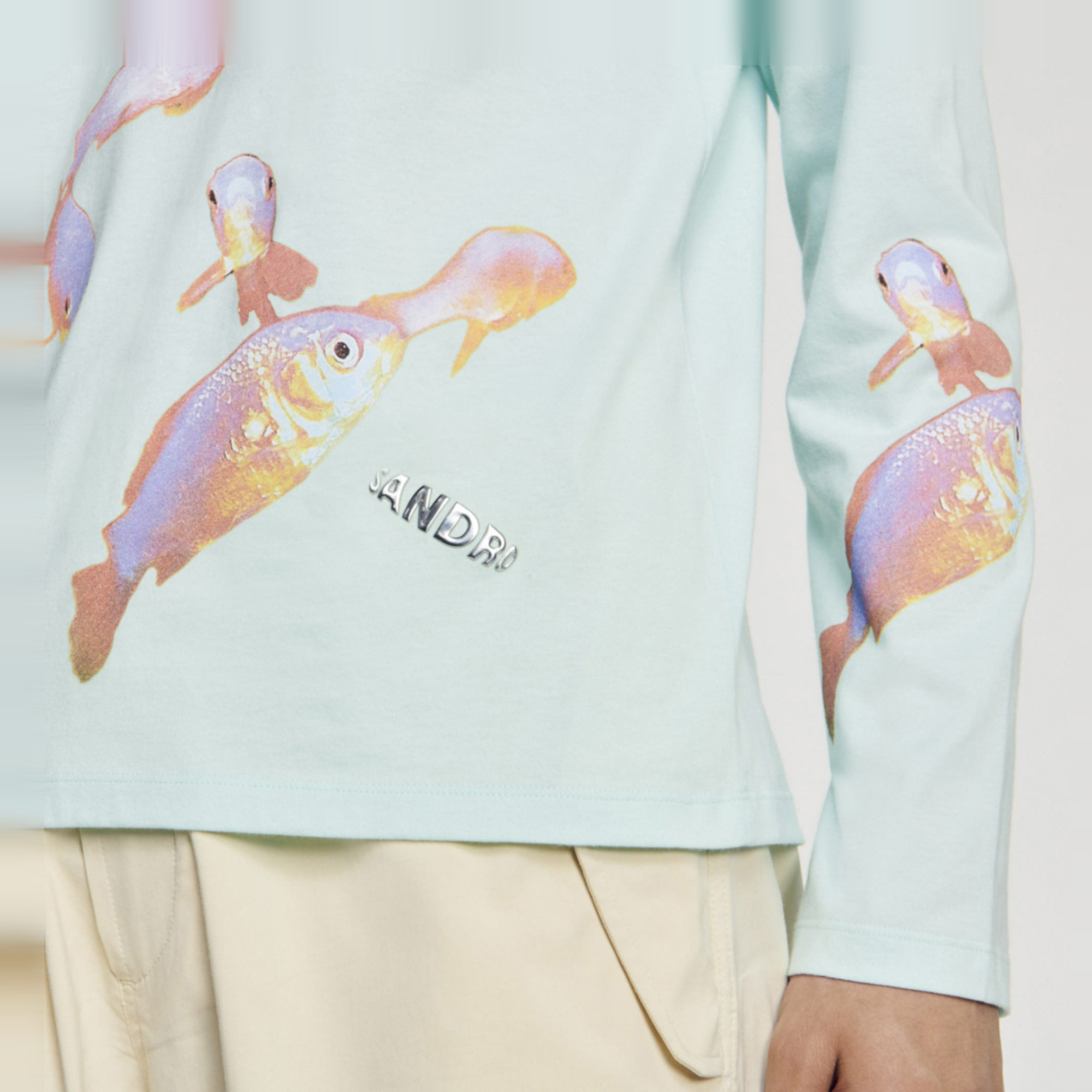Sandro cotton Oversize fit cotton T-shirt, with long sleeves and a round neck and embellished with an all-over fish print.