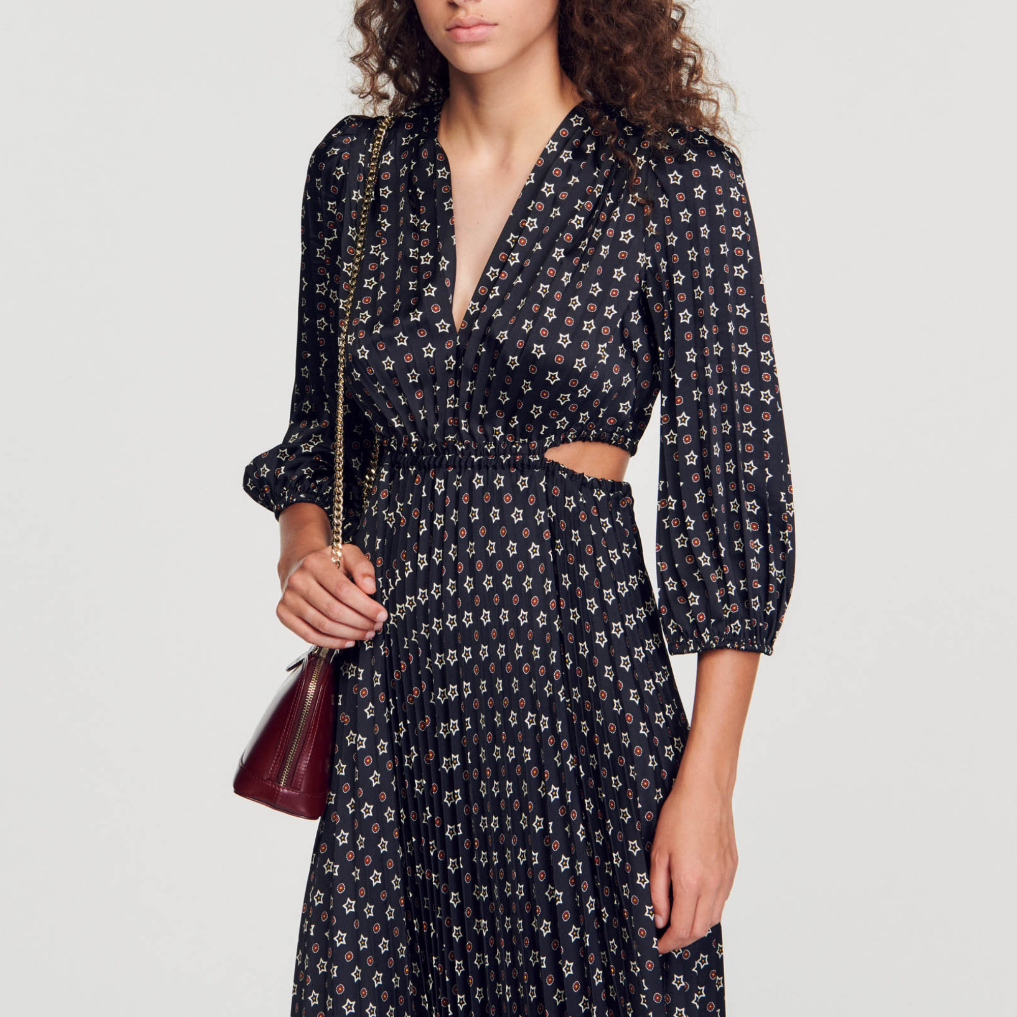 Sandro polyester Long pleated dress with a mini stars print, long voluminous sleeves with gathered cuffs, an elasticated waist with cut-outs at the sides, and a flared skirt.