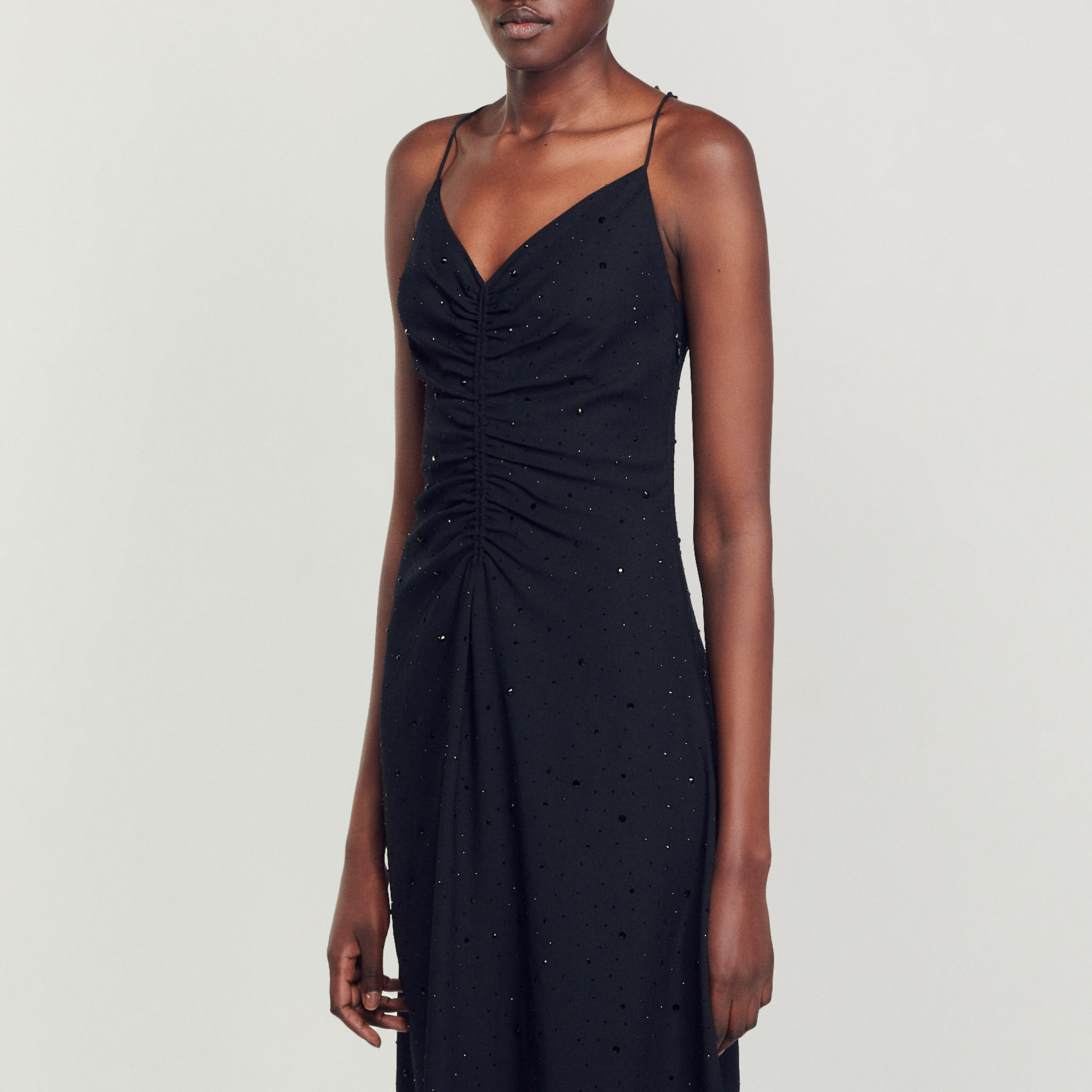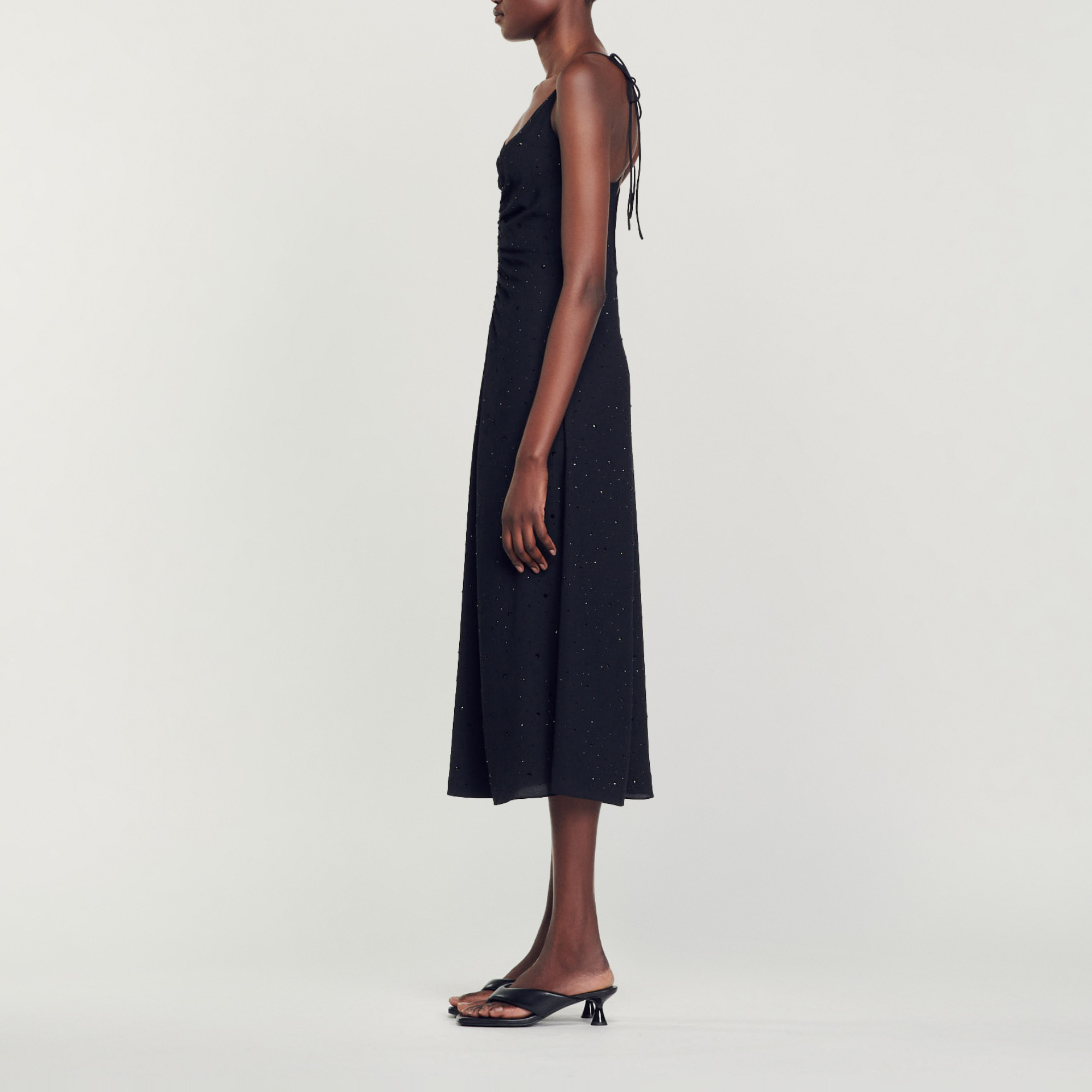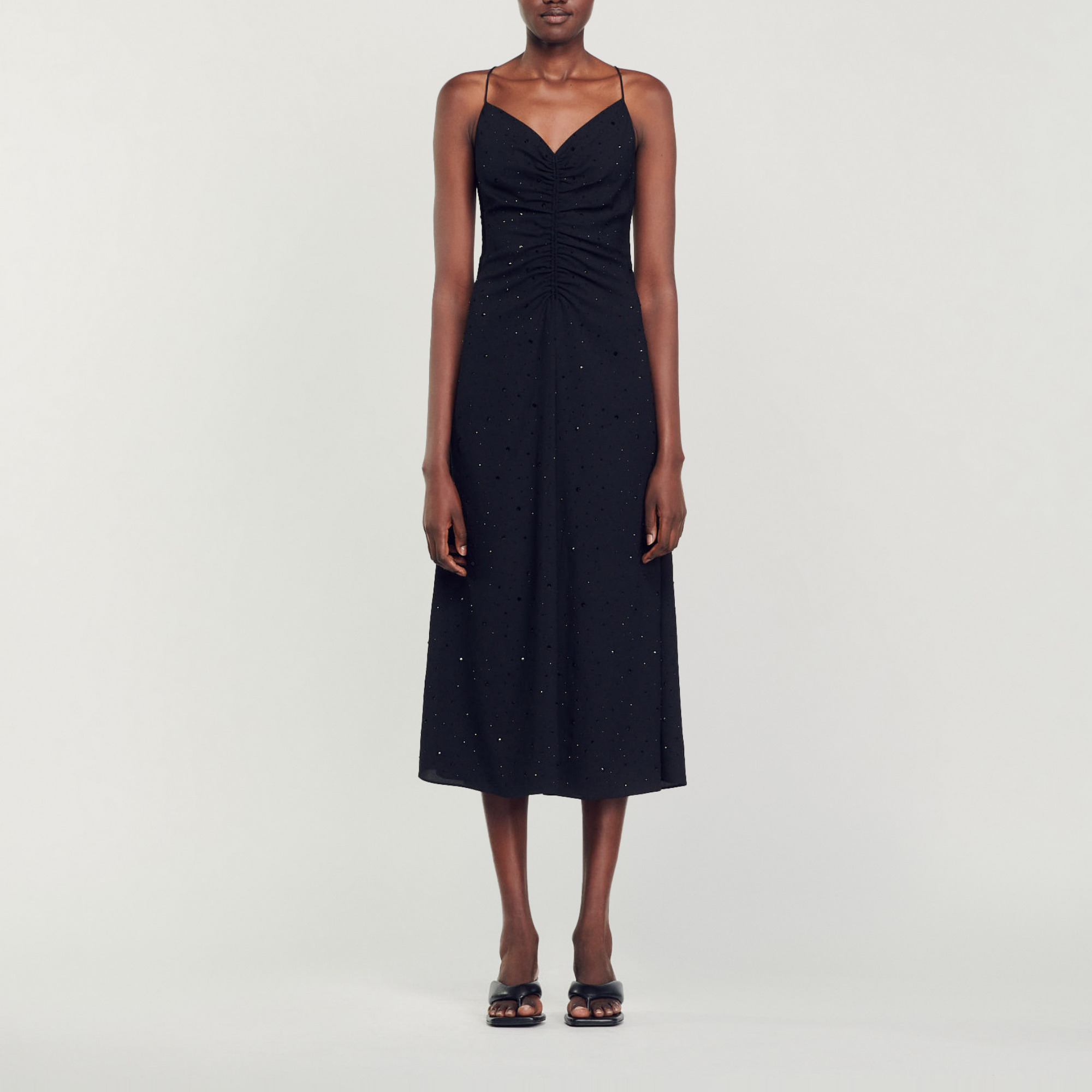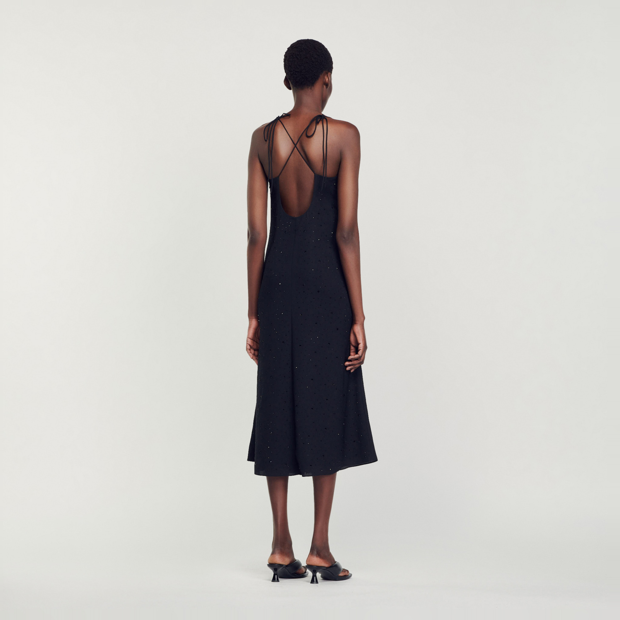 Sandro polyester Long dress with a flared skirt, thin crossover straps tied at the back, a gathered plunging neckline, and all-over rhinestones.