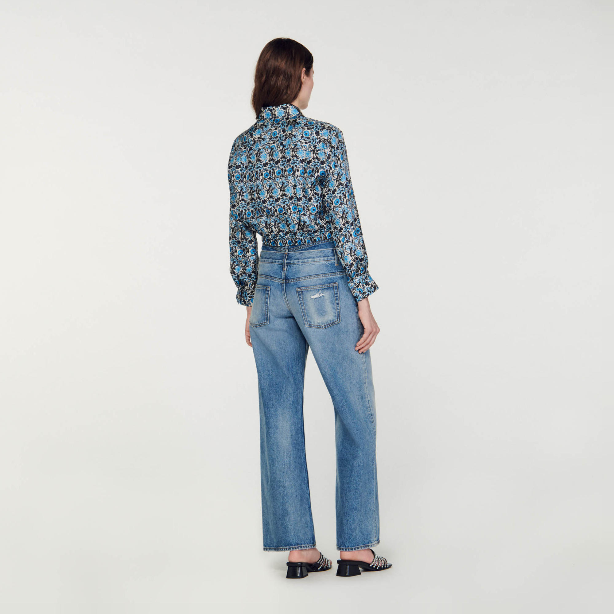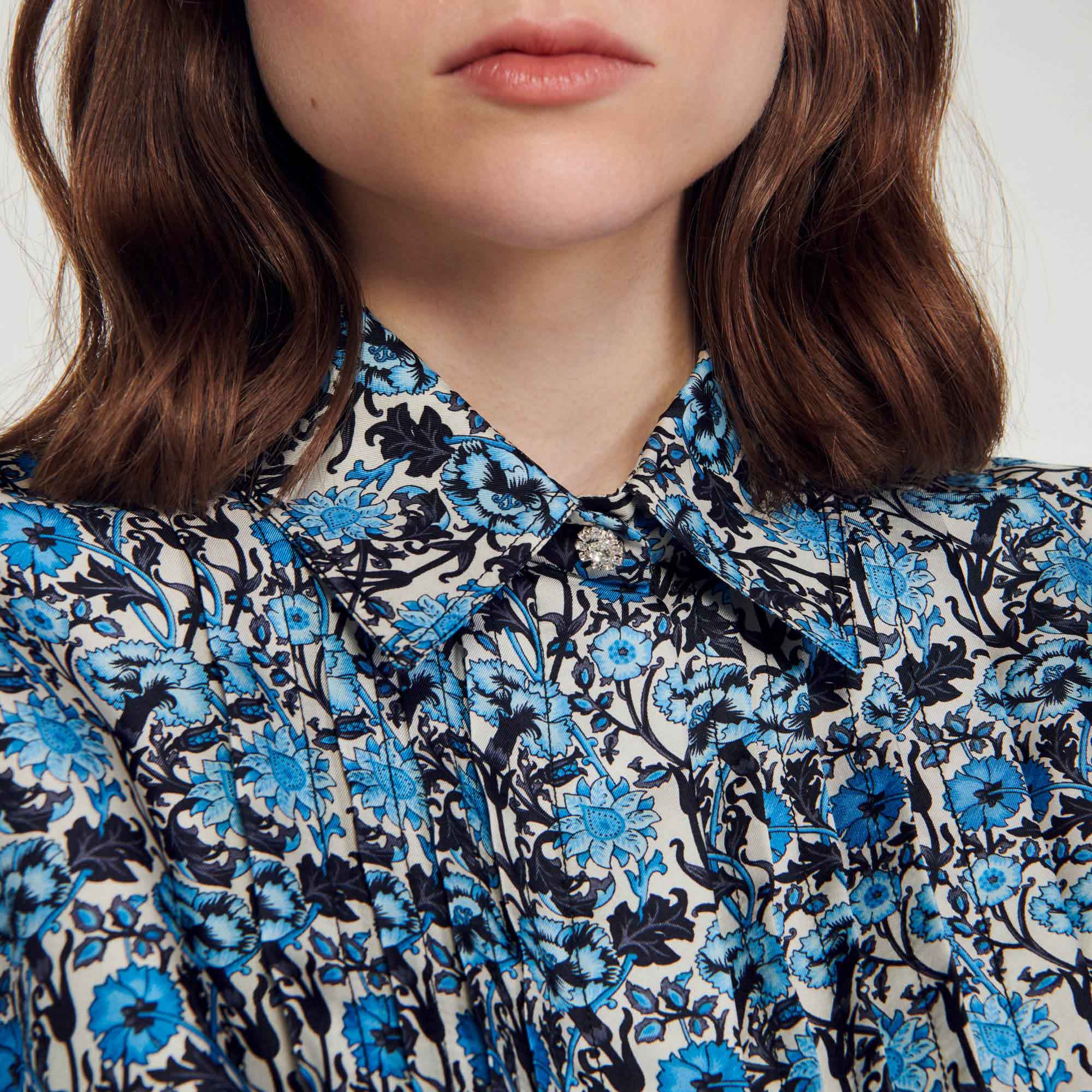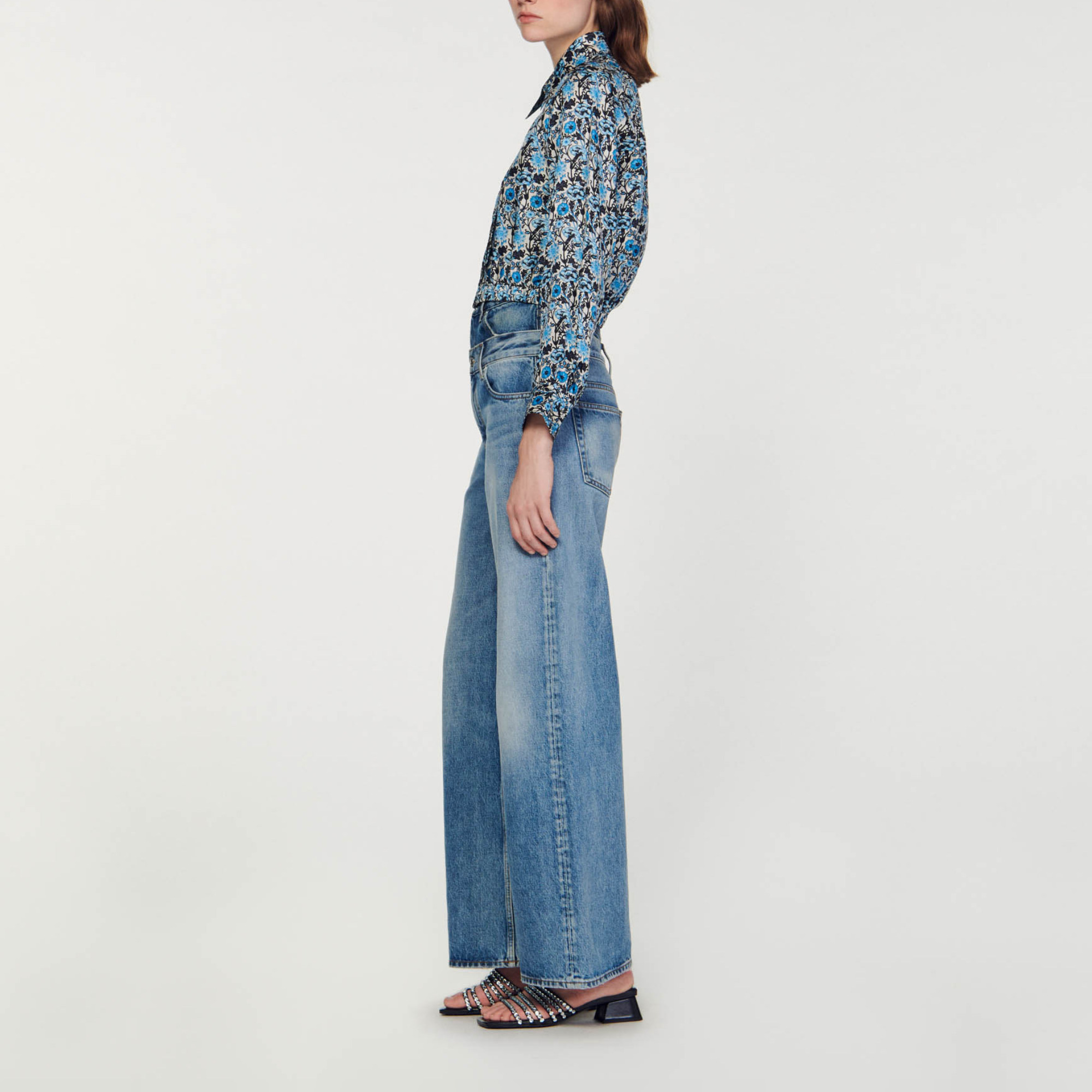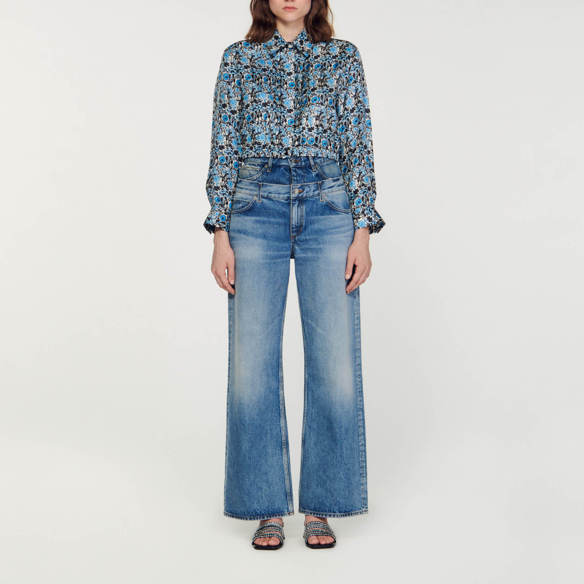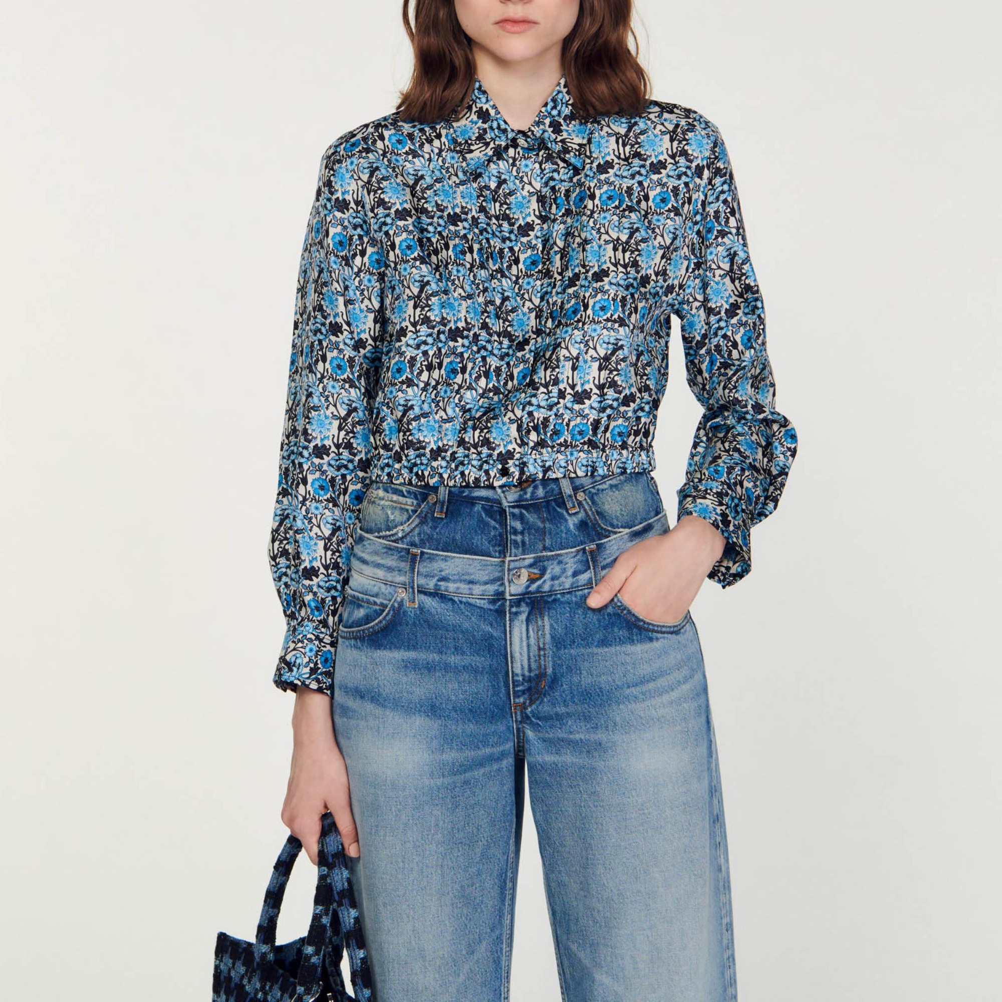 Sandro Women's printed silk shirt Cropped cut with an elasticated waist Blue Blossom print Shirt collar Long sleeves Concealed button placket fastening Jeweled button on the collar Buttoned cuffs.