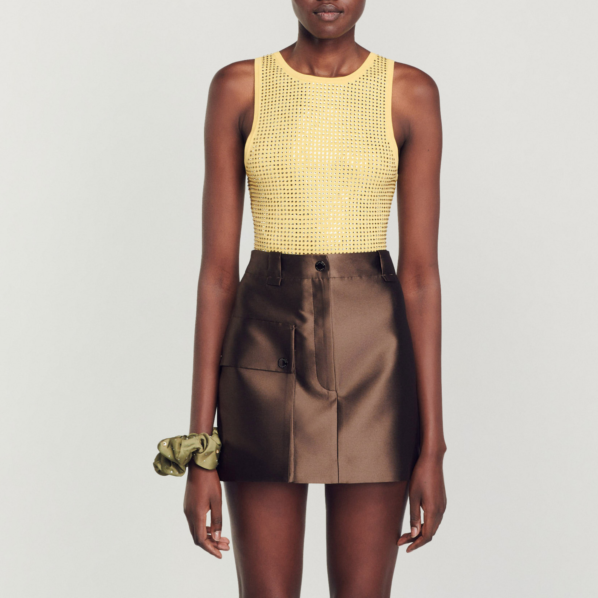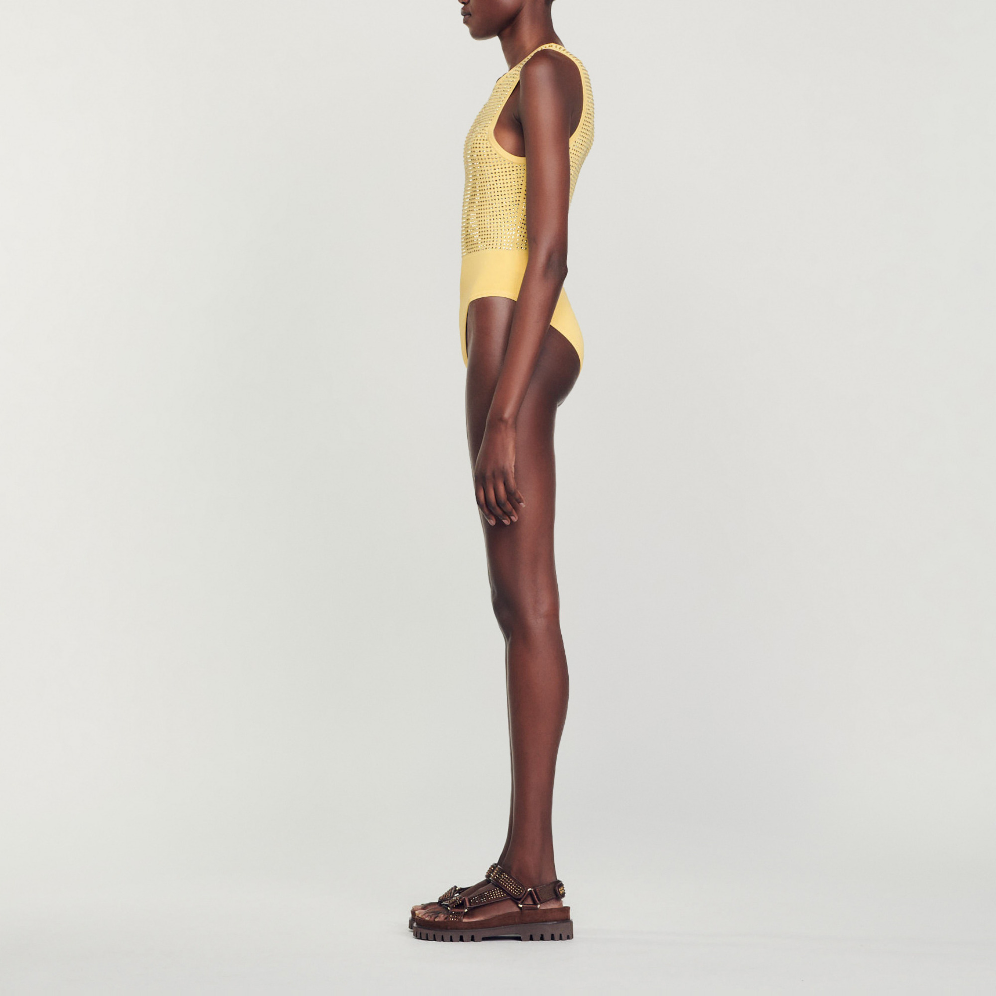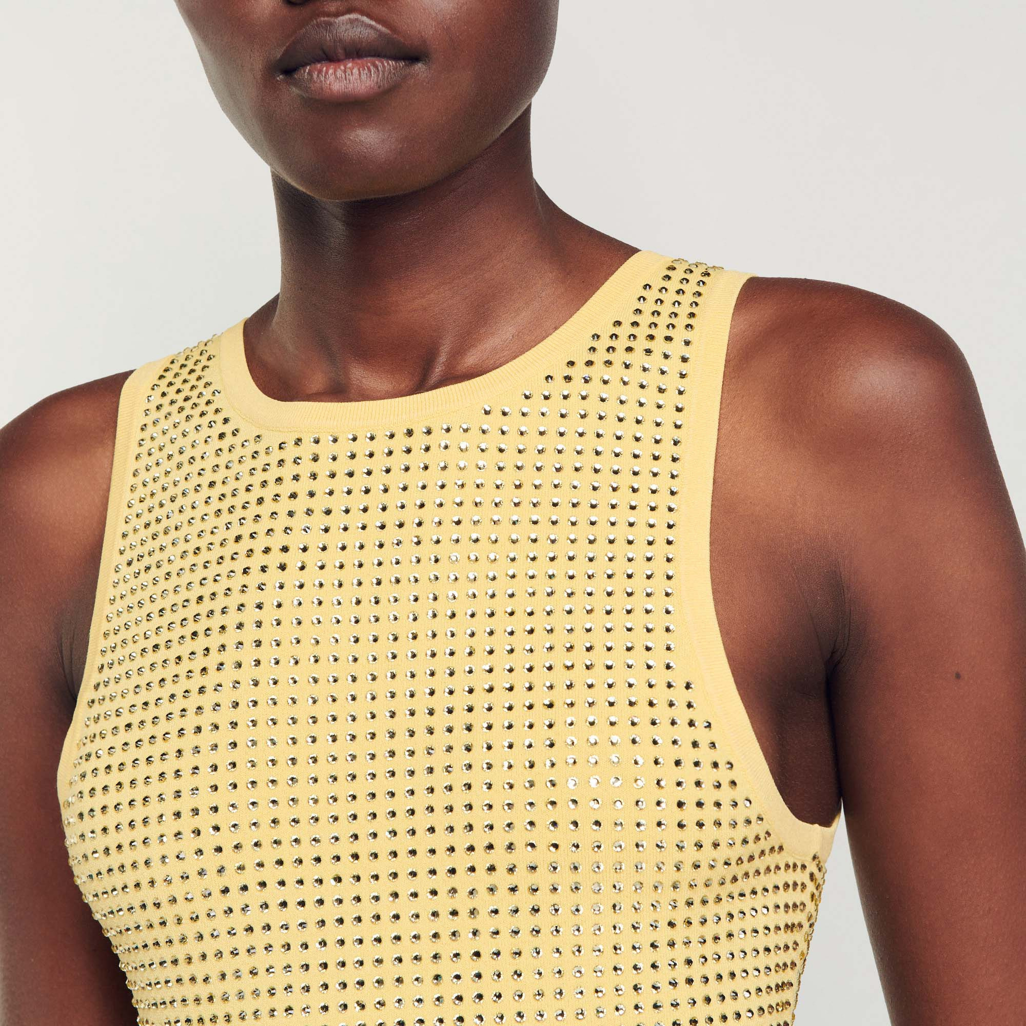 Sandro Women's knit bodysuit Embellished with rhinestones on the top Sleeveless Round neck Fastening at the back Opening with snap buttons at the bottom The viscose in this item is made of cellulose from sustainably managed forests..