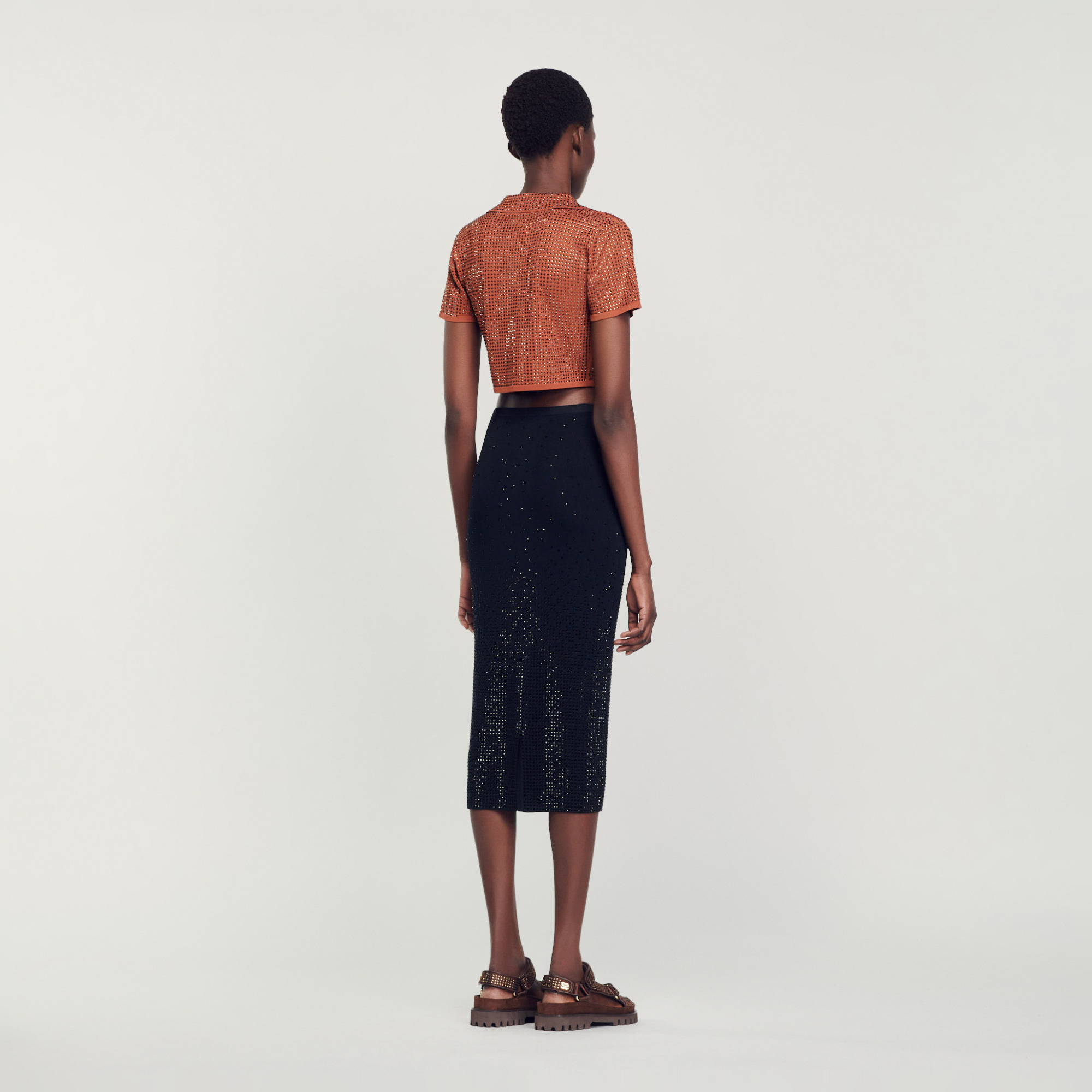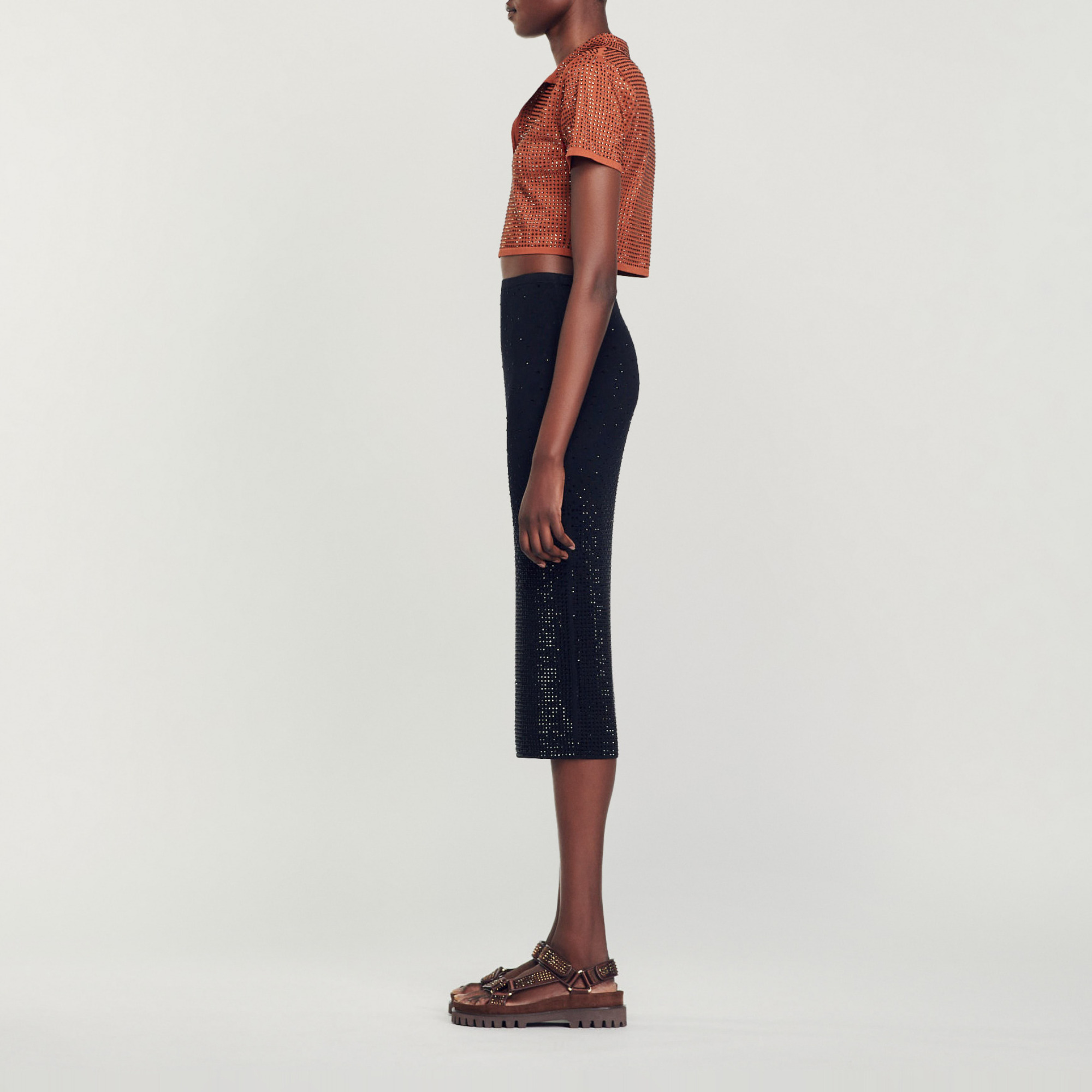 Sandro Women's midi skirt Stretch knit Pencil, figure-hugging cut Rhinestones Back slit This model runs small, we advise you to select the size based on your hip measurement.