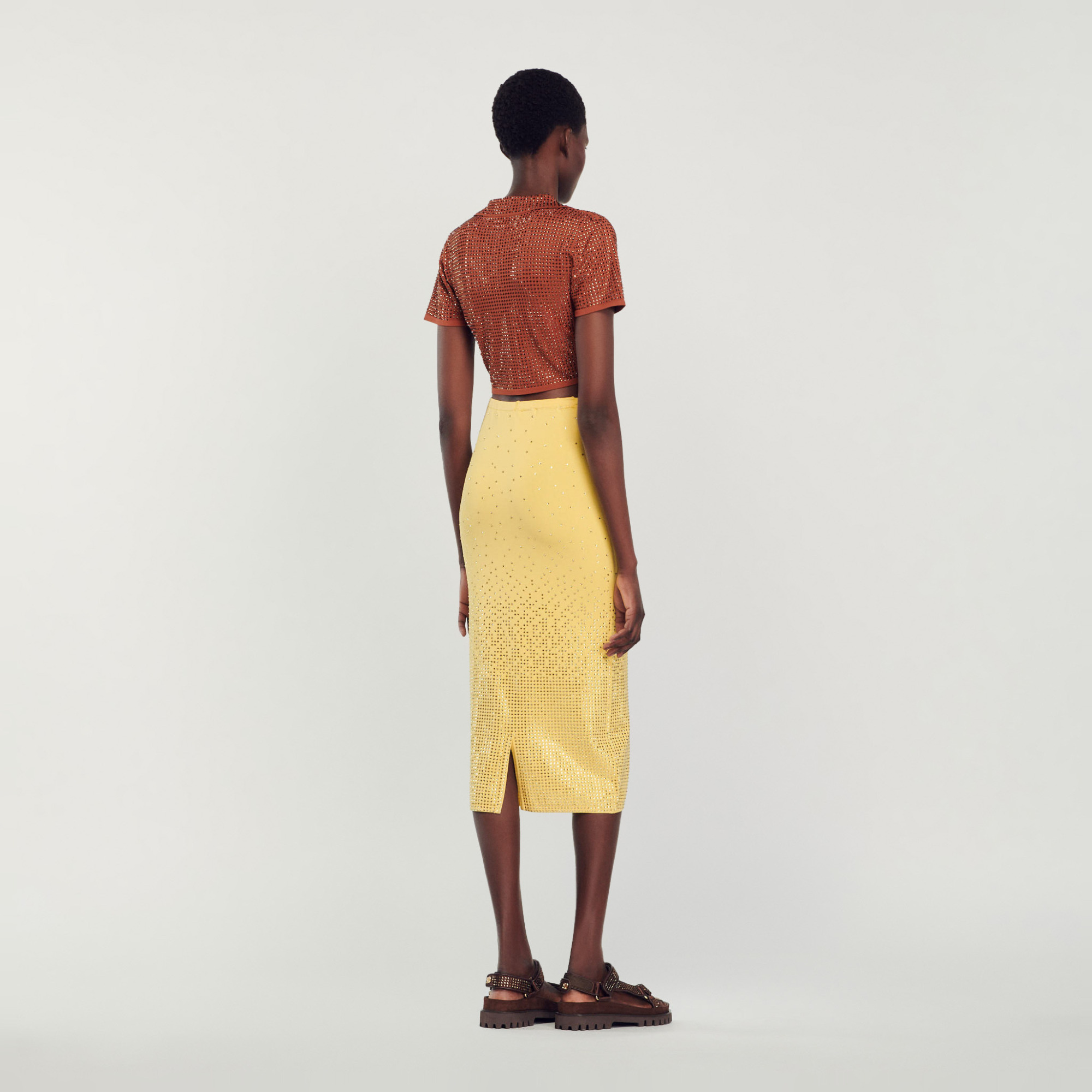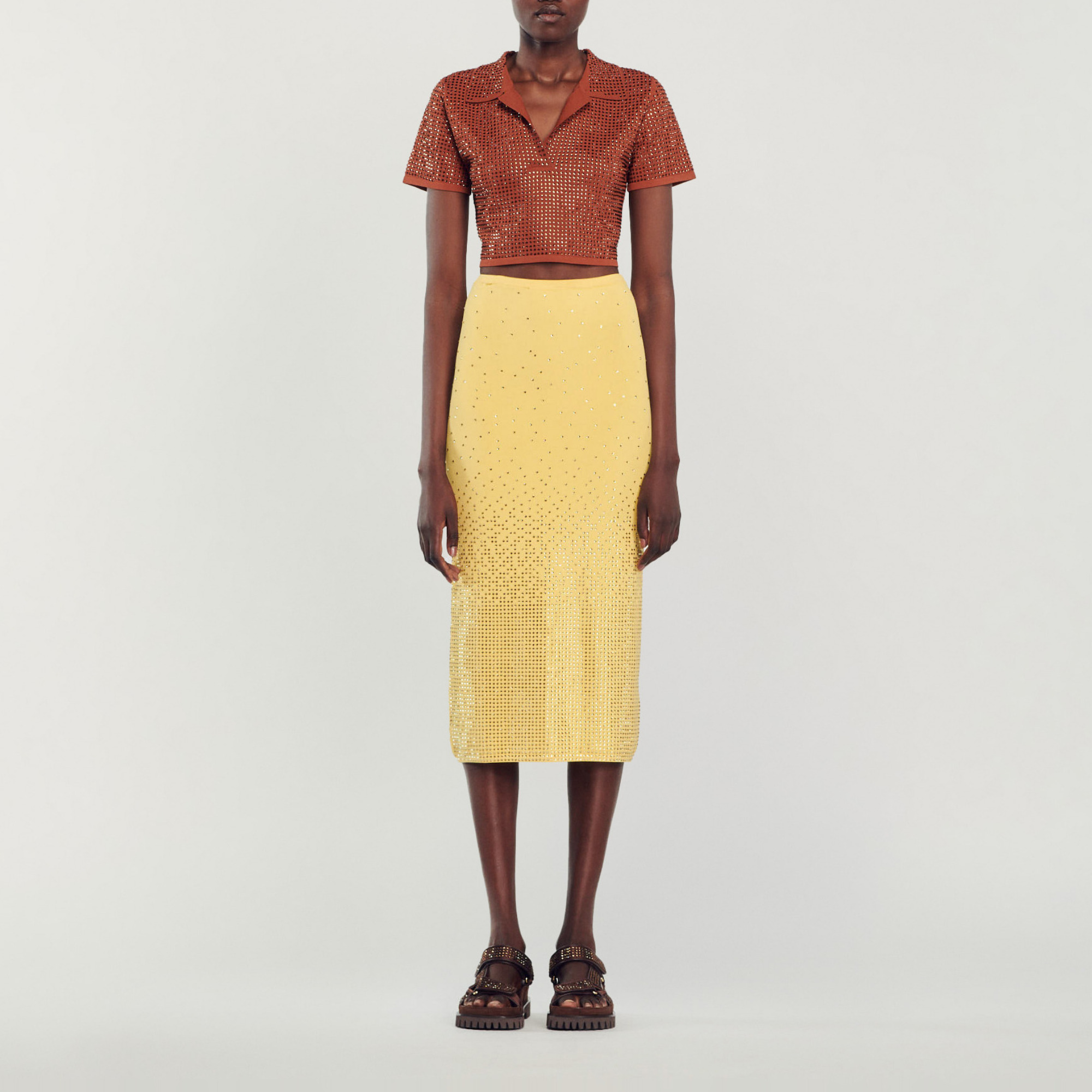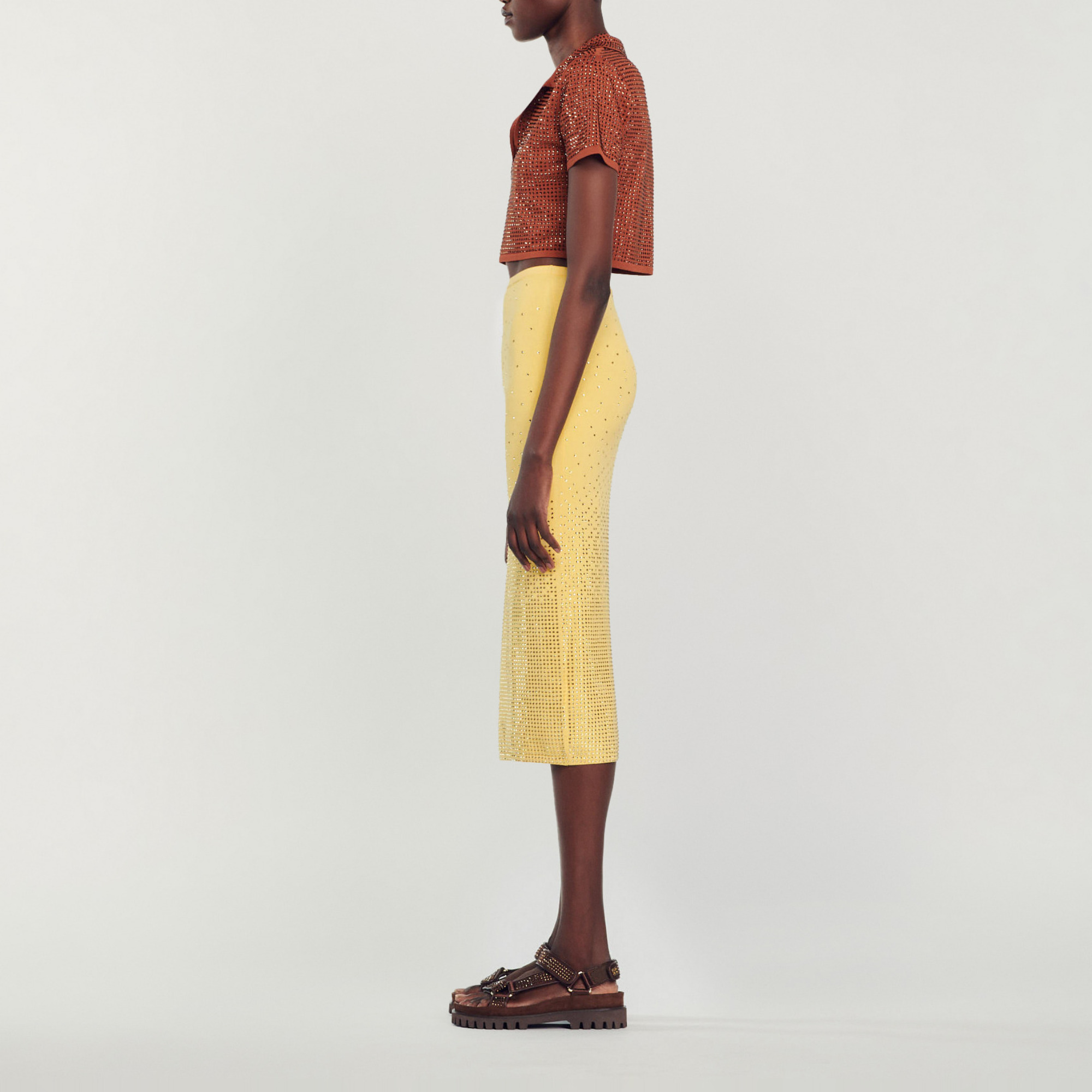 Sandro Women's midi skirt Stretch knit Pencil, figure-hugging cut Rhinestones Back slit This model runs small, we advise you to select the size based on your hip measurement.