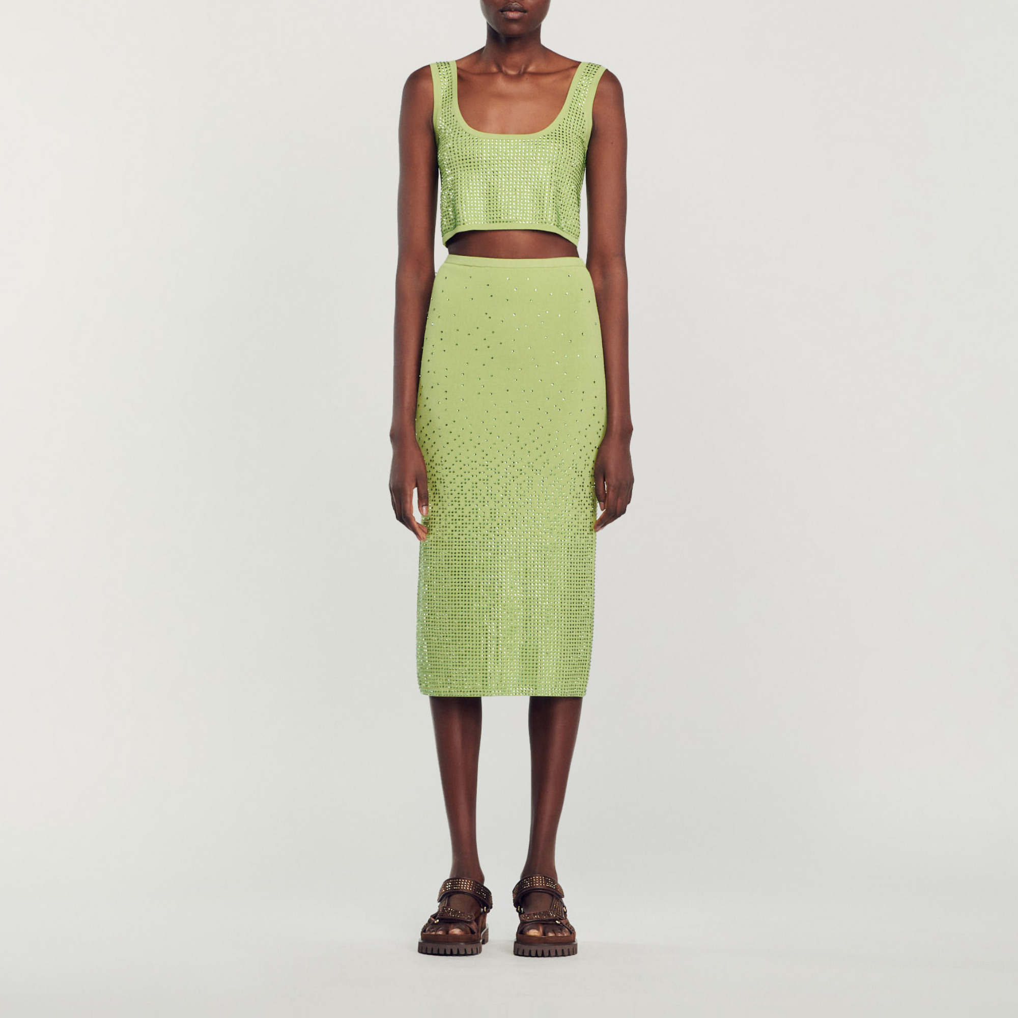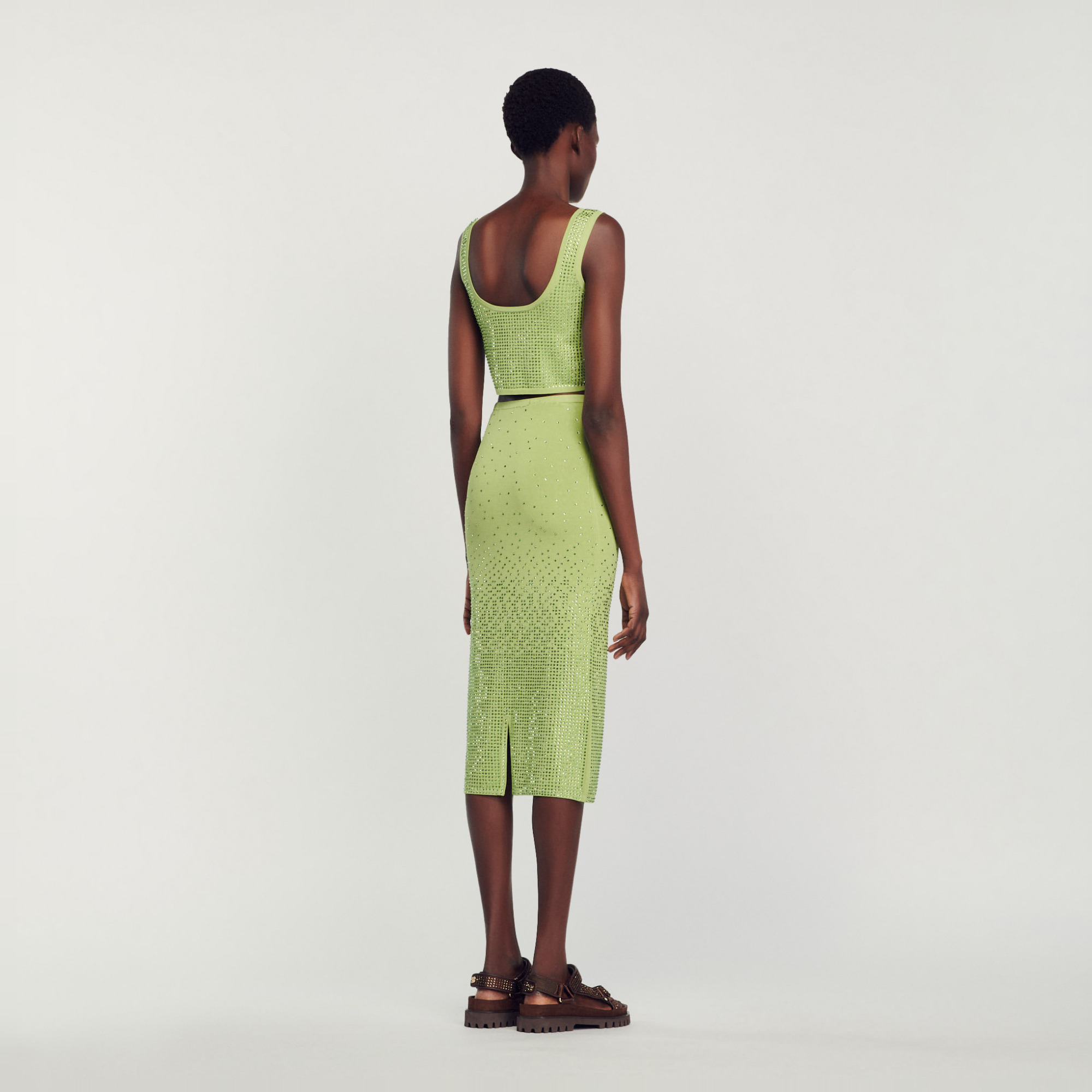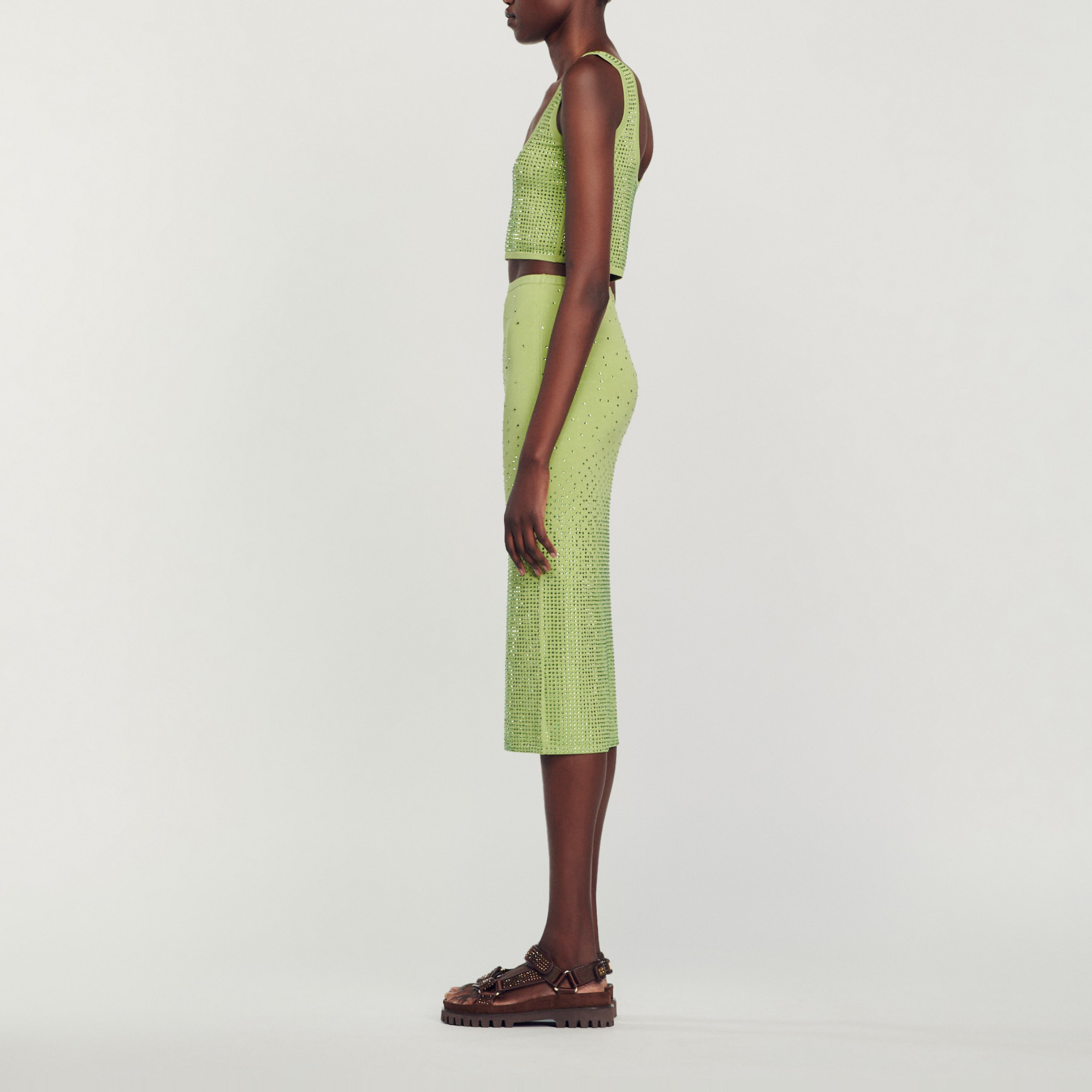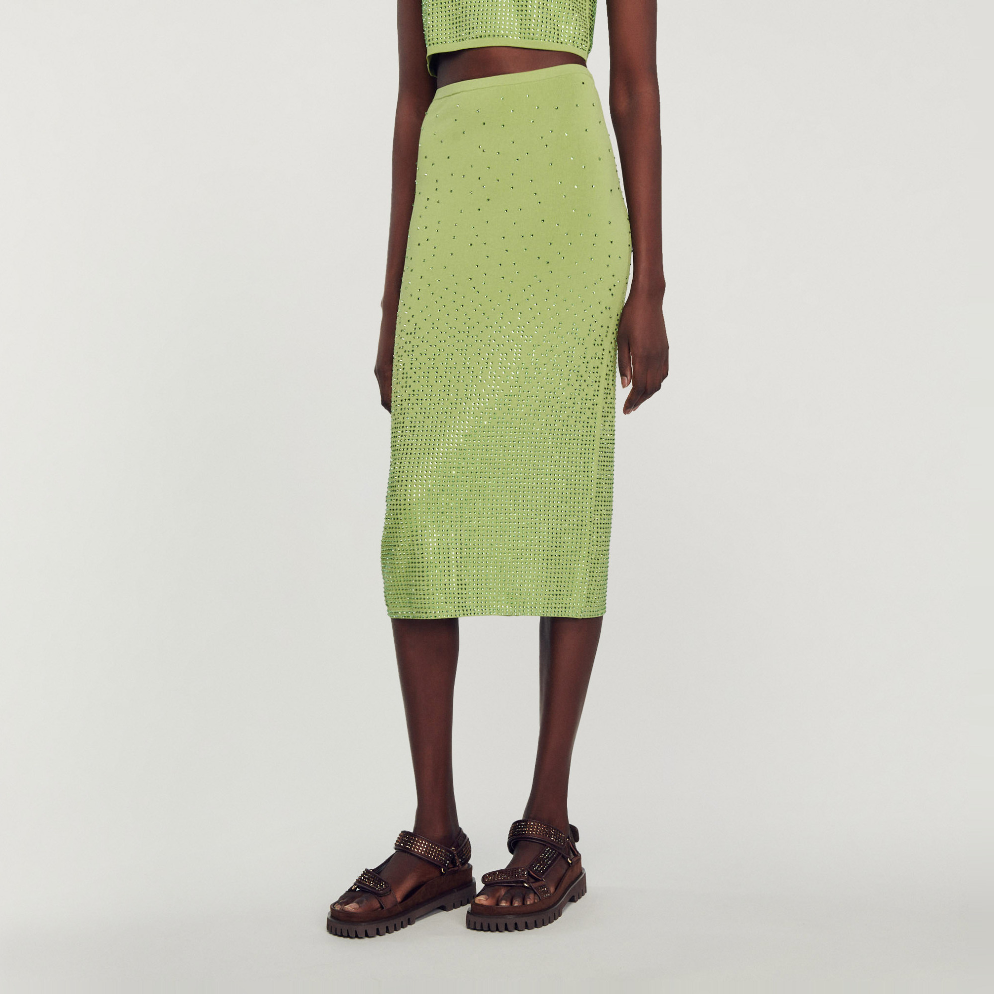 Sandro Women's midi skirt Stretch knit Pencil, figure-hugging cut Rhinestones Back slit This model runs small, we advise you to select the size based on your hip measurement.