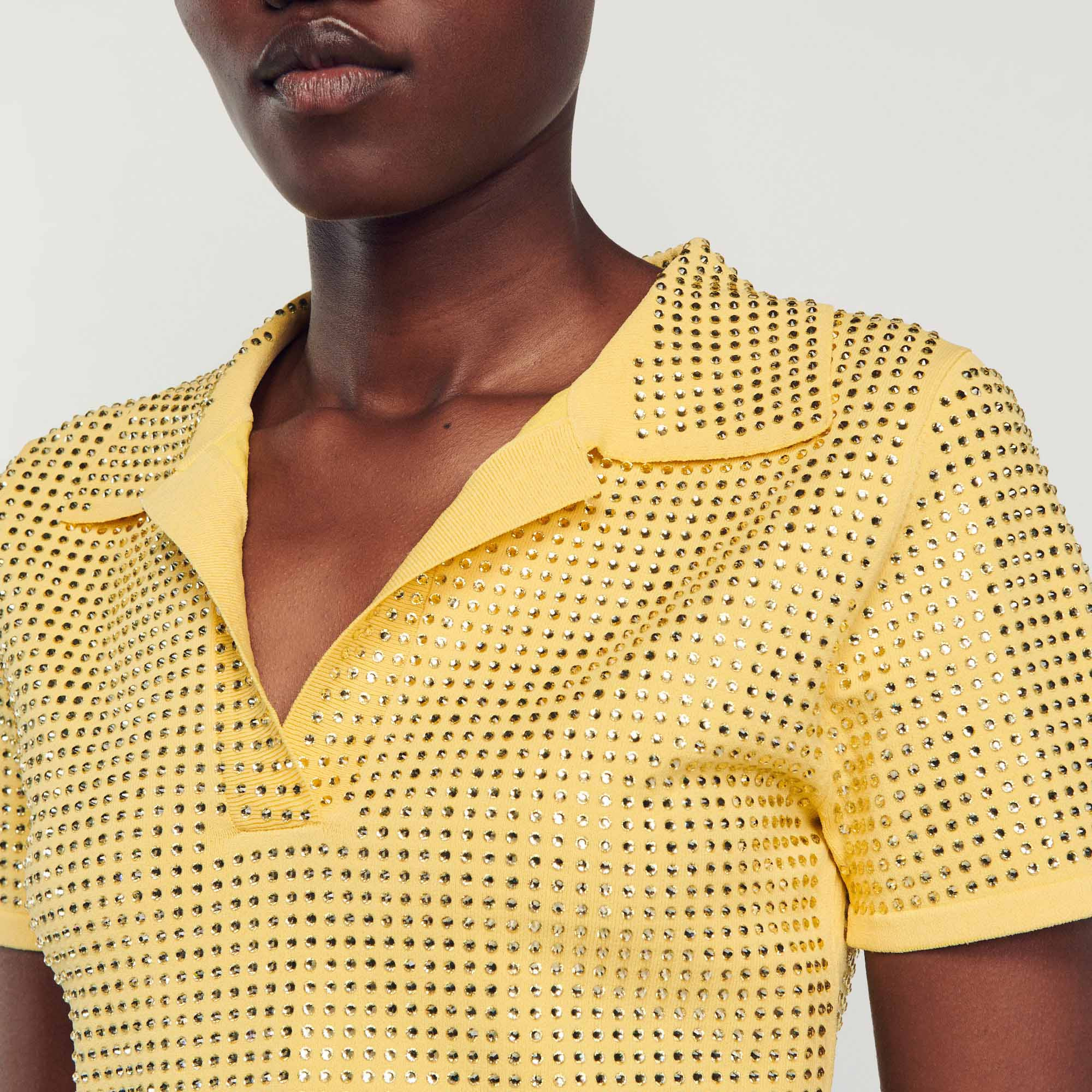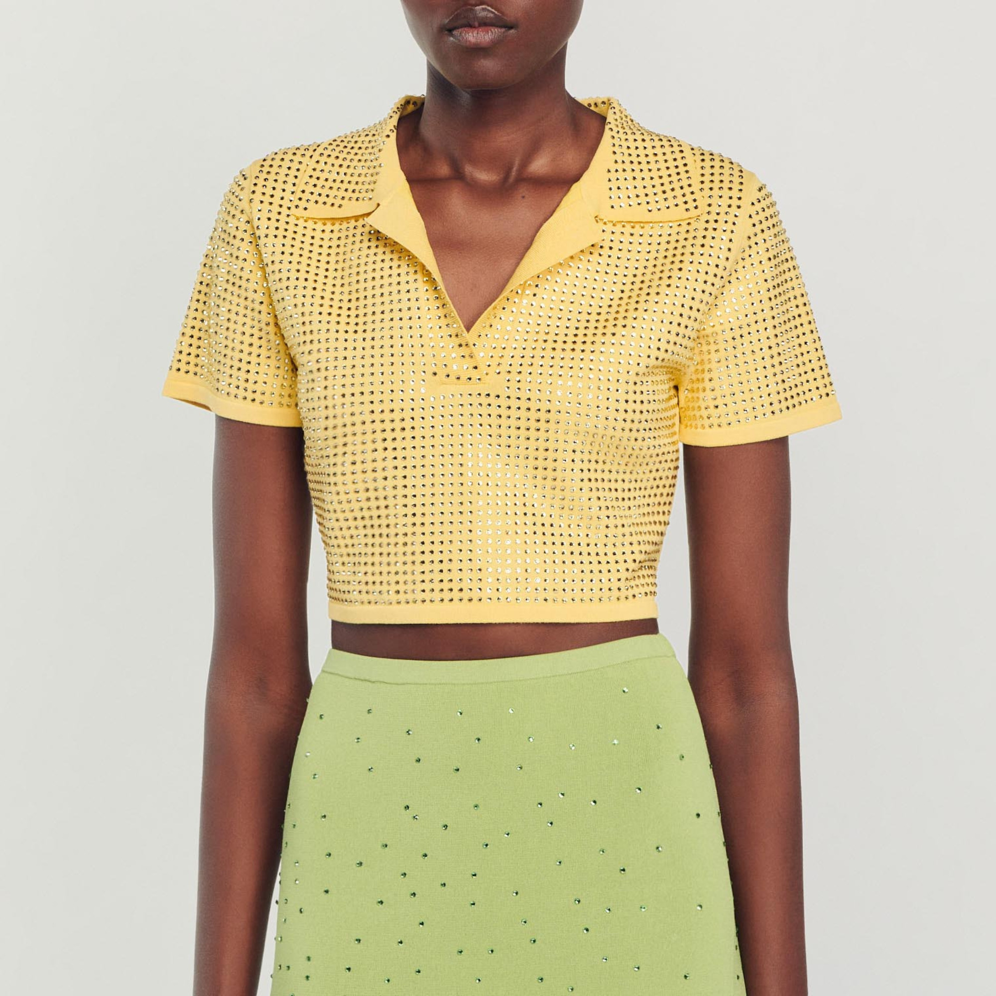 Sandro viscose Cropped polo collar top with short sleeves and tone-on-tone all-over rhinestone embellishment.