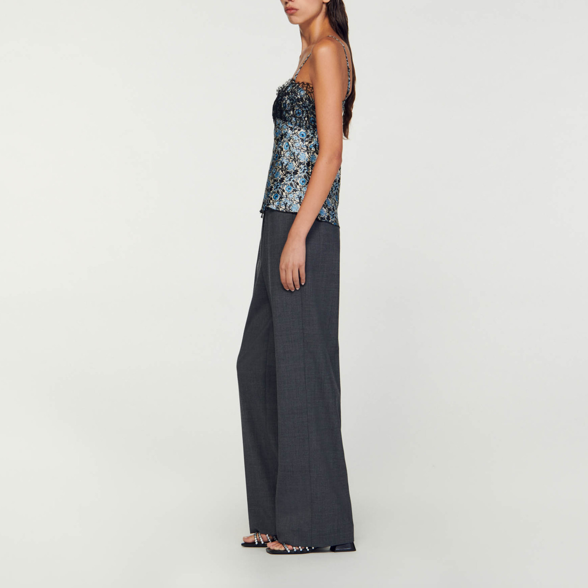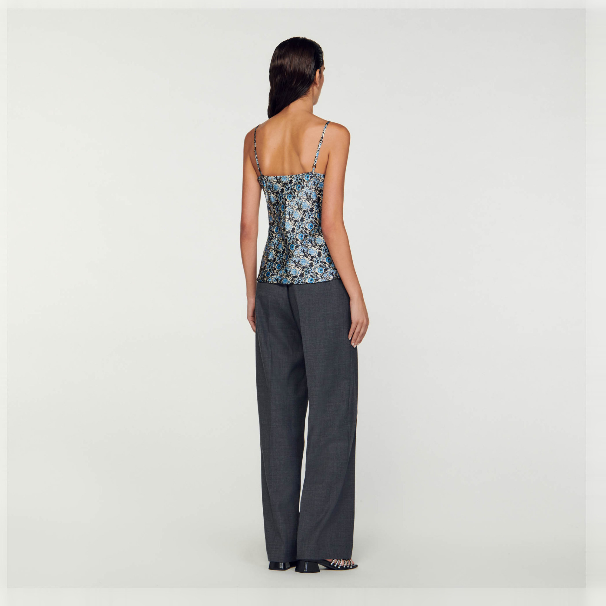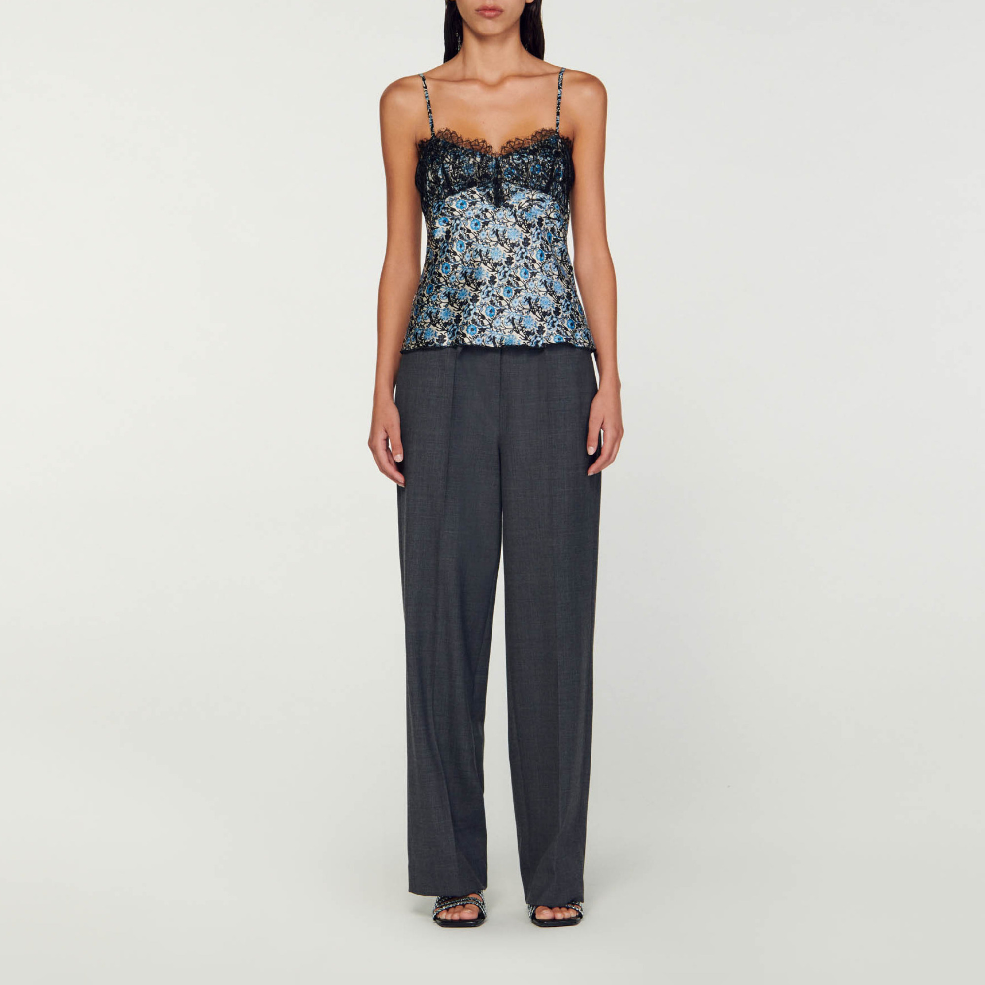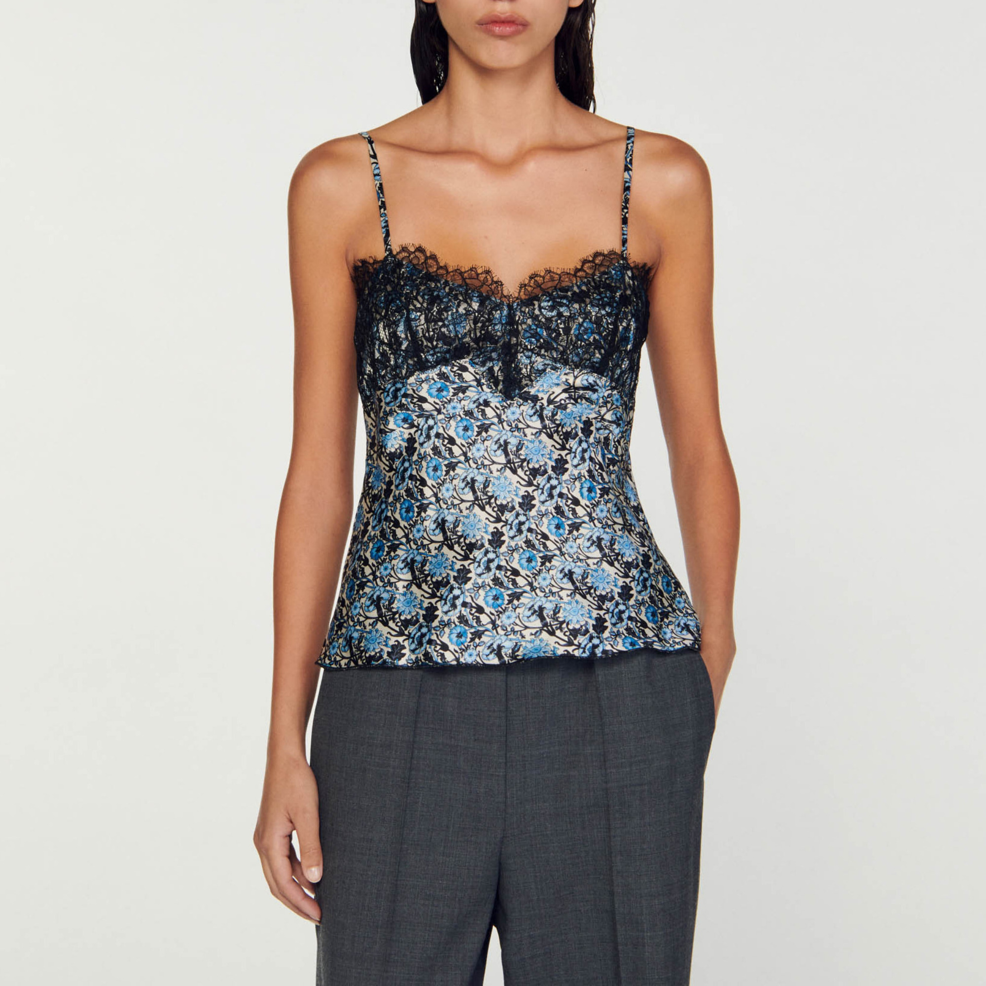 Sandro Women's flowing camisole Narrow adjustable straps Contrasting lace on the neckline Blue Blossom print The viscose in this item is made of cellulose from sustainably managed forests..