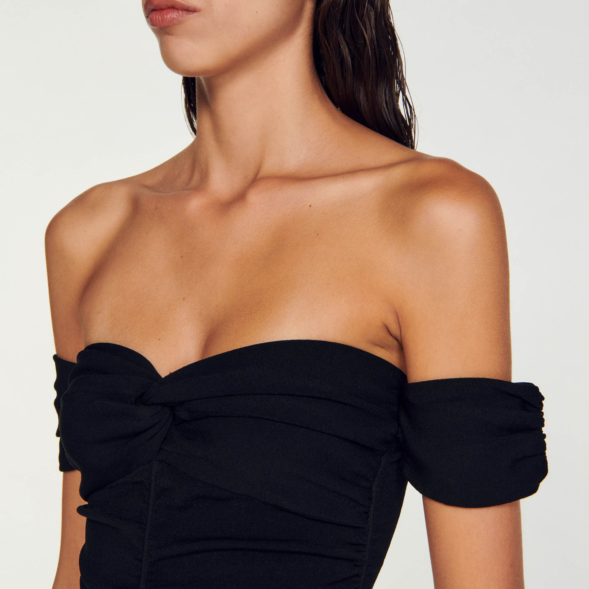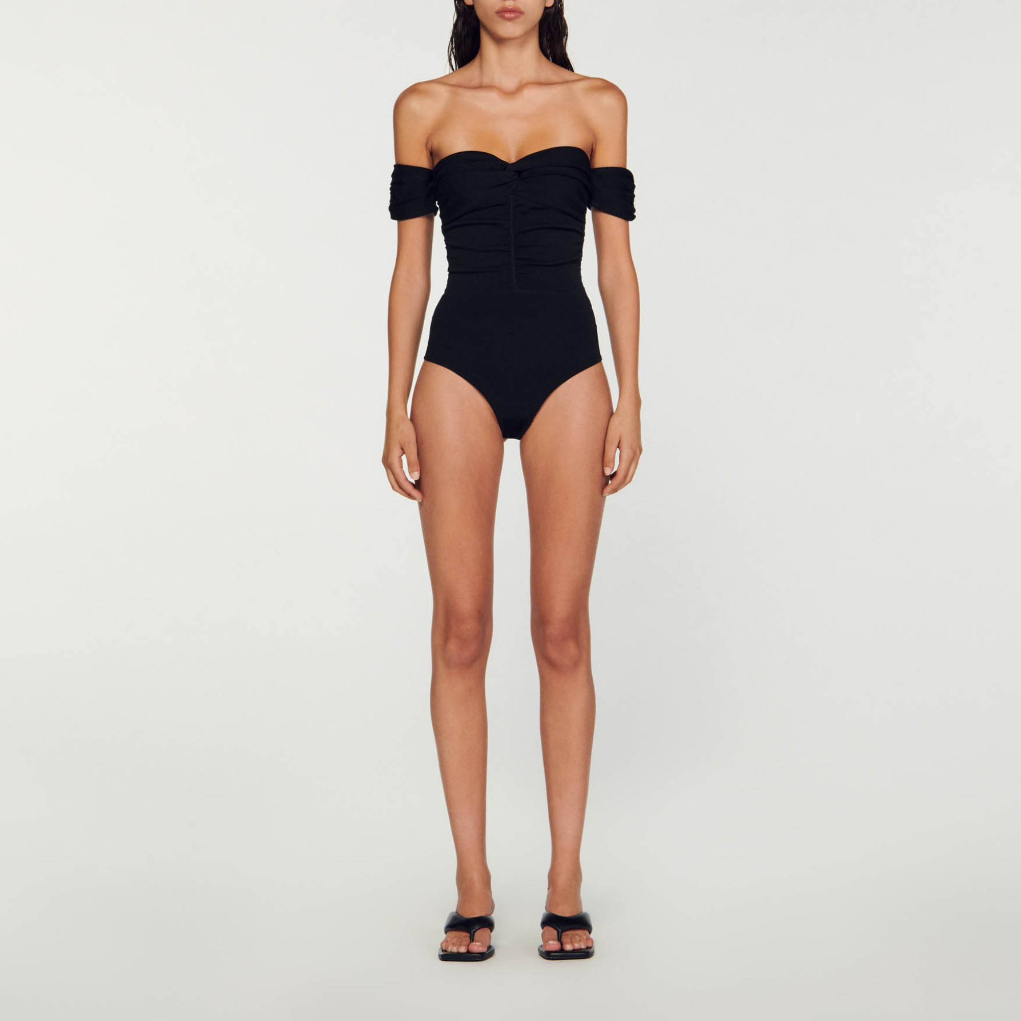Sandro viscose Bodysuit with short off-the-shoulder sleeves, a draped detail on the neckline, and an open back.