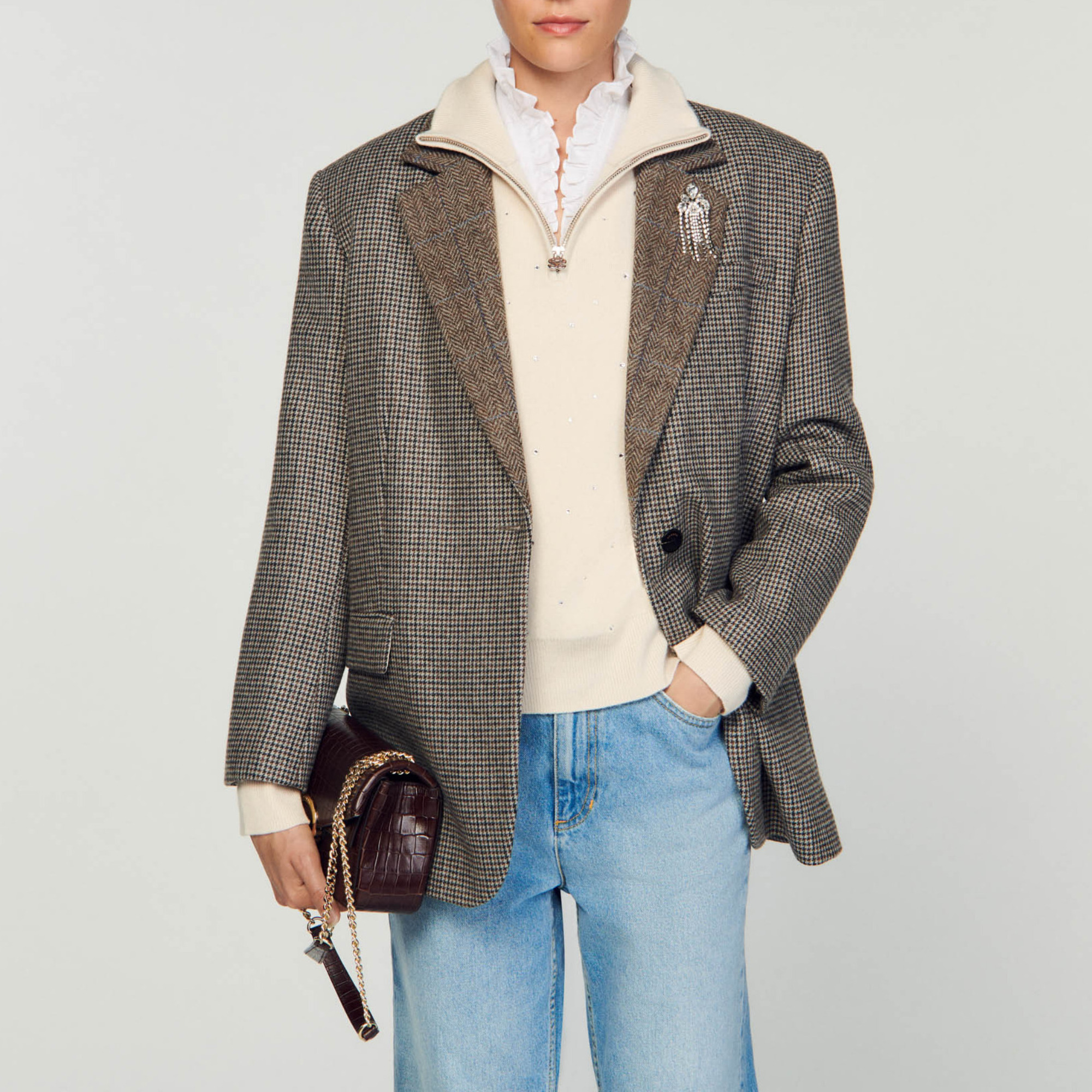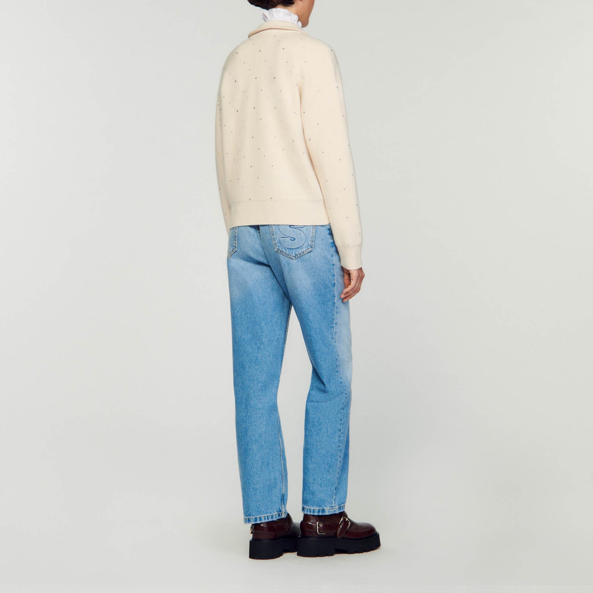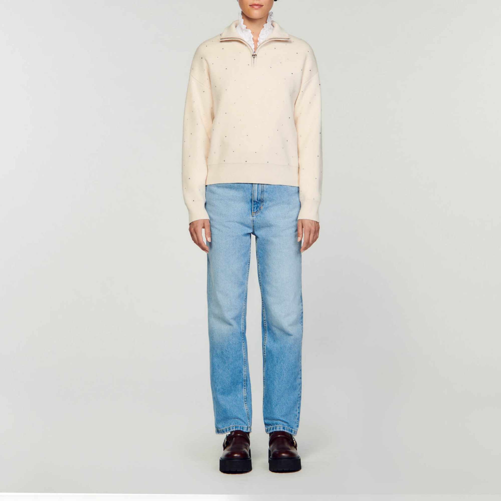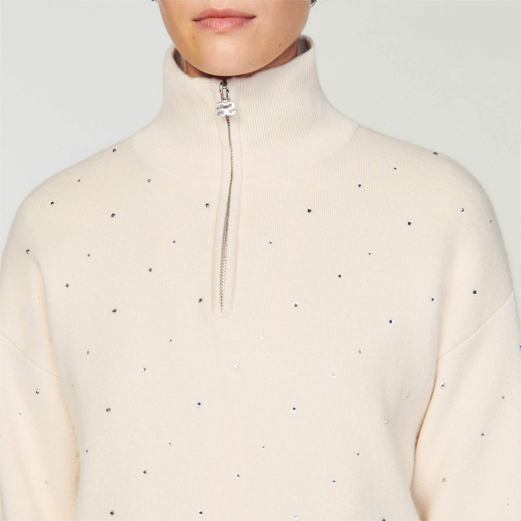 Sandro viscose Knit sweater embellished with rhinestones, made from a wool and cashmere blend, featuring a half-zip collar with double S zip and long sleeves.