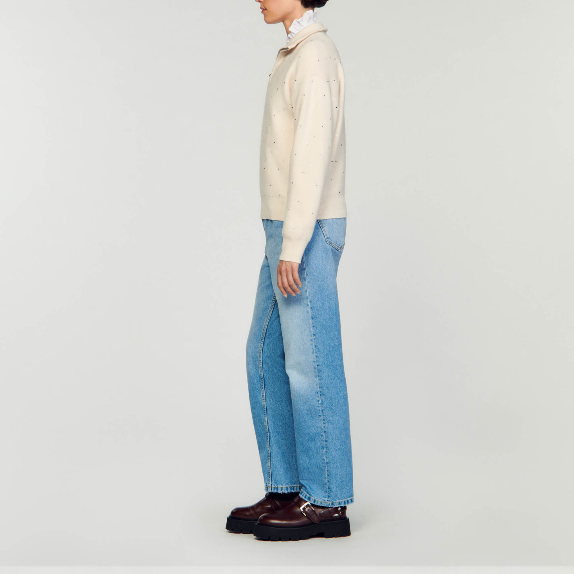 Sandro Women's blended knit sweater Half-zip neck Long sleeves Ribbed cuffs and bottom hem Rhinestones.