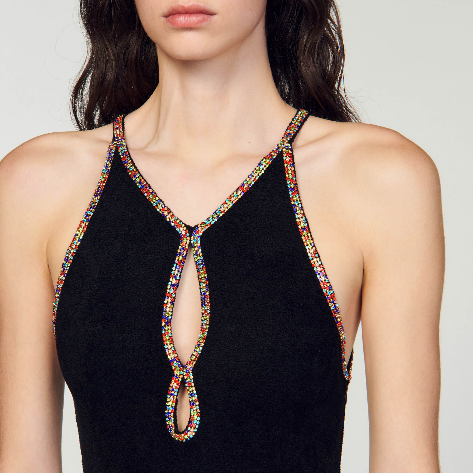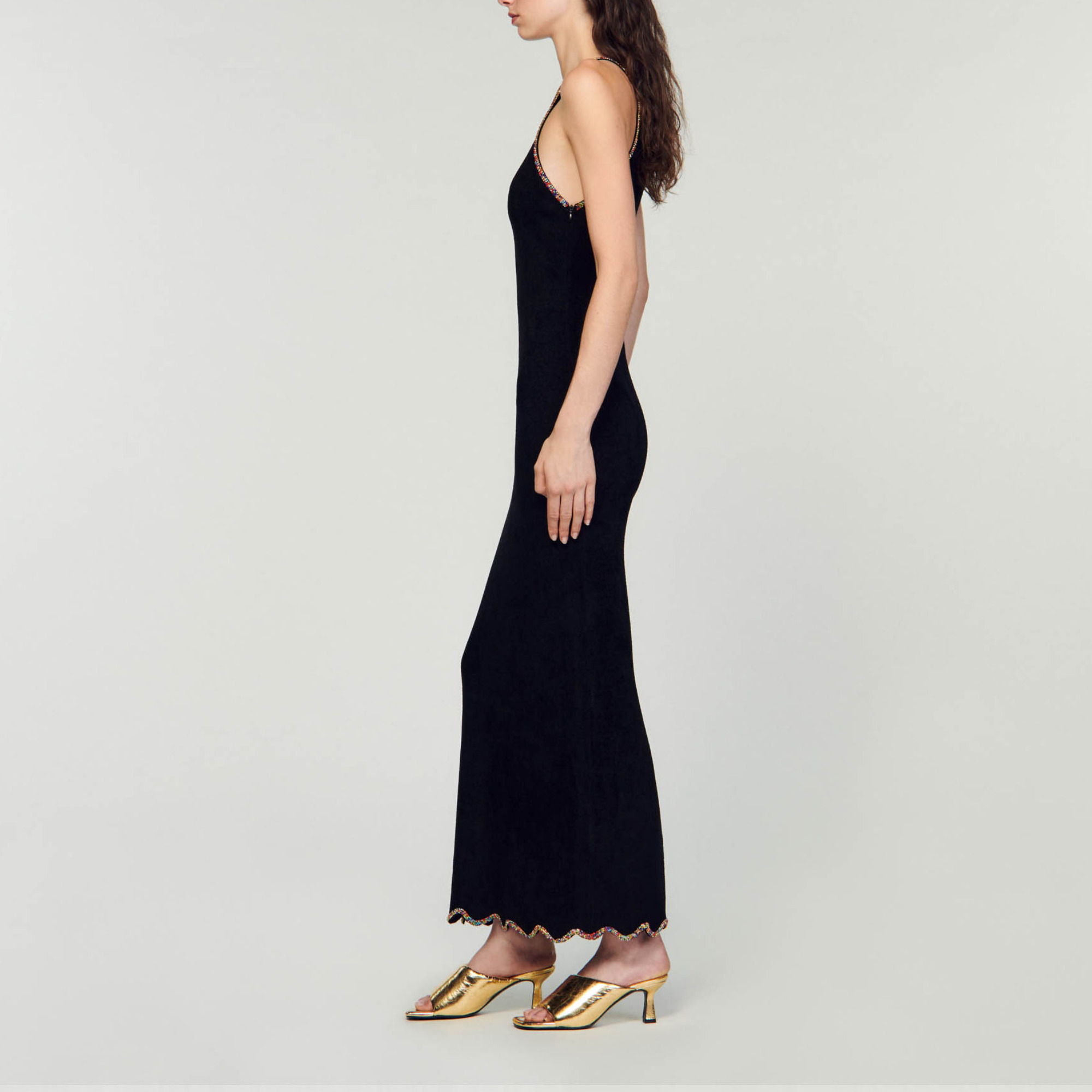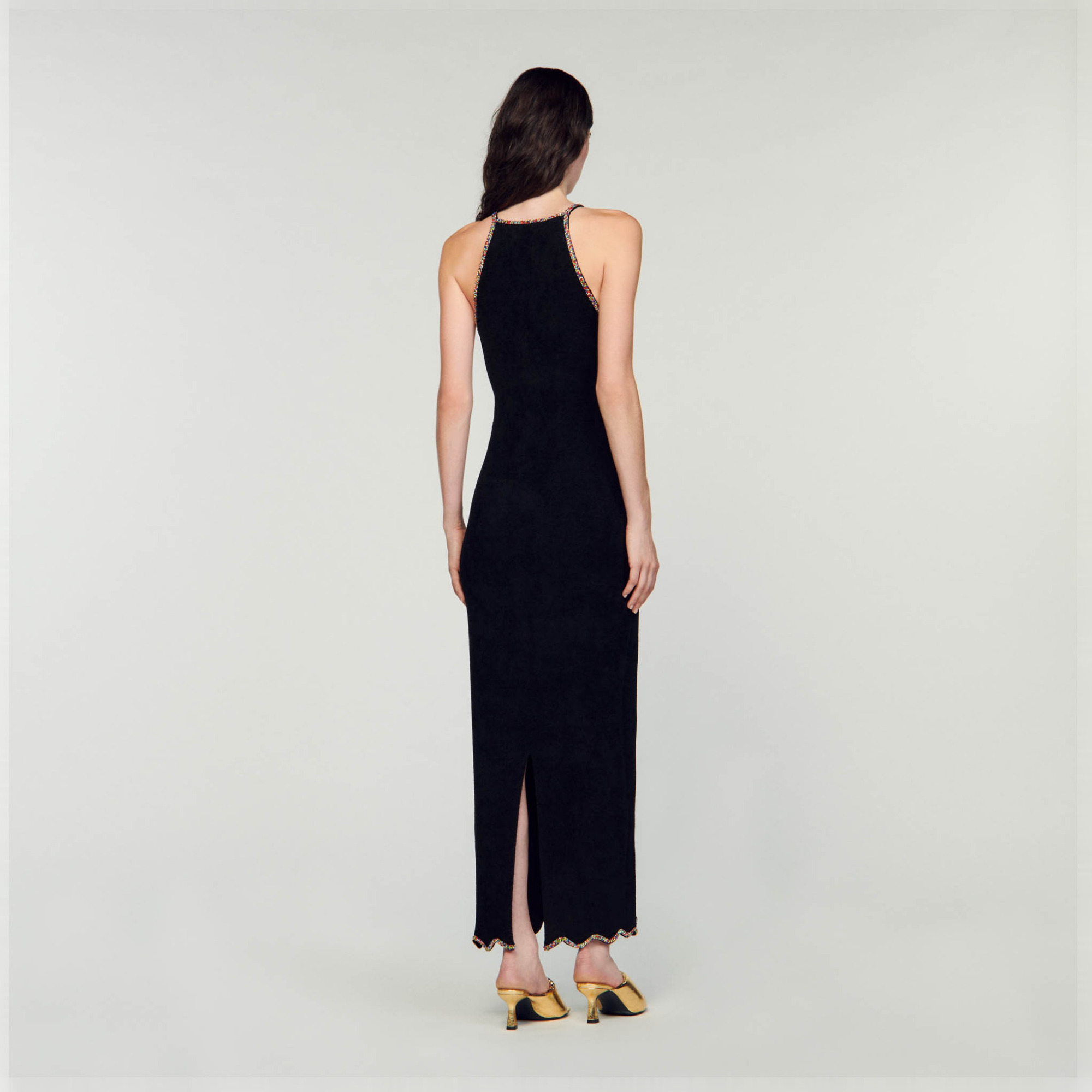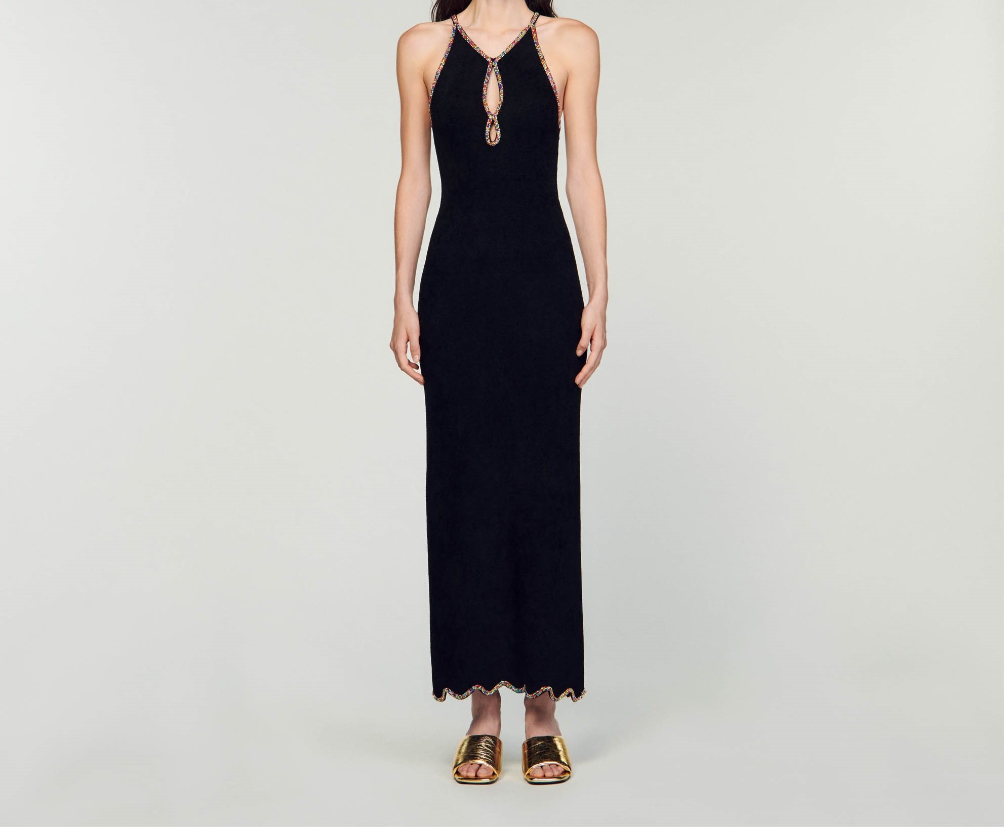 Sandro viscose Maxi dress in velvet knit with American-style armholes, featuring a neck with a cutaway teardrop embellished with multicoloured rhinestones and slit at the back.