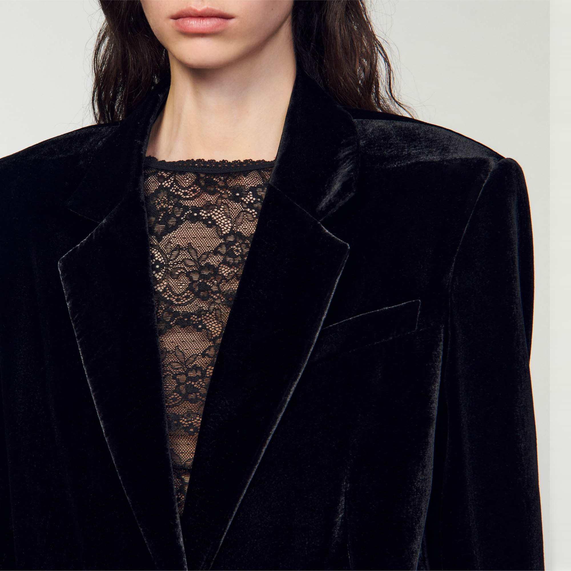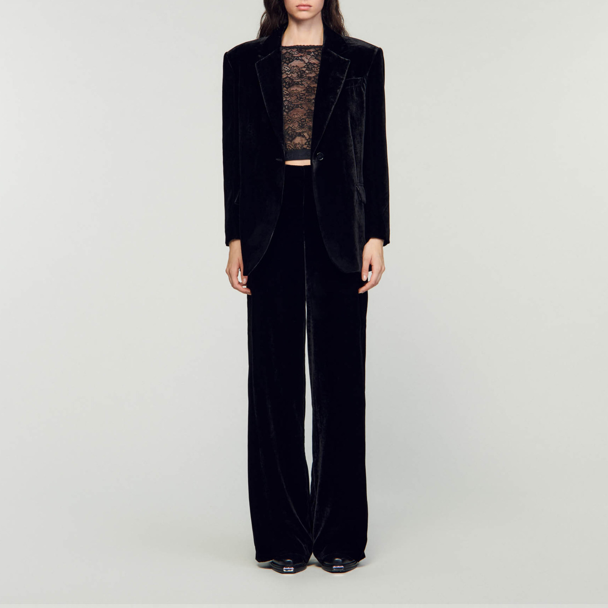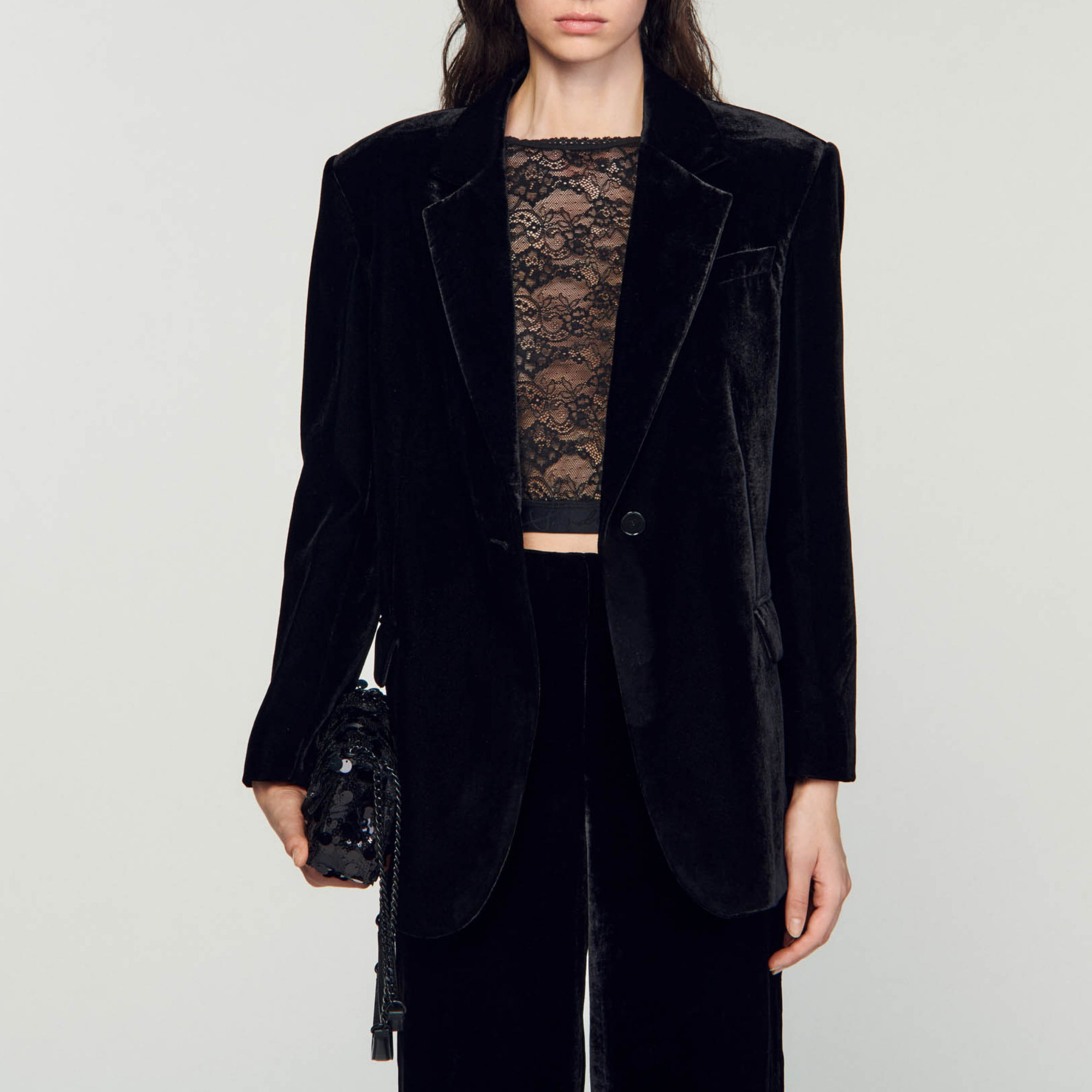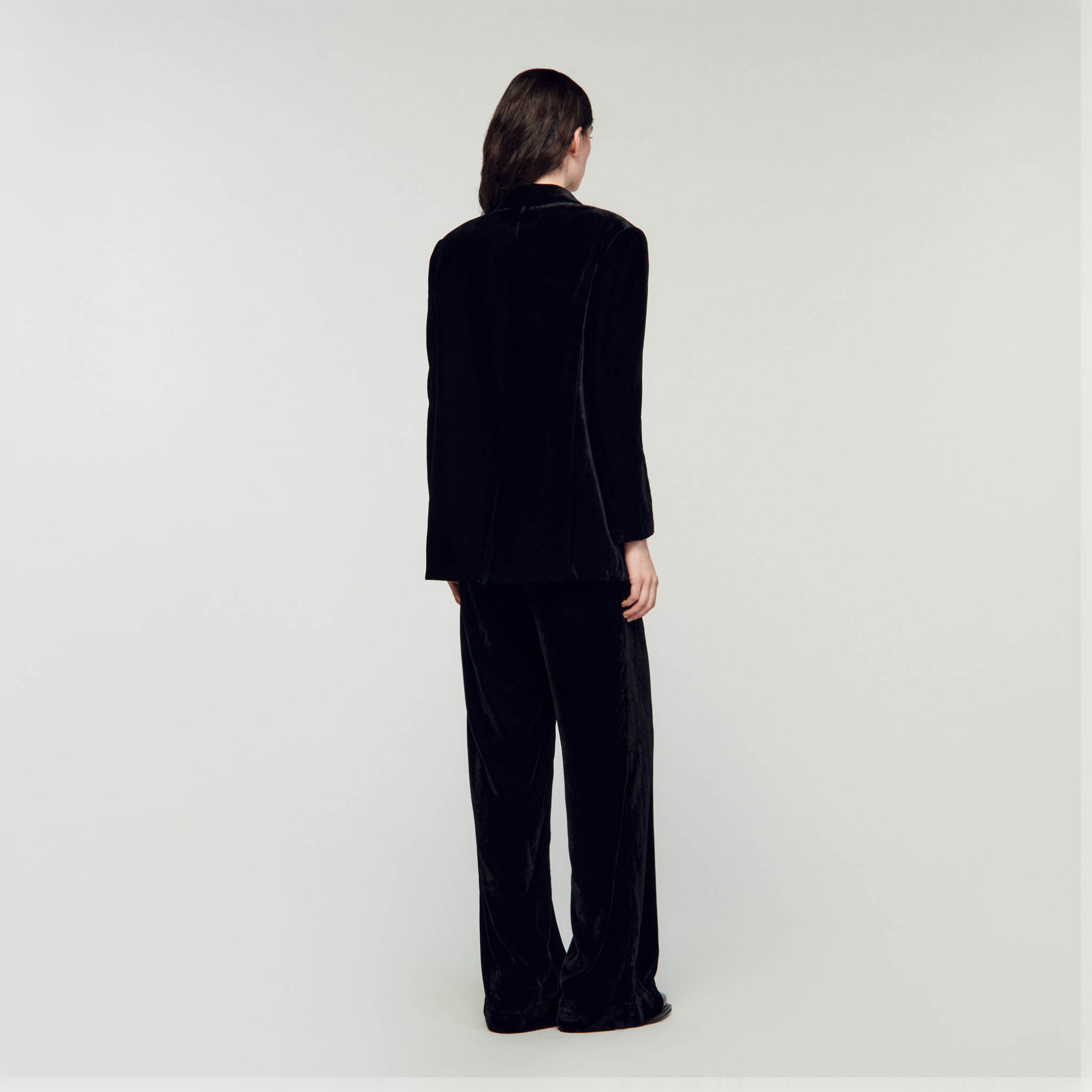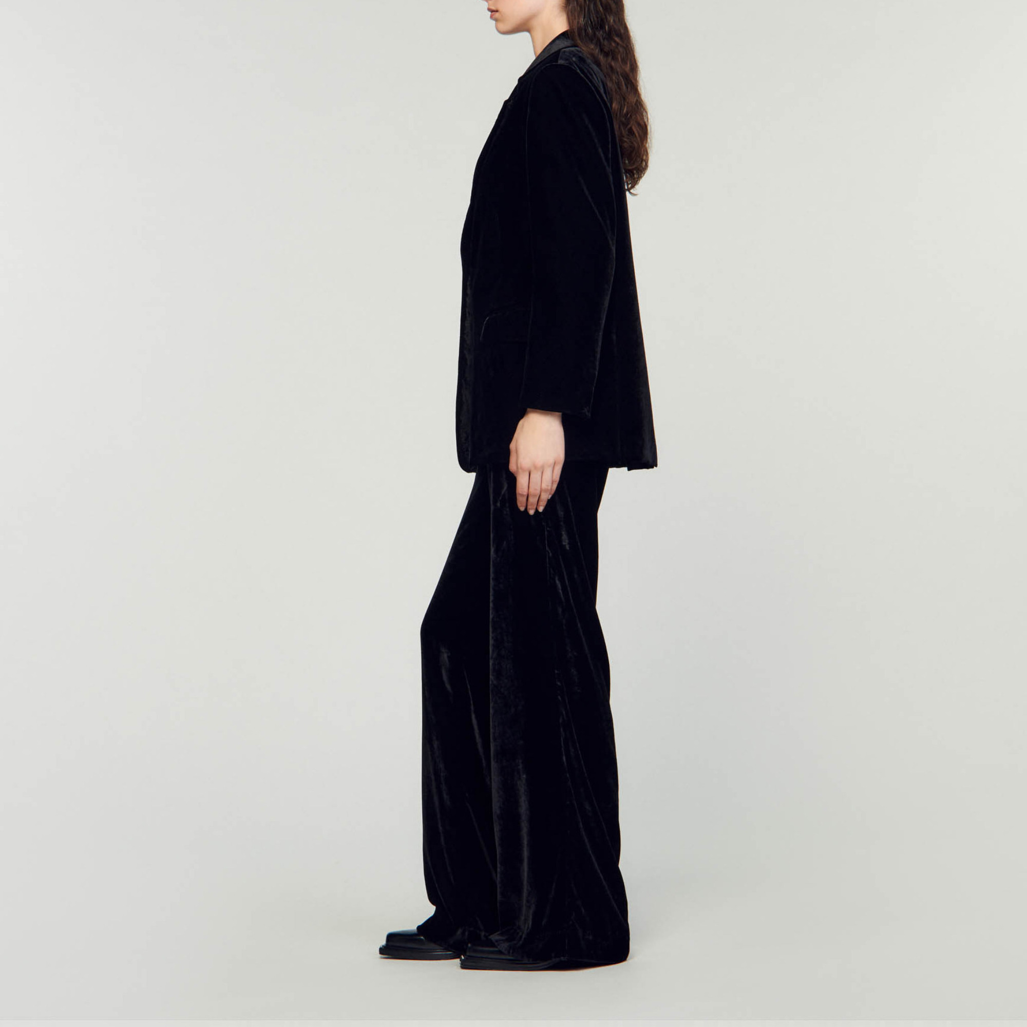 Sandro Women's velvet suit jacket Long sleeves 2 waist flap pockets Welt chest pocket Button fastening The model is 177 cm tall (5'8) and is wearing a size 36.