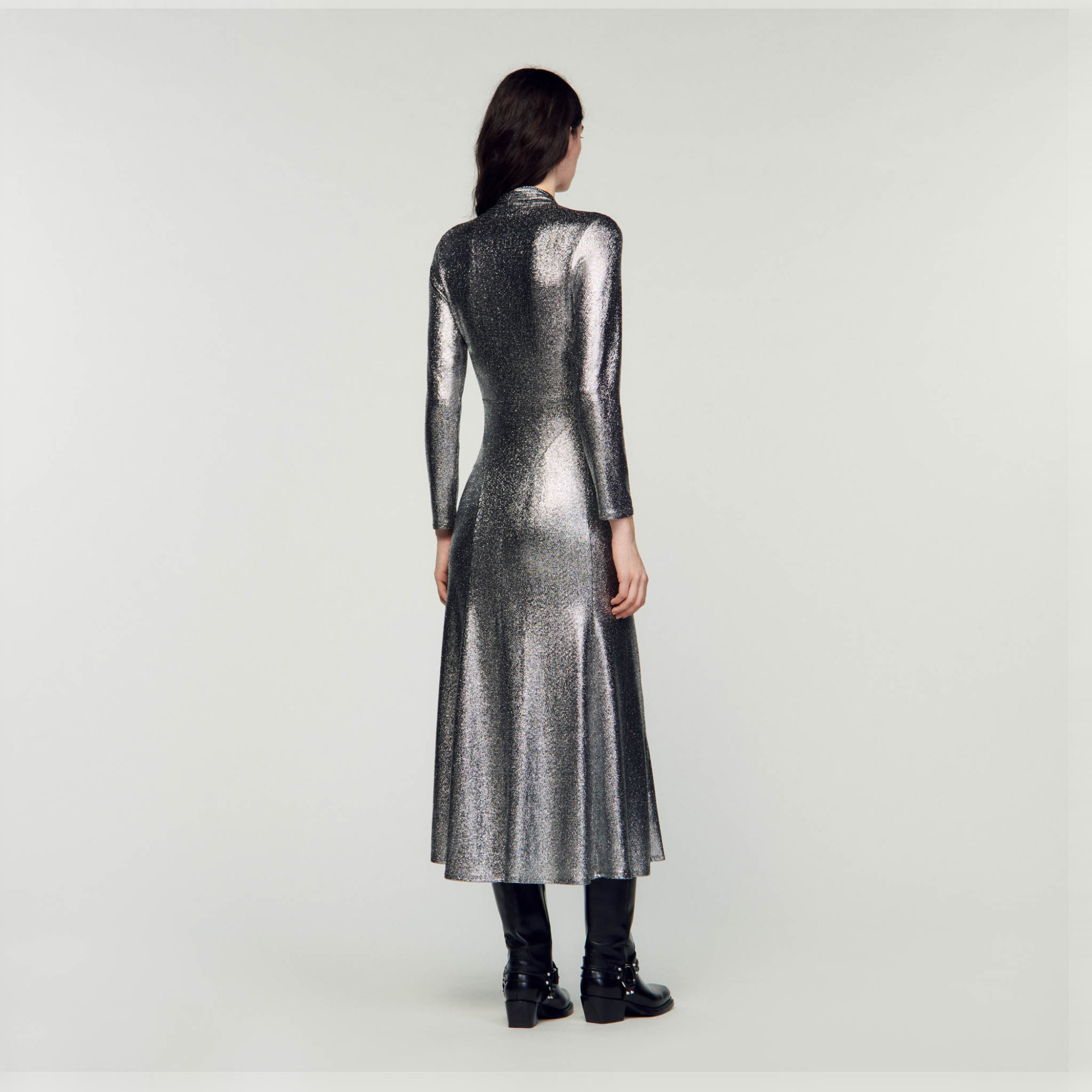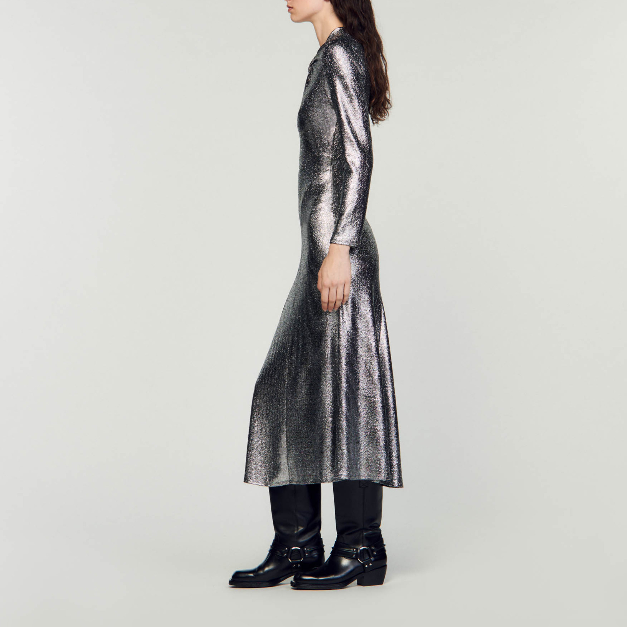 Sandro polyamide Metallic maxi dress featuring an openwork twist-effect high neck, long sleeves and a delicately flared skirt at the bottom.