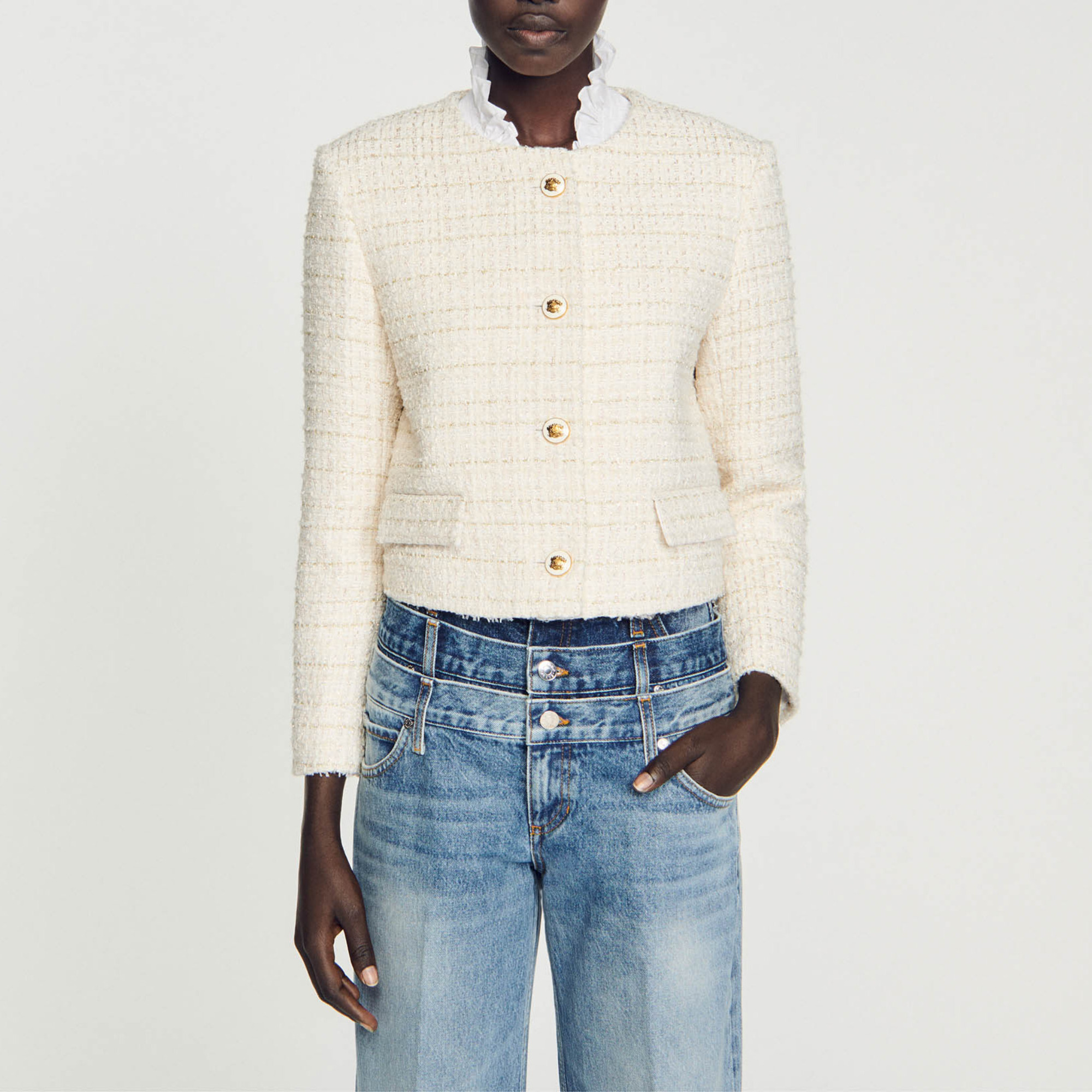 Sandro polyester Cropped decorative tweed jacket with a round neck, long sleeves with cuff slits and a decorative button fastening.