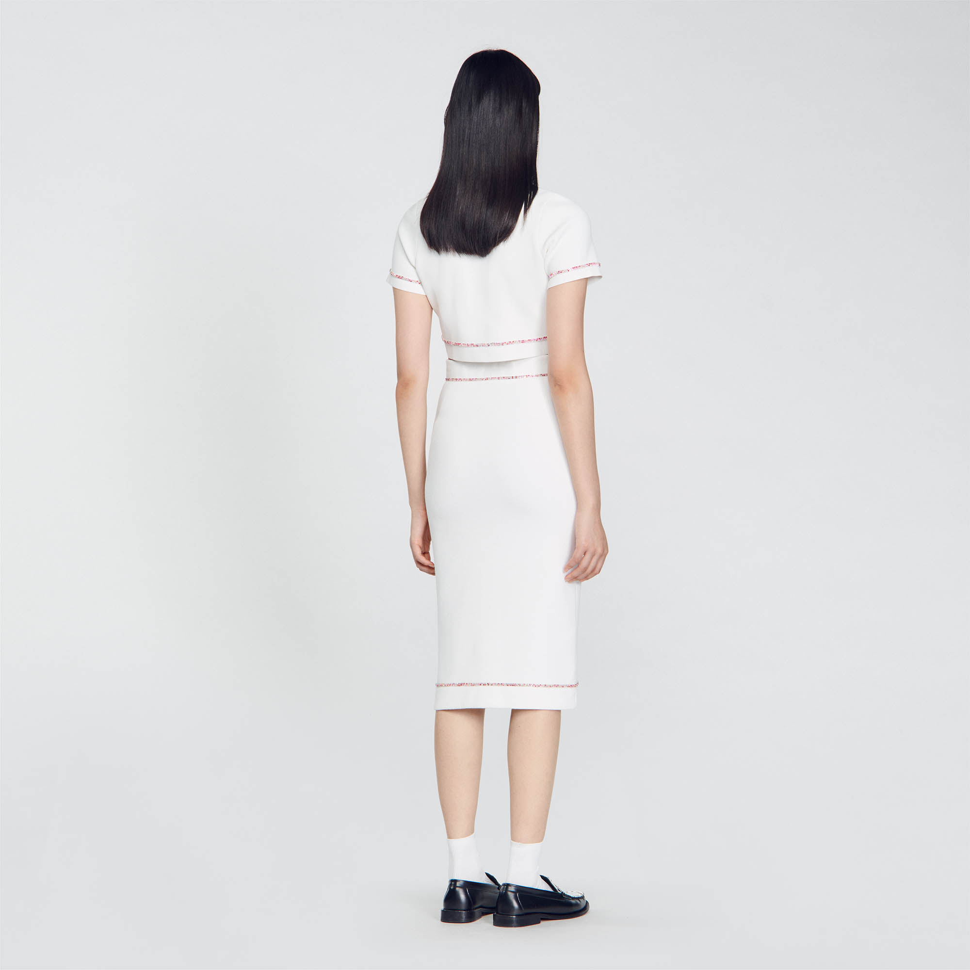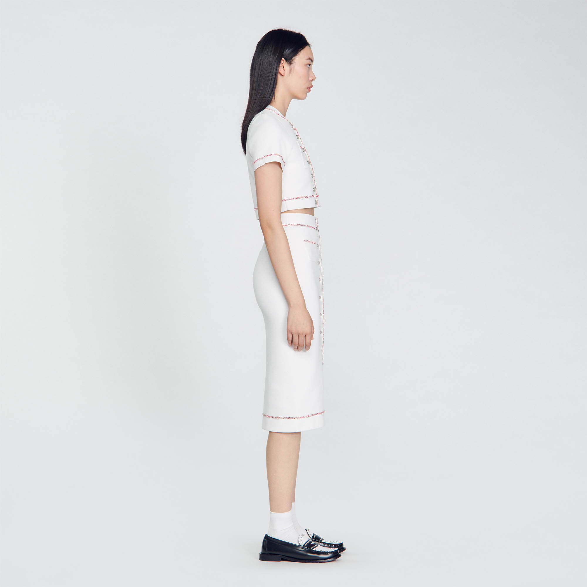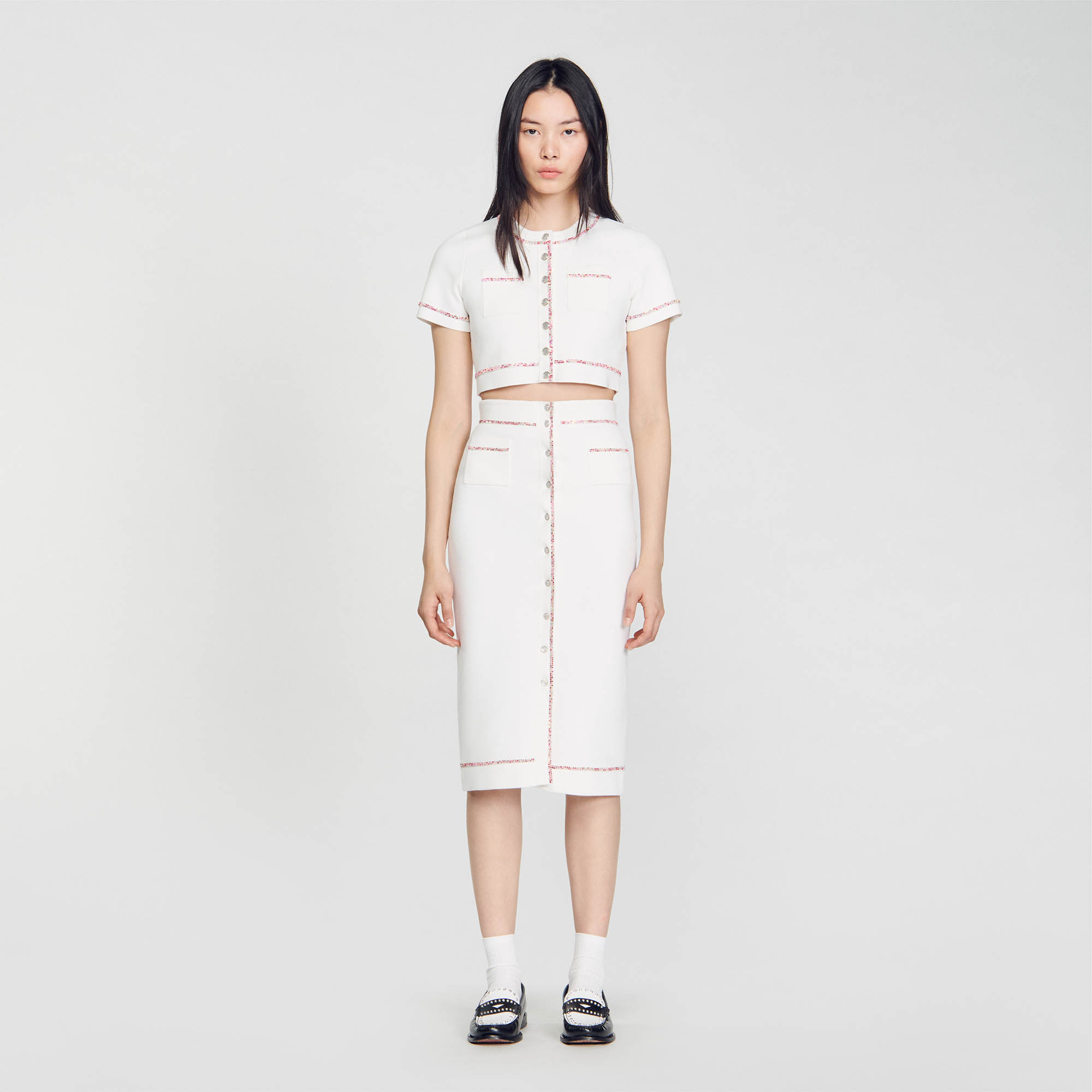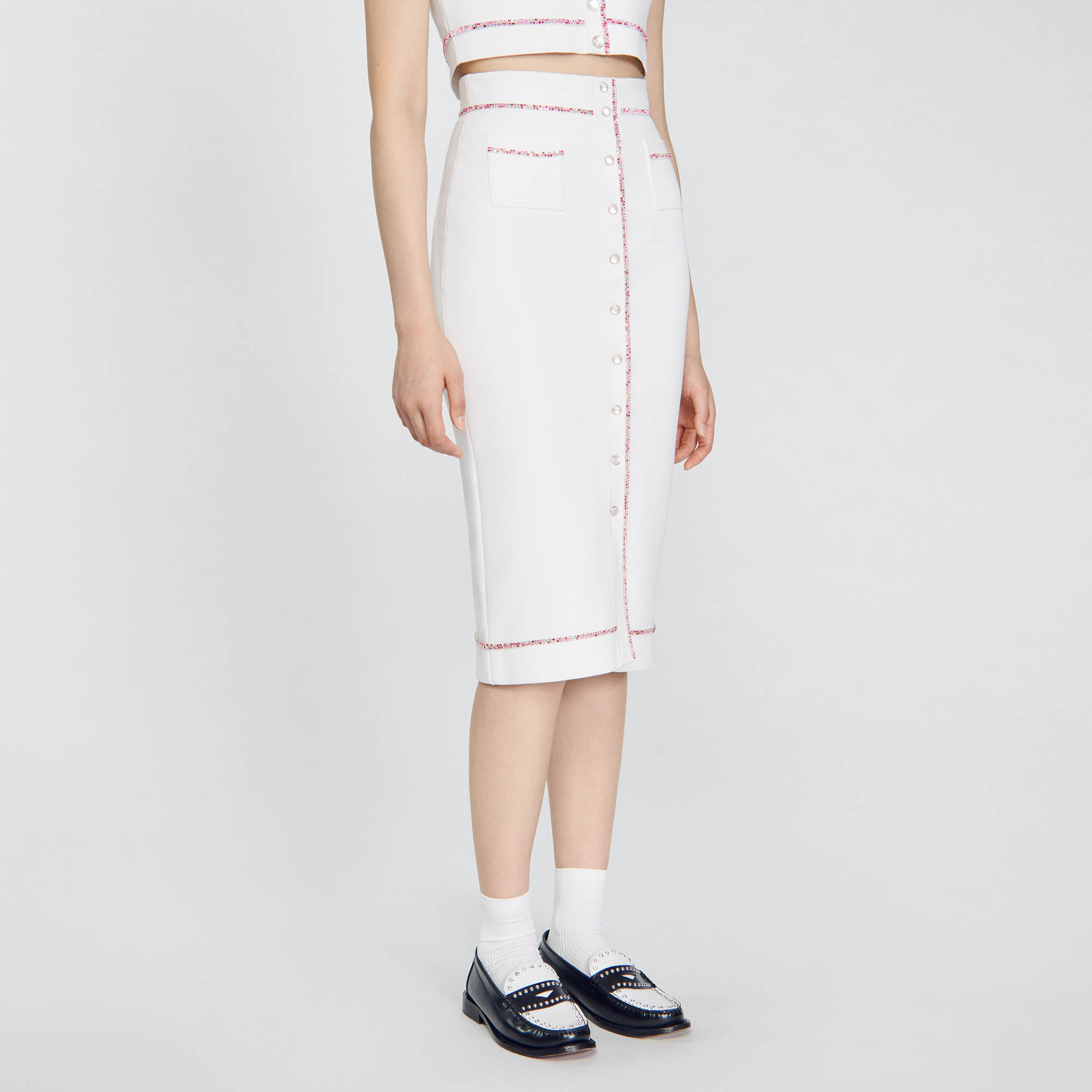 Sandro Women's midi pencil skirt Button fastening Multicoloured rhinestones Patch pockets This skirt matches the cardigan.