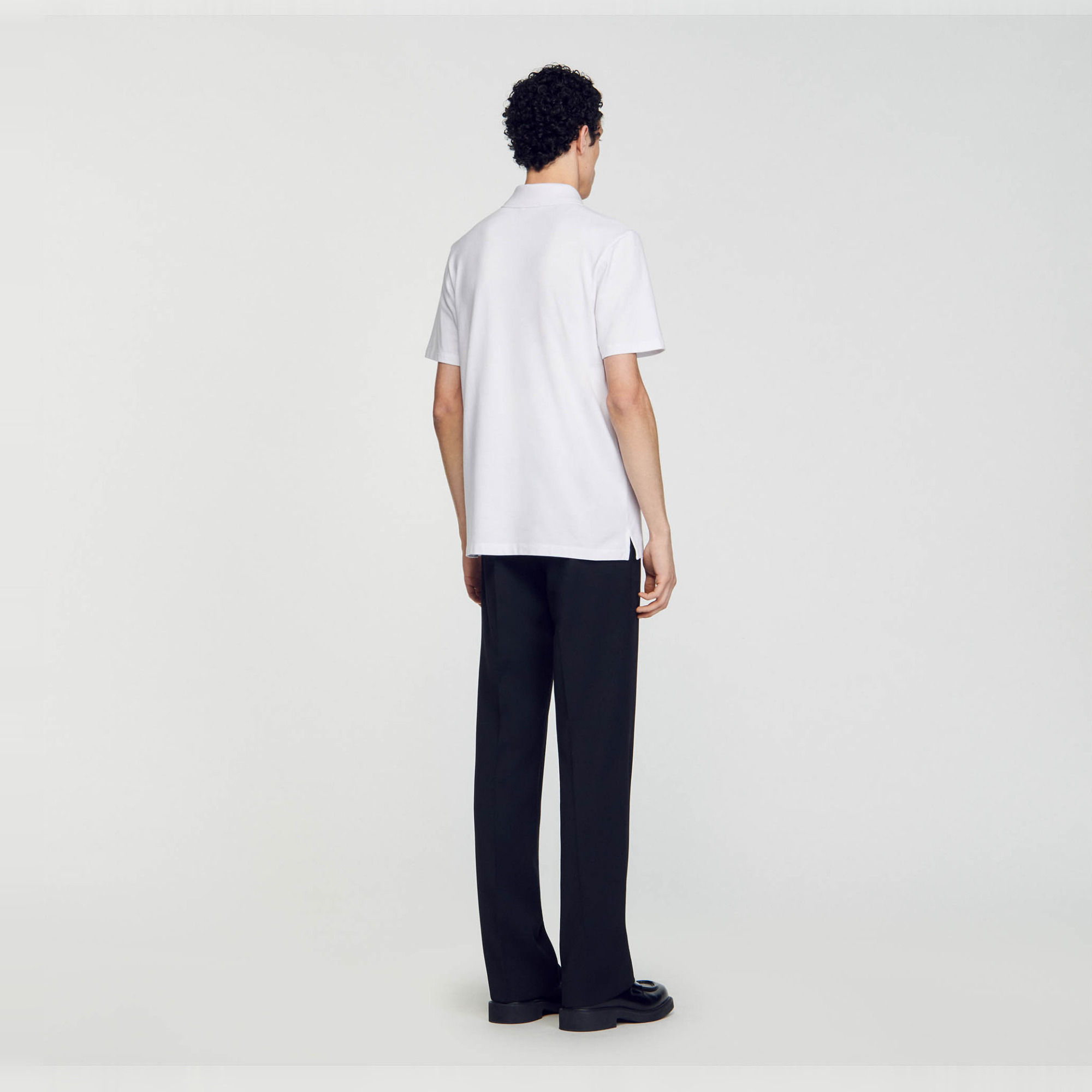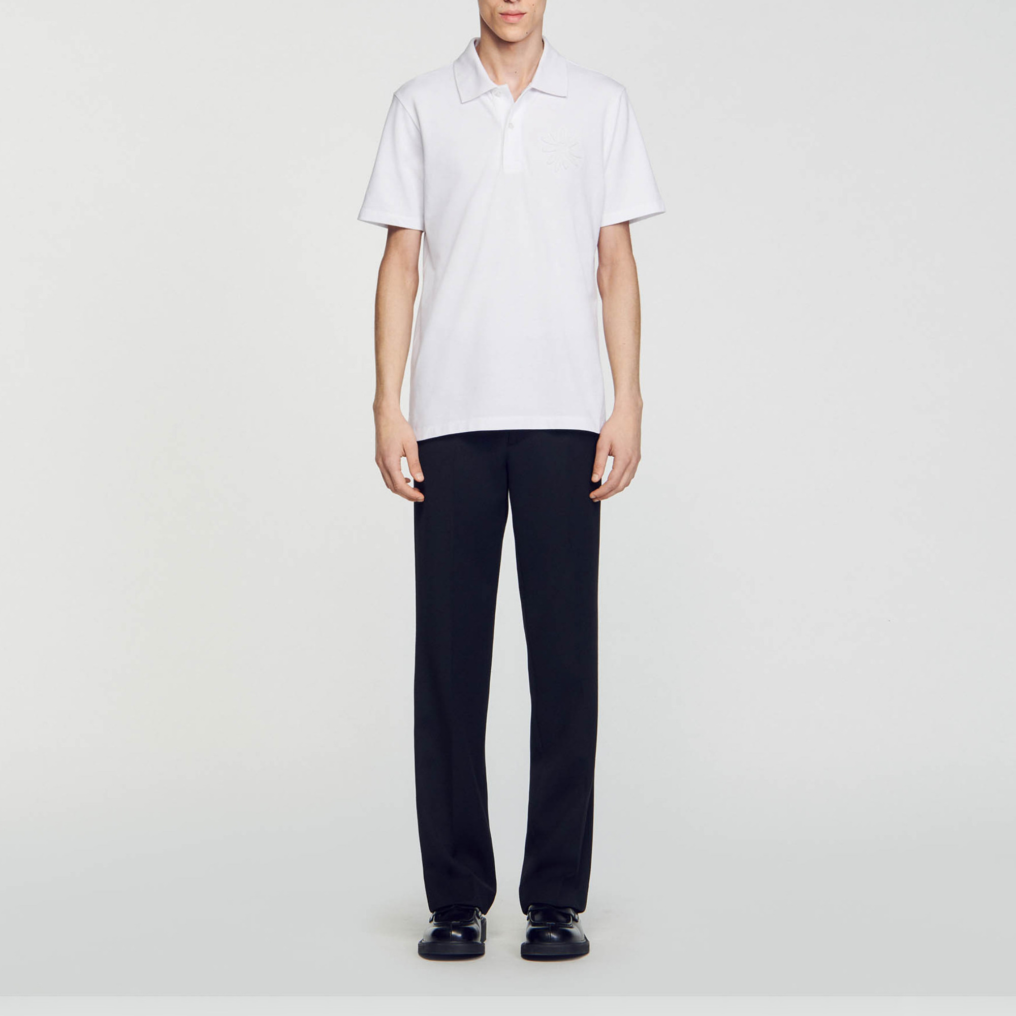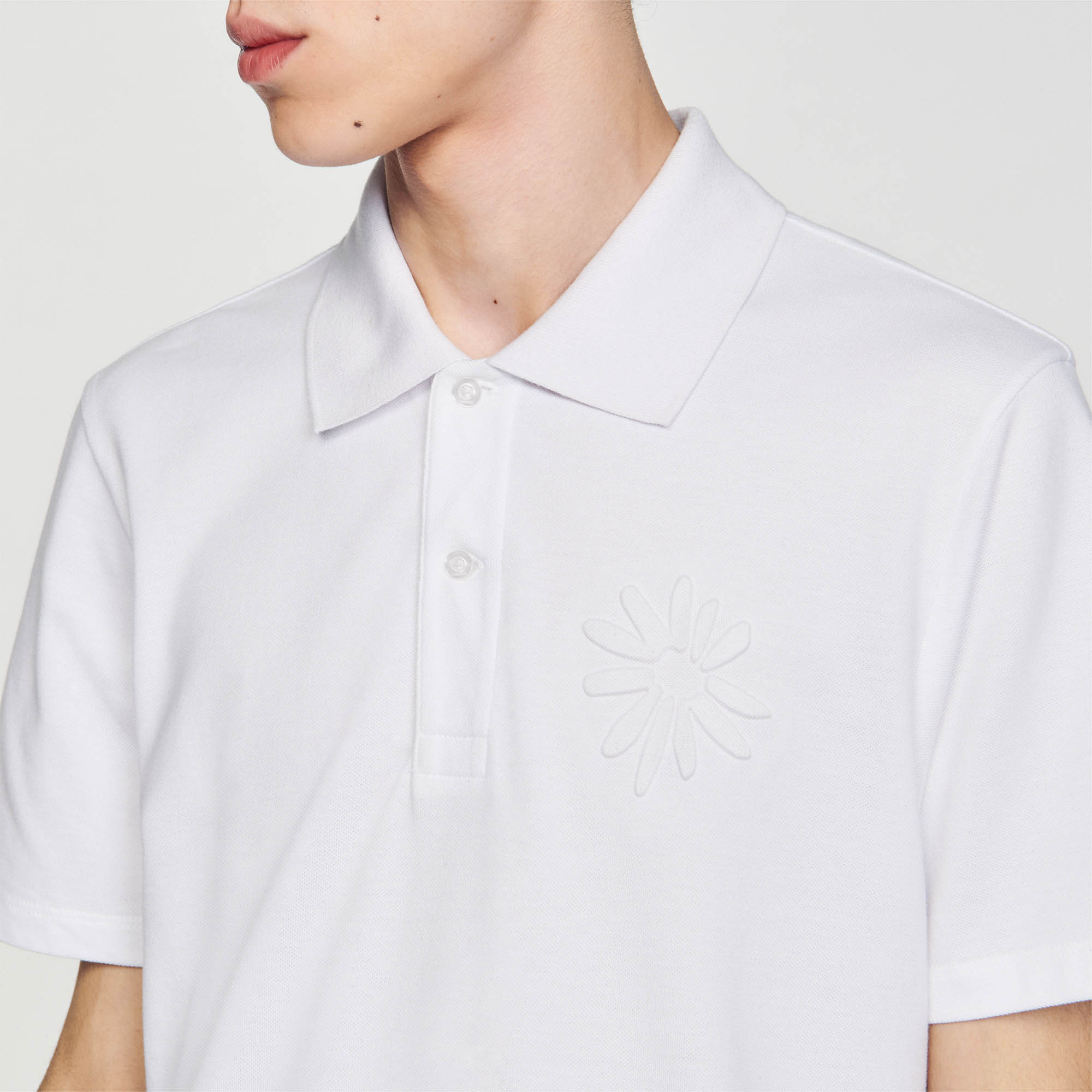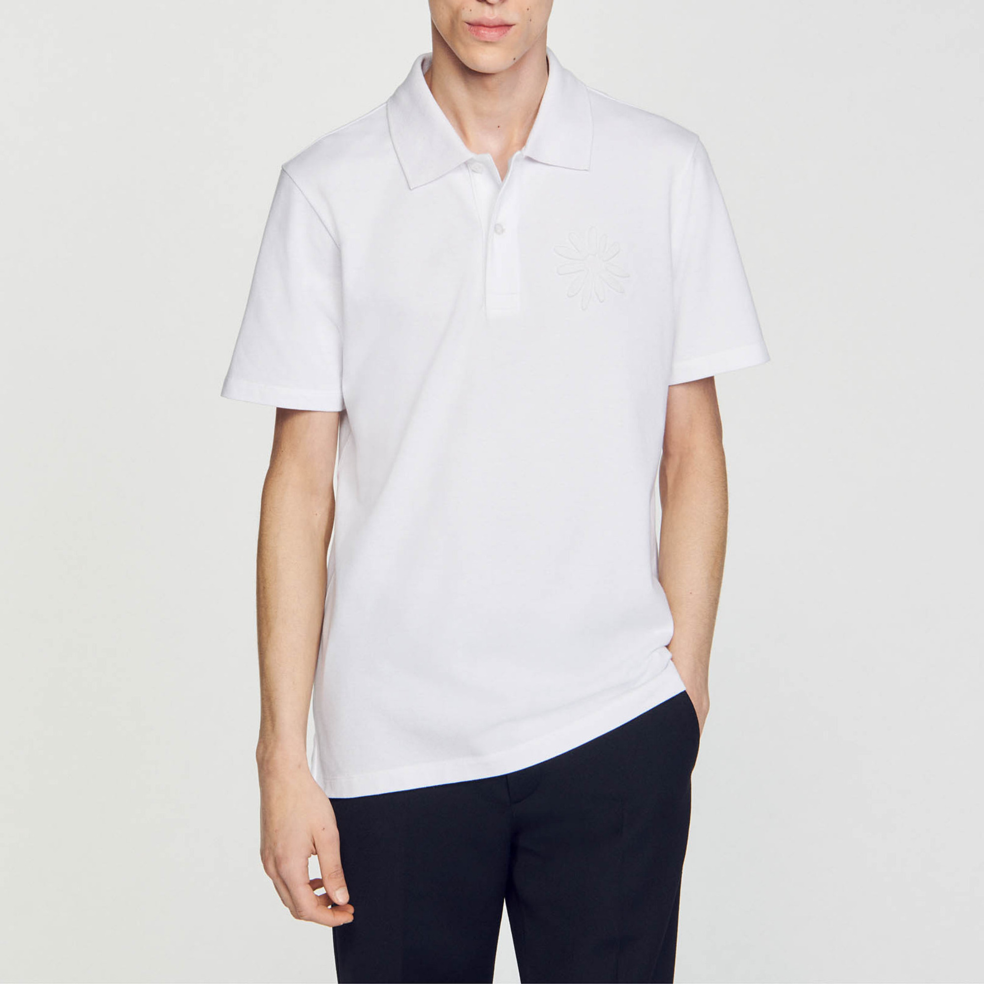 Sandro Men's cotton piqué polo shirt Flower appliqué Button-up polo neck Short sleeves Side slits.