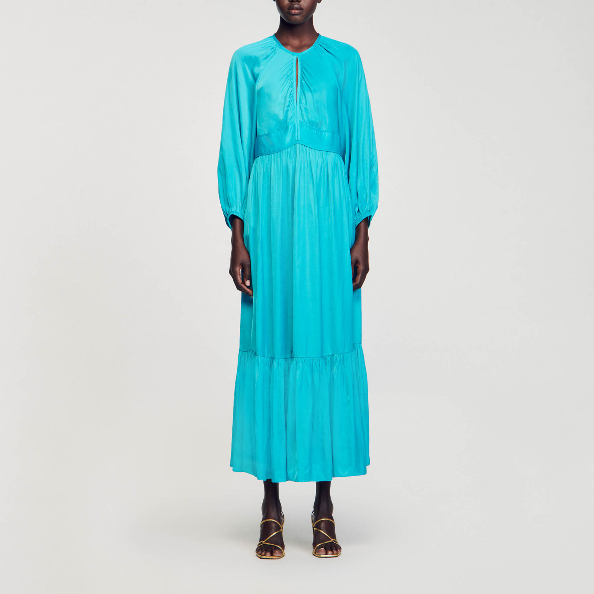 Sandro Women's satin-effect maxi dress Flared at the bottom for a foamy look Round neck Long sleeves with elasticated cuffs Inlaid waistband Long skirt with gathered pleated hemline.