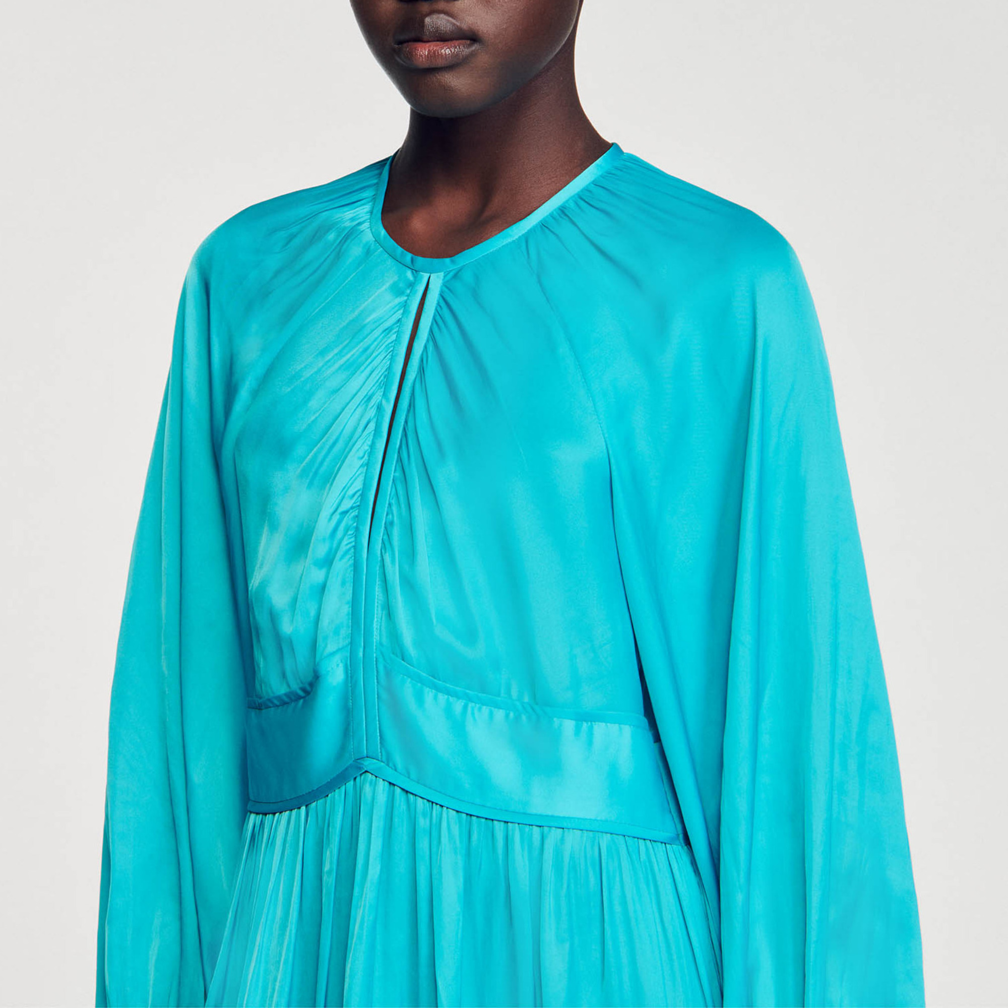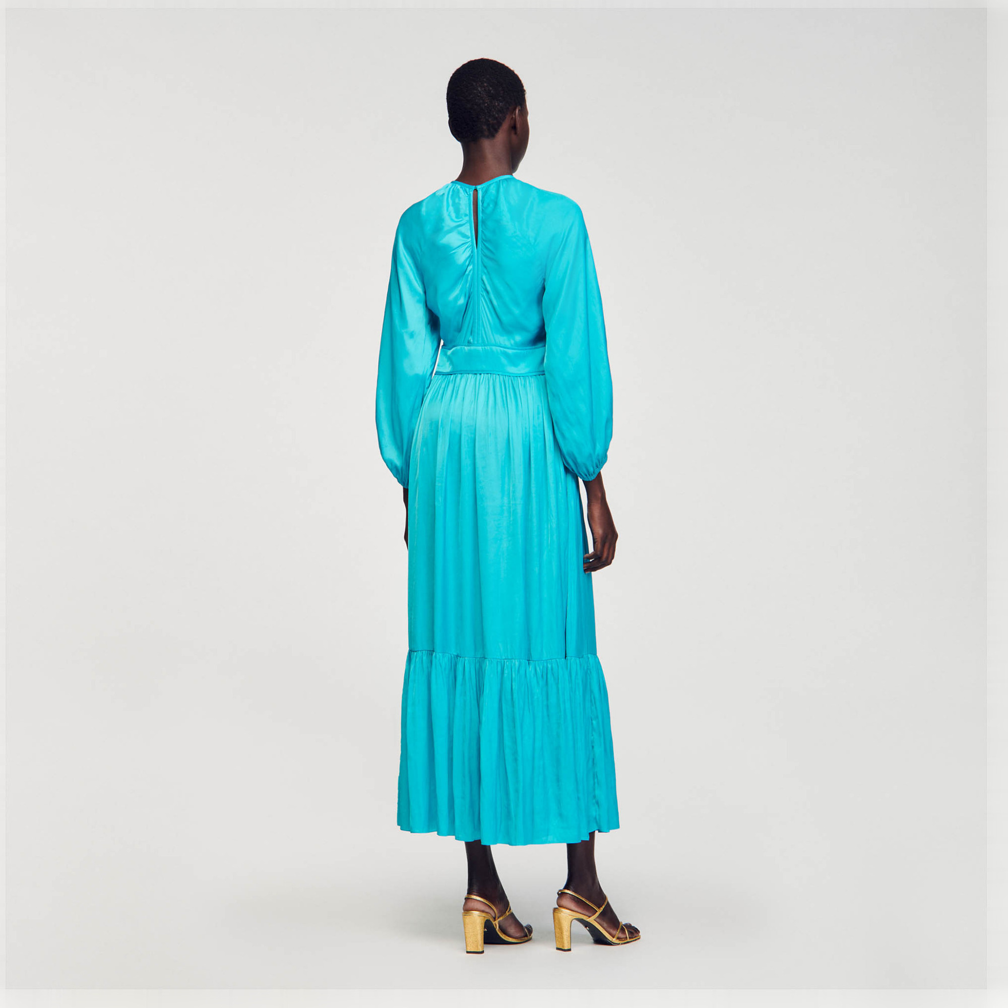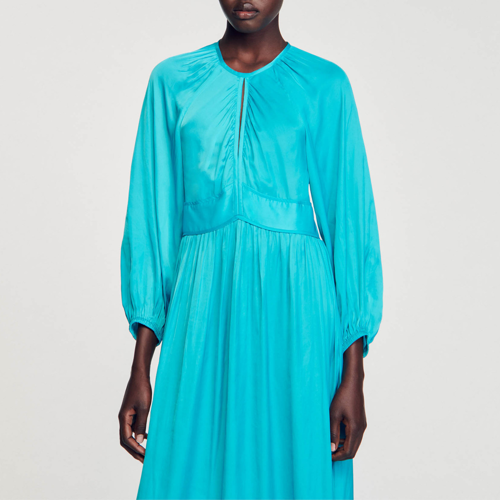 Sandro polyester Satin-effect maxi dress with a curved neckline, draped at the top and flared at the bottom, featuring long sleeves with elasticated cuffs, an accentuated waistline with a V-shaped inlaid waistband and a pleated hem.