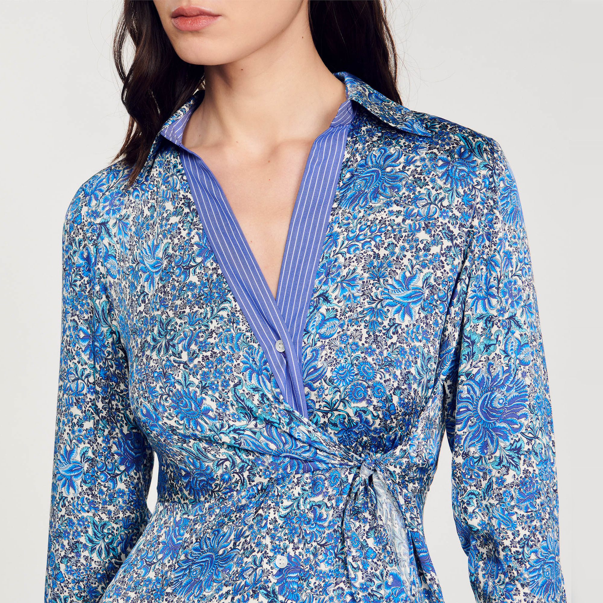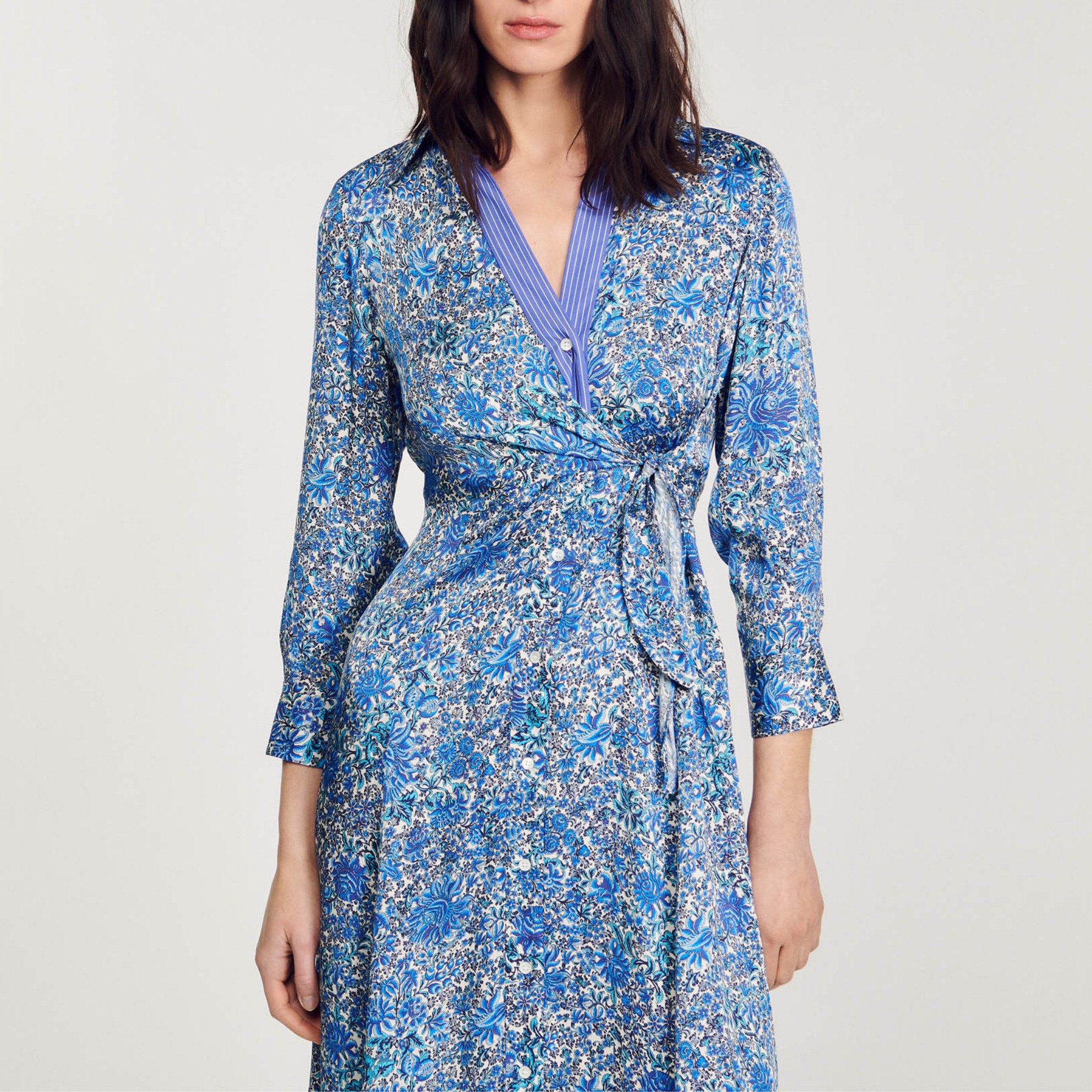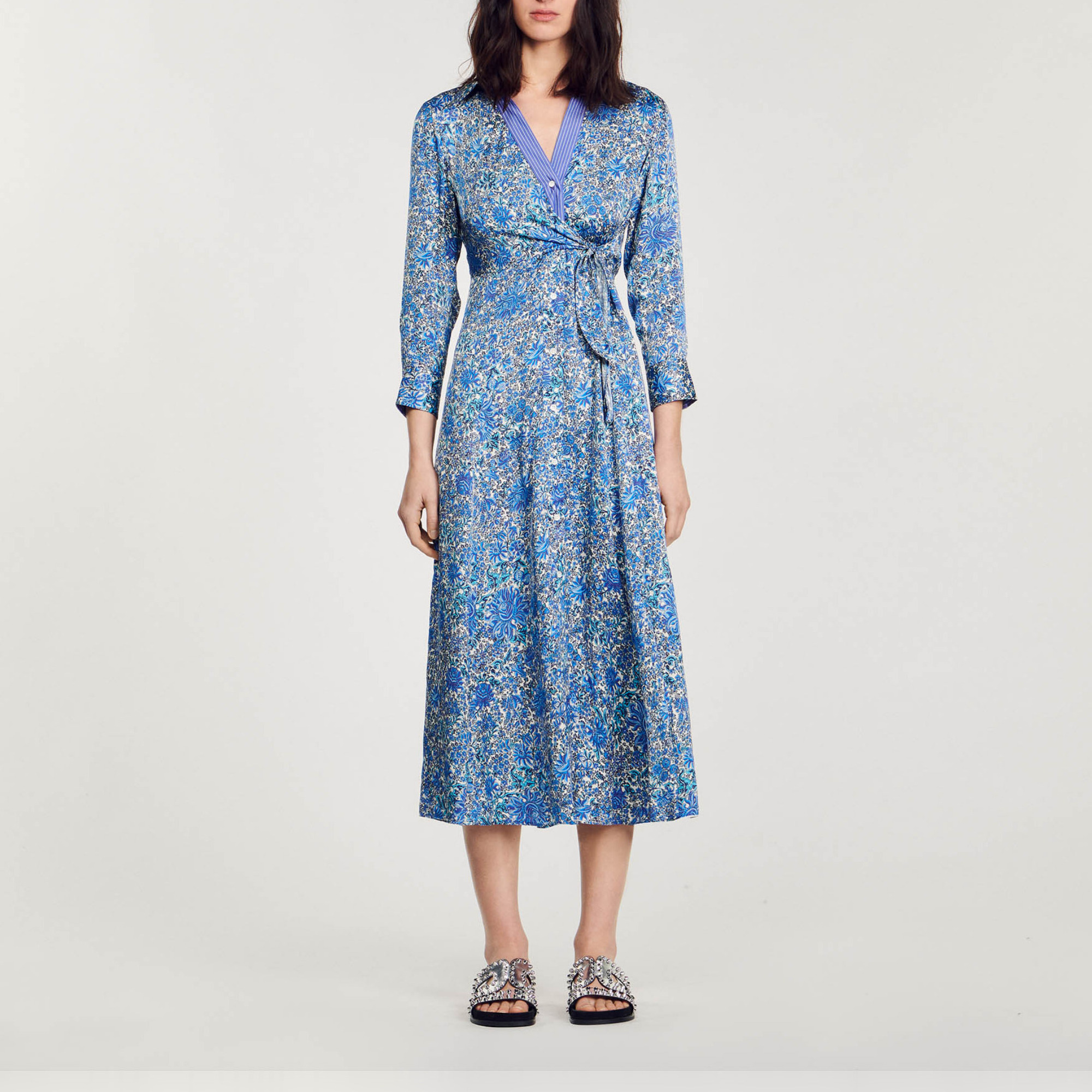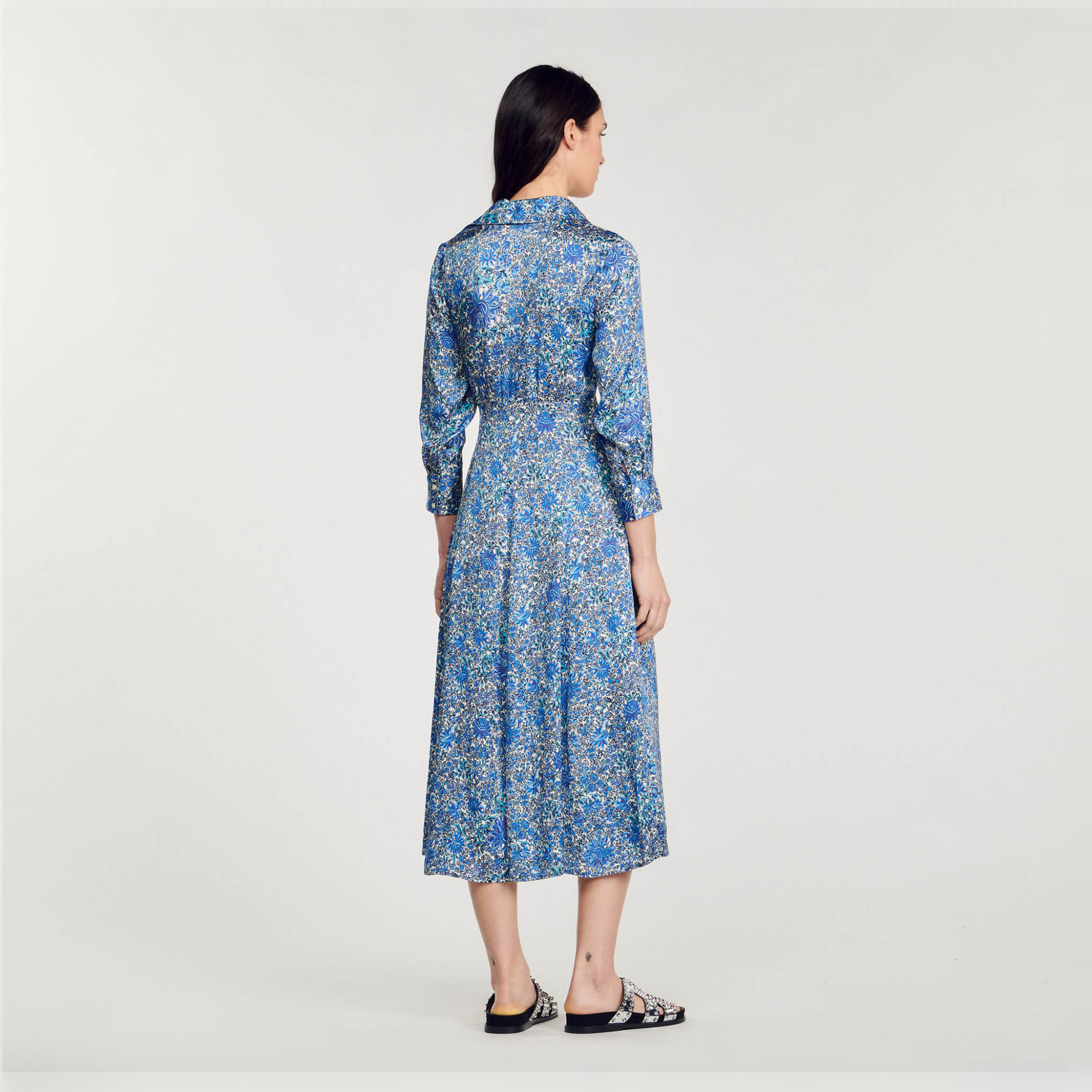 Sandro viscose Satin-effect midi shirt dress embellished with a floral pattern, featuring a shirt collar, long sleeves with buttoned cuffs and panels that tie at the side.
