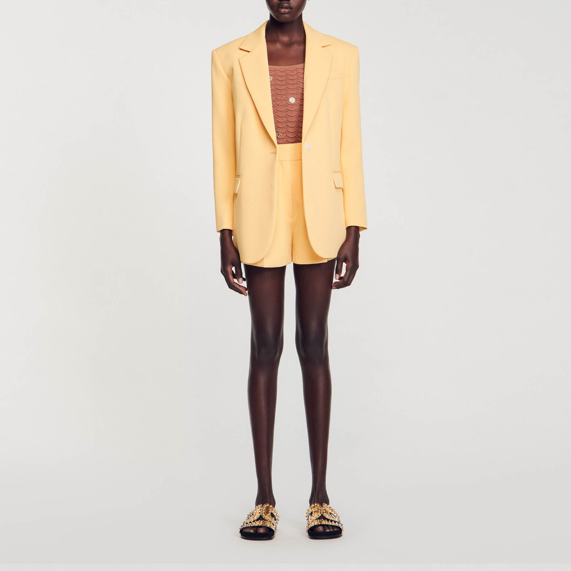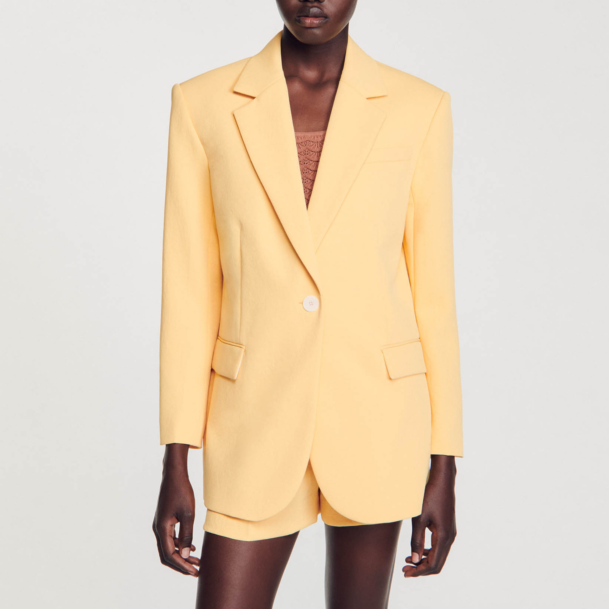 Sandro polyester A suit jacket with a lapel collar and curved hem, a button fastening, flap pockets and a welt pocket on the chest.
