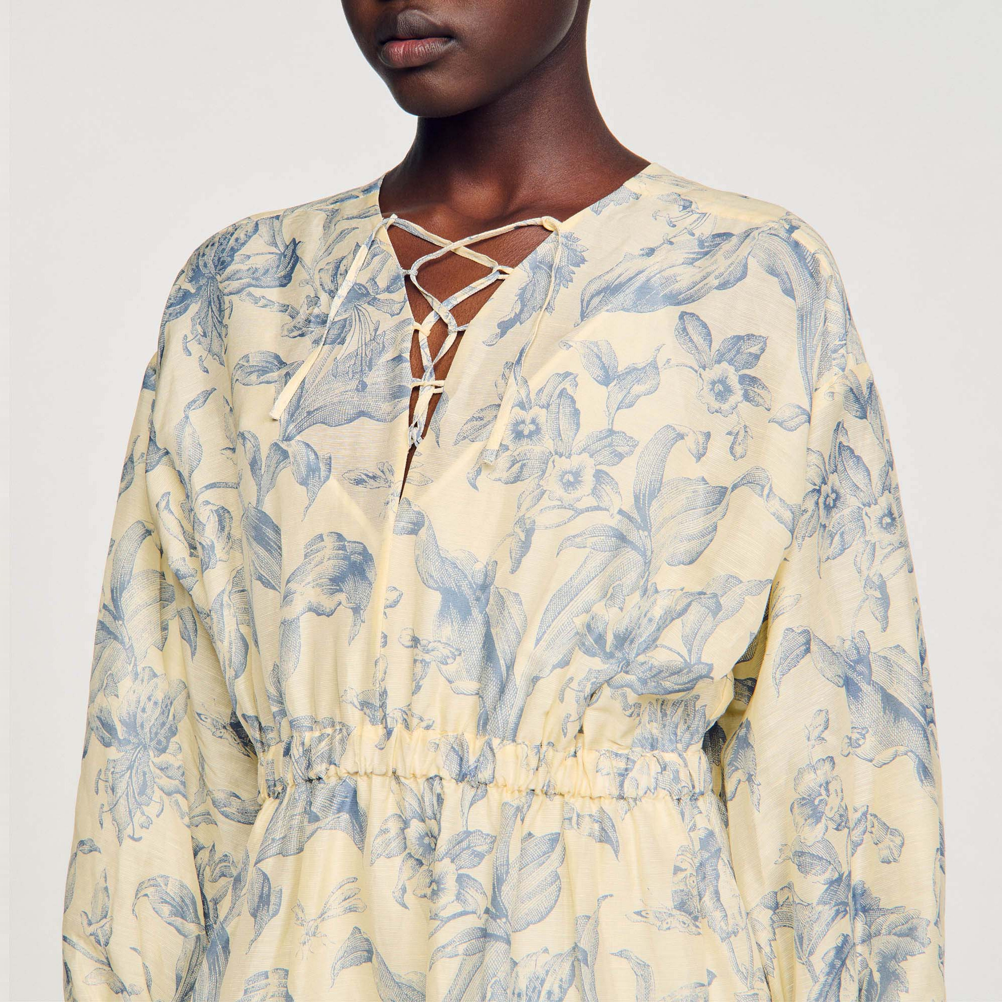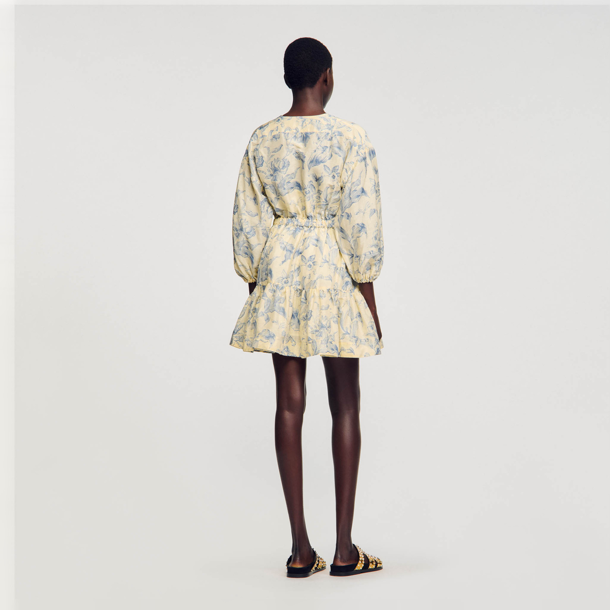 Sandro Women's short dress Soft Flowers print V-neck with crossover lacing Long sleeves with gathered cuffs Full skirt with flounce Snug fit top, accentuated waist and flared skirt.