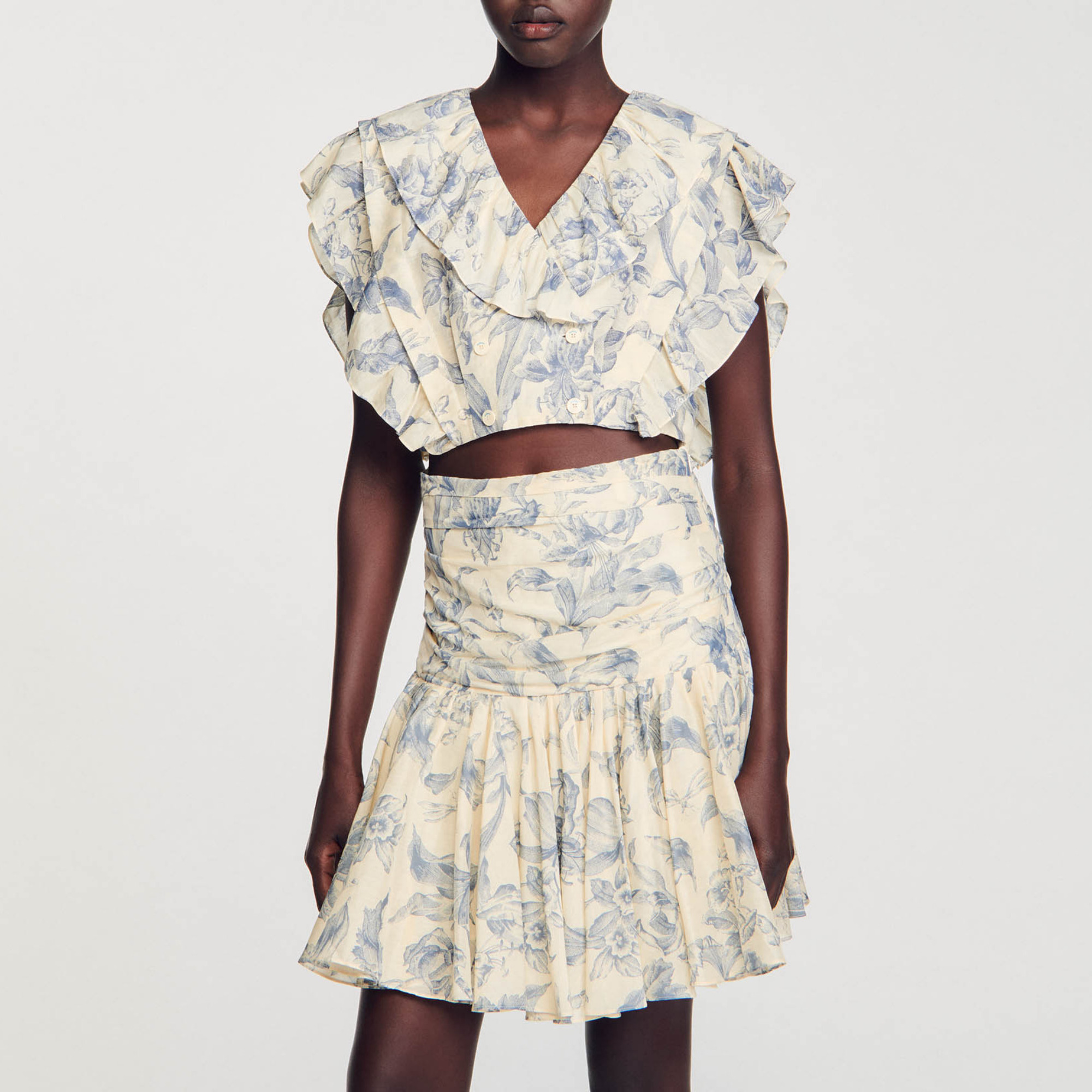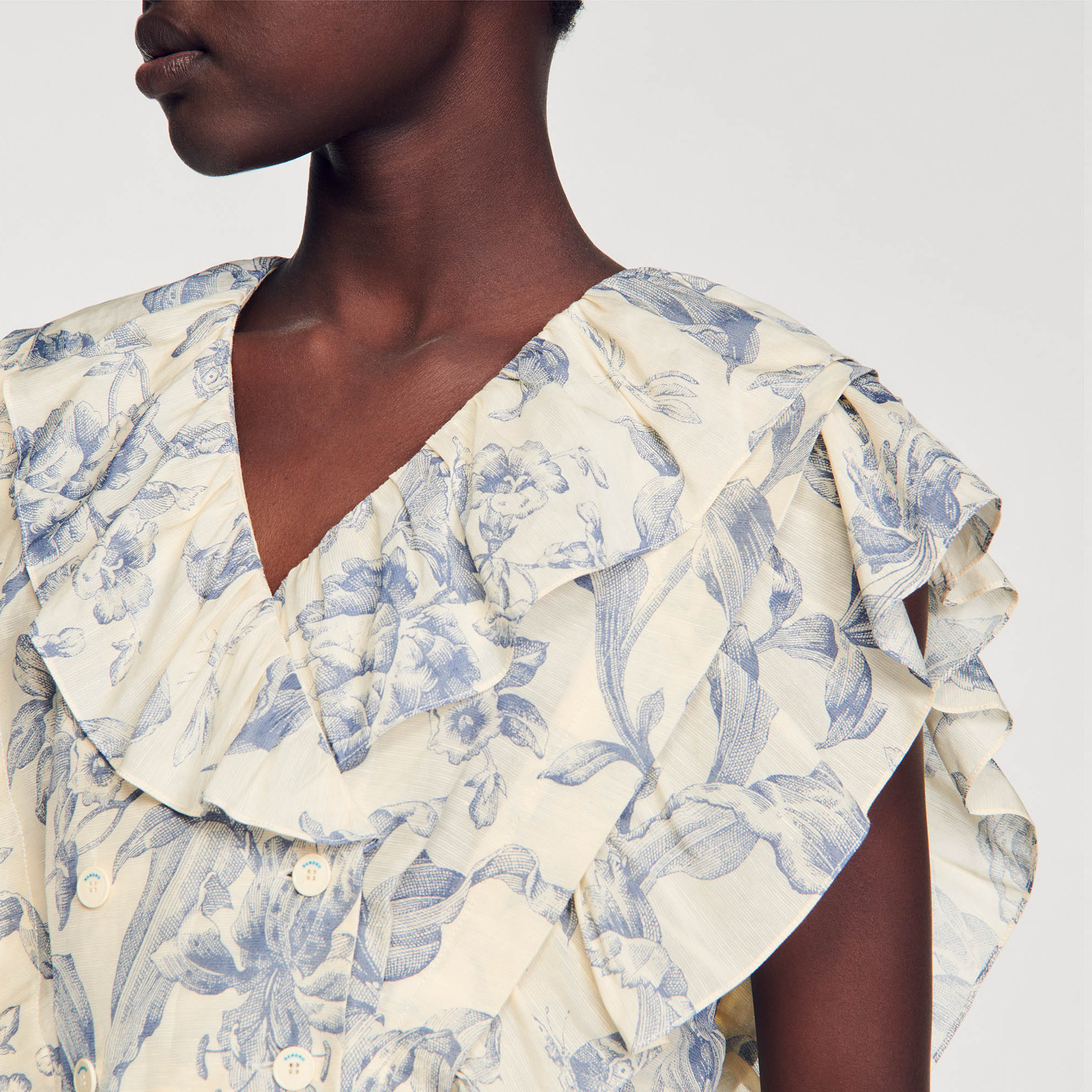 Sandro linen Sleeveless crop top with V-neckline and double button fastening embellished with ruffle details and a floral pattern.