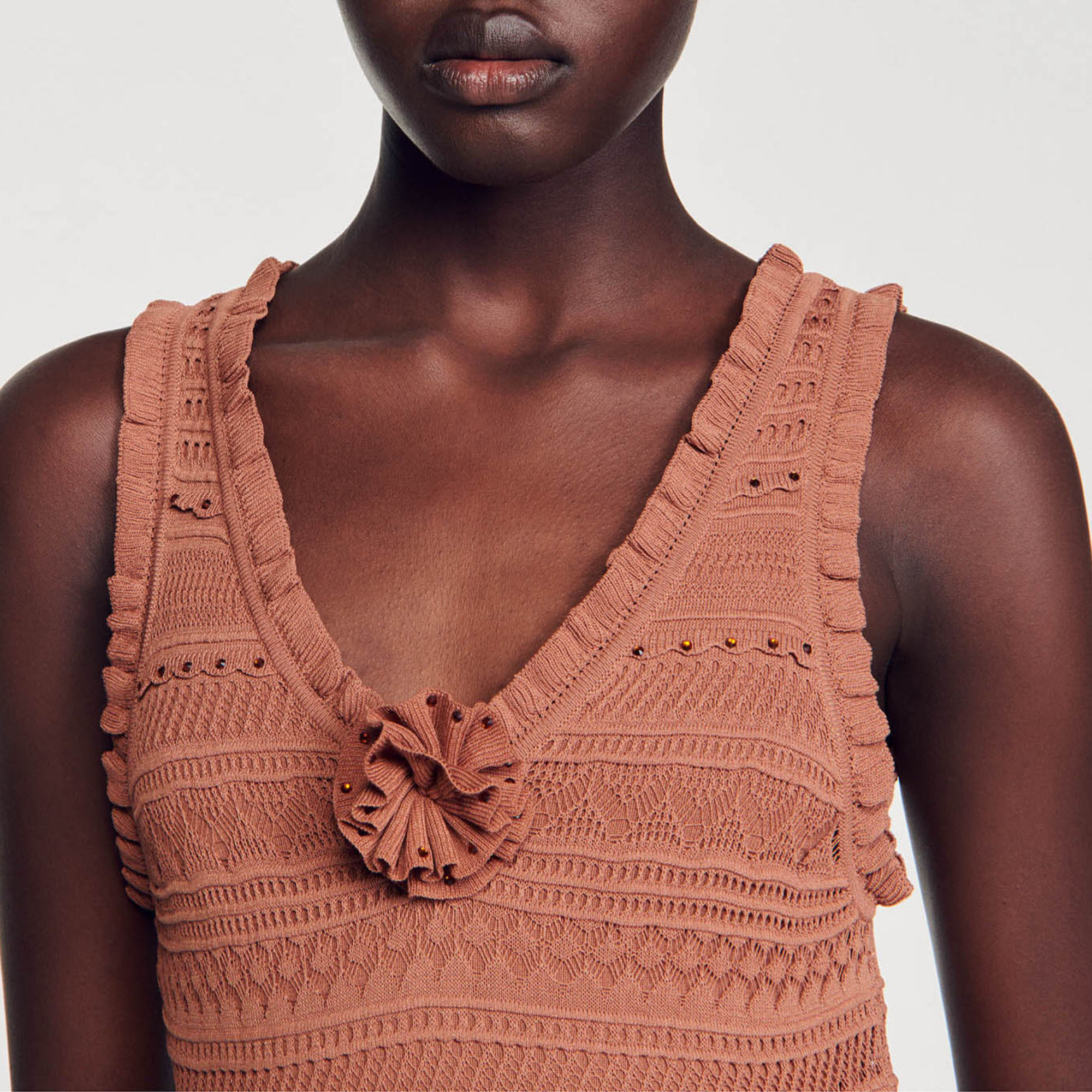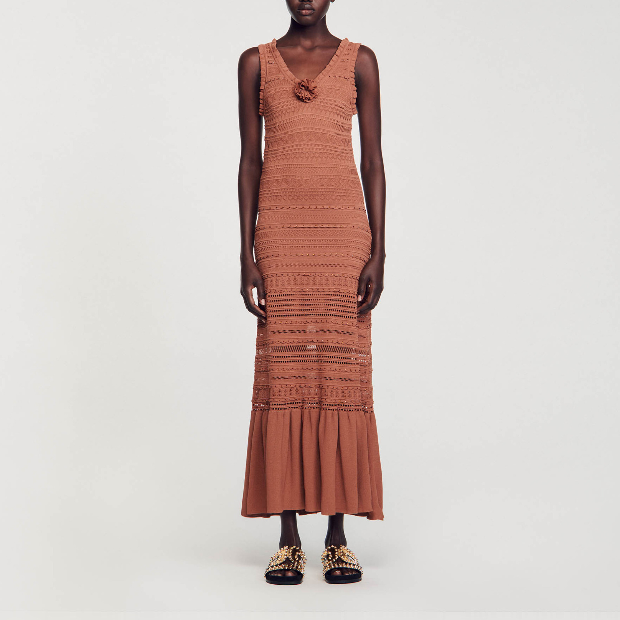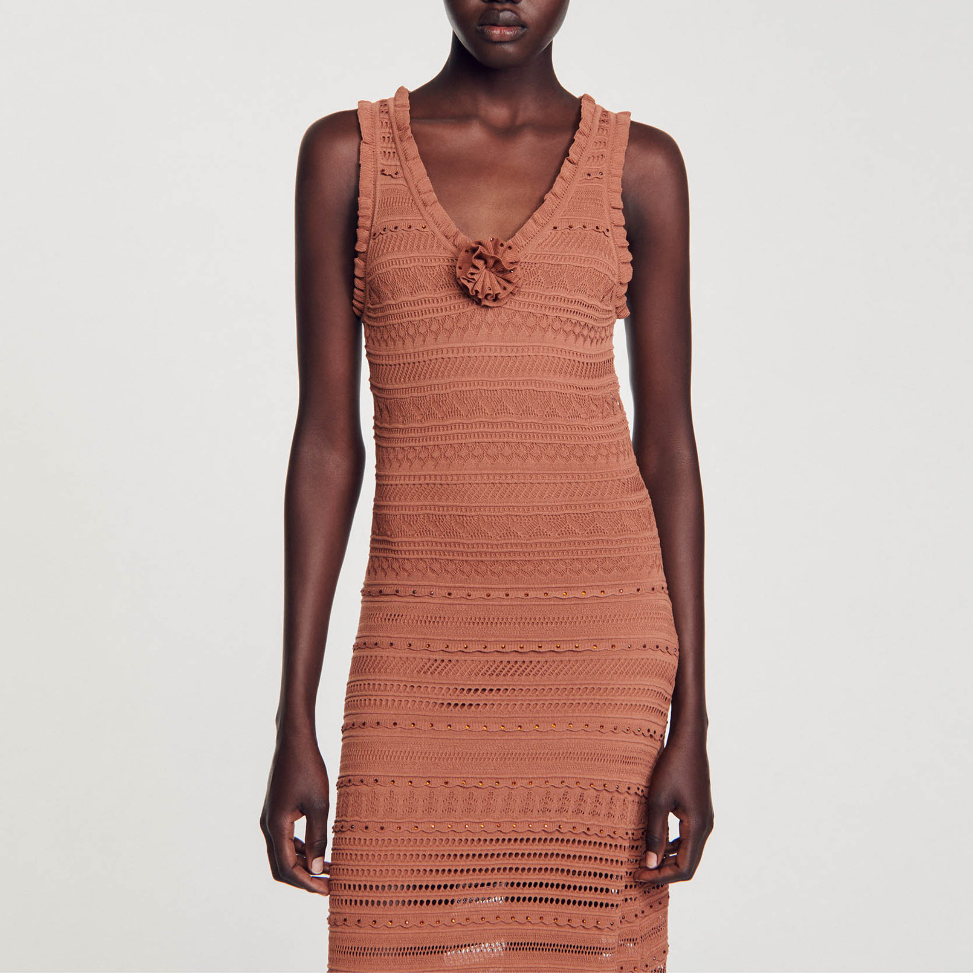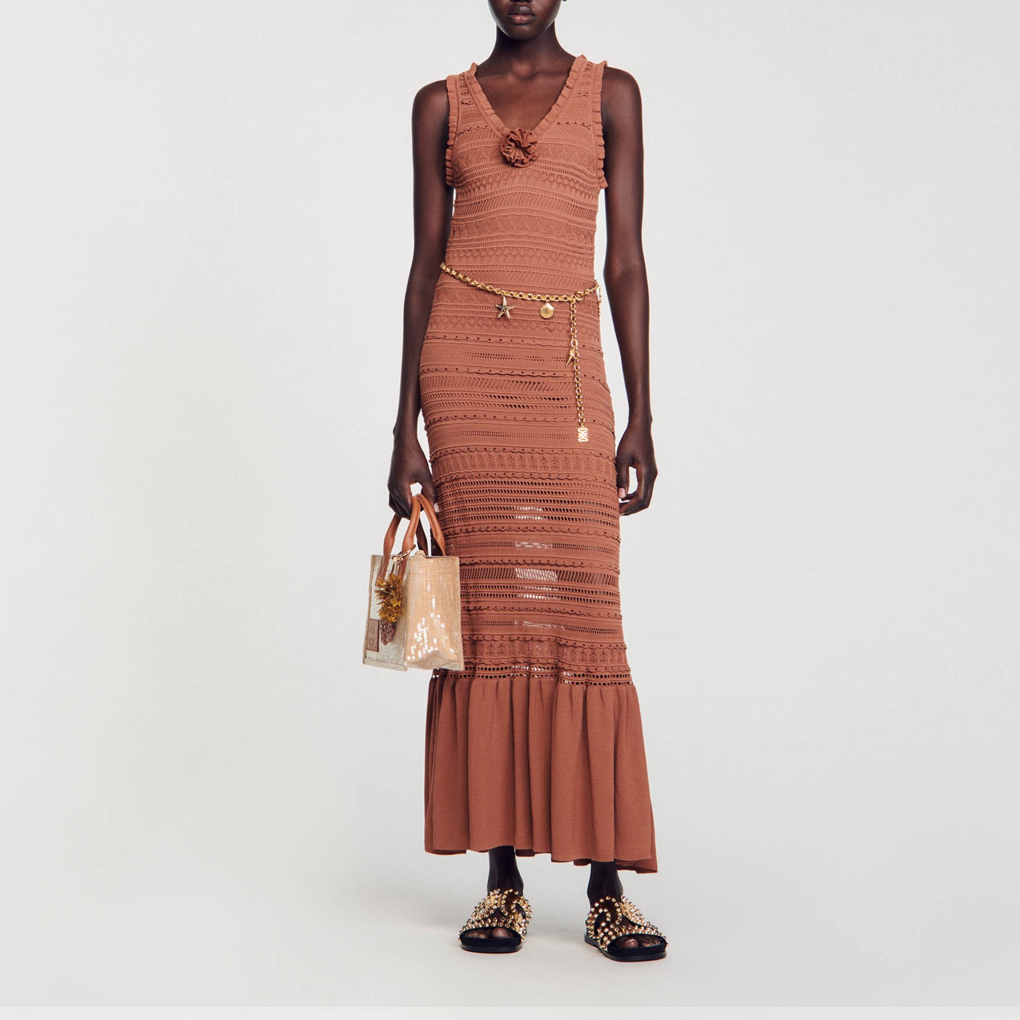 Sandro viscose Sleeveless maxi dress in decorative knit with tone-on-tone rhinestones, featuring a V-neckline with an appliqué flower and a ruffle at the bottom of the skirt.