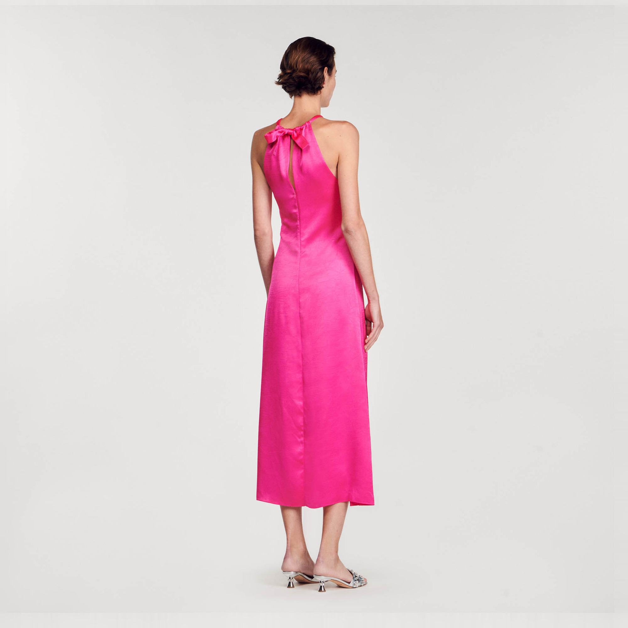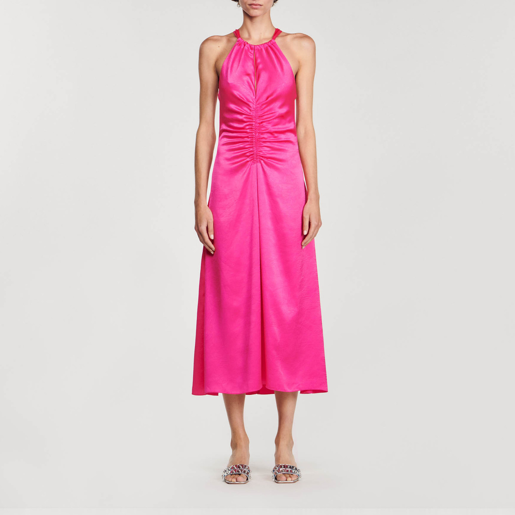 Sandro Women's satin-effect maxi dress Fit and flare style Round neck with sliding tie and teardrop opening Ruched front effect Zip fastening at back.