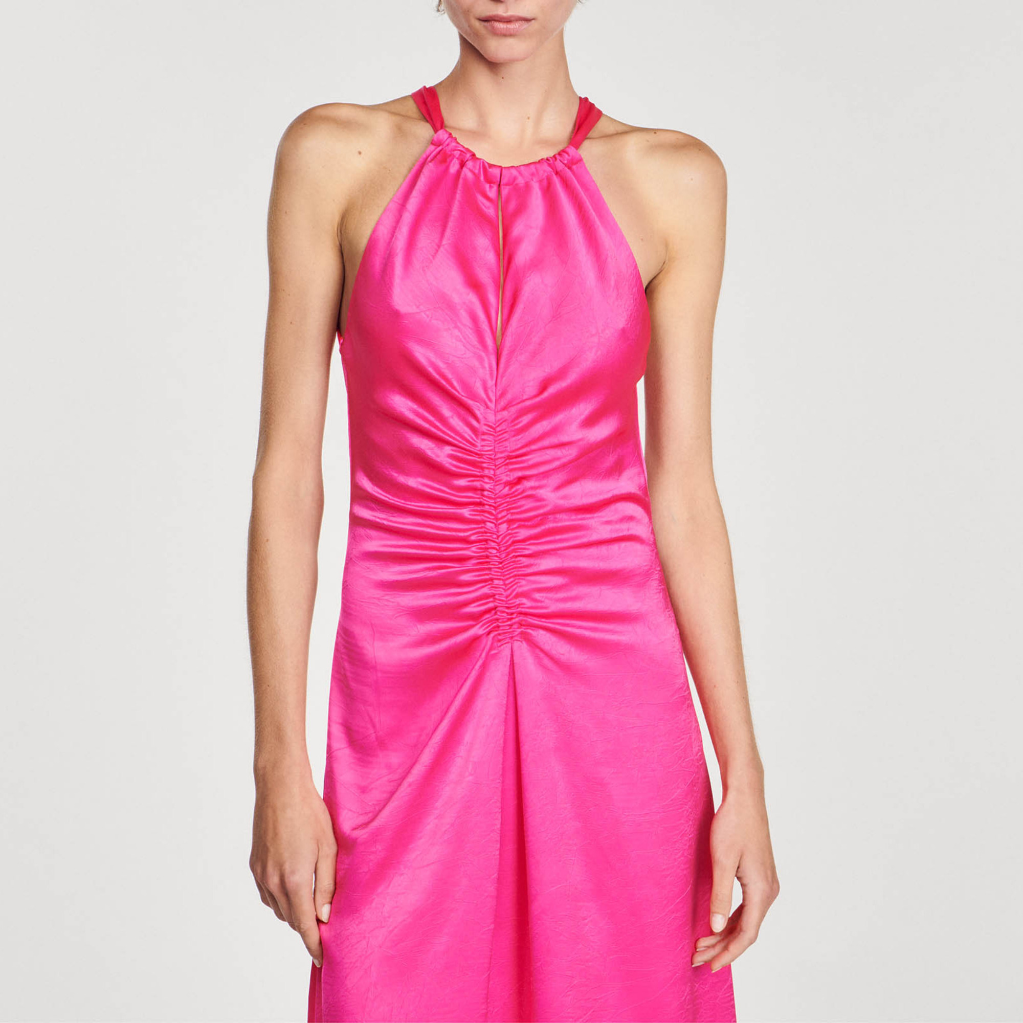 Sandro polyester Satin-effect maxi dress, a split neckline with a sliding tie, and ruching on the front.