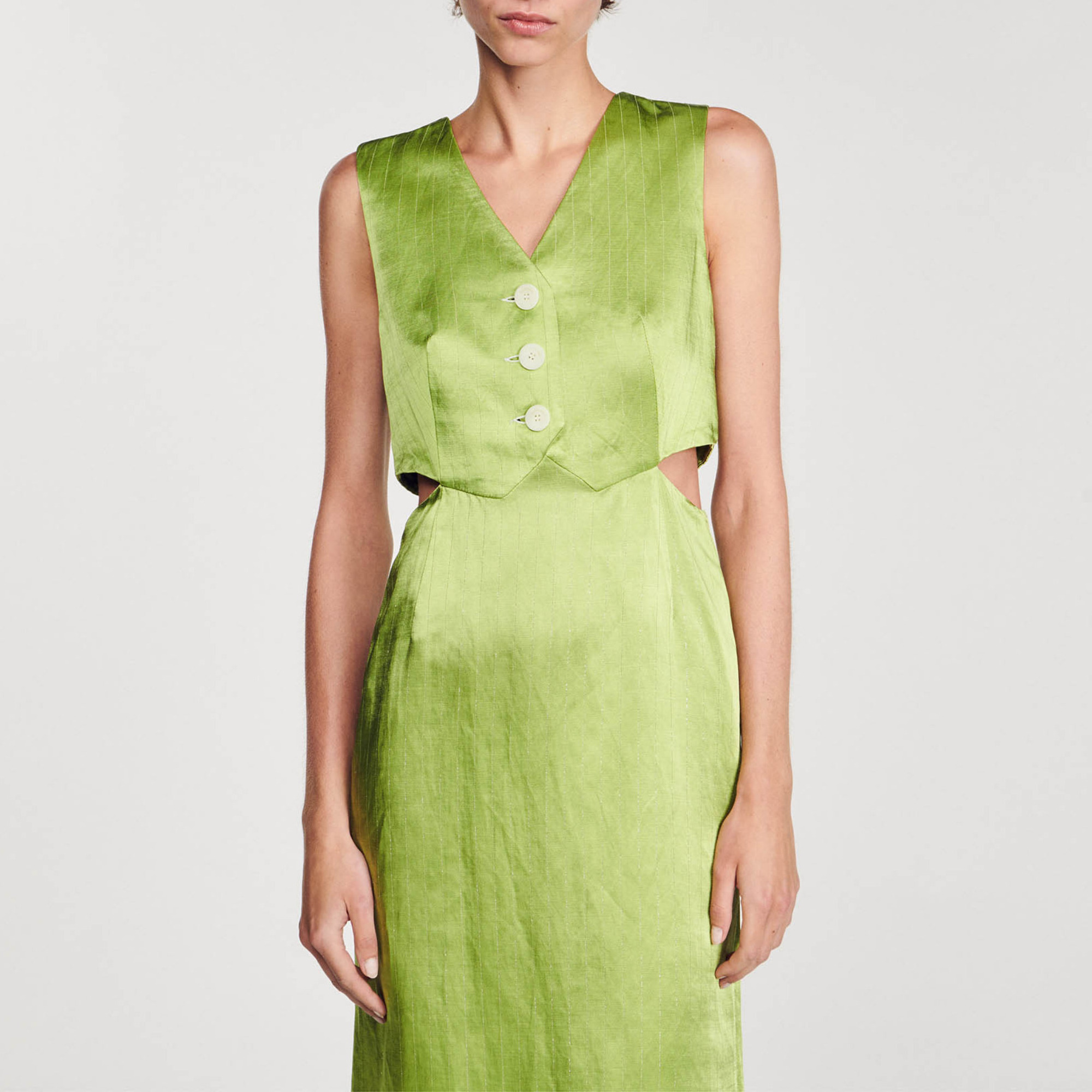 Sandro Women's striped midi dress Jacket-style top V-neck with buttons Sleeveless Cutaway sides Straight-fit midi skirt.